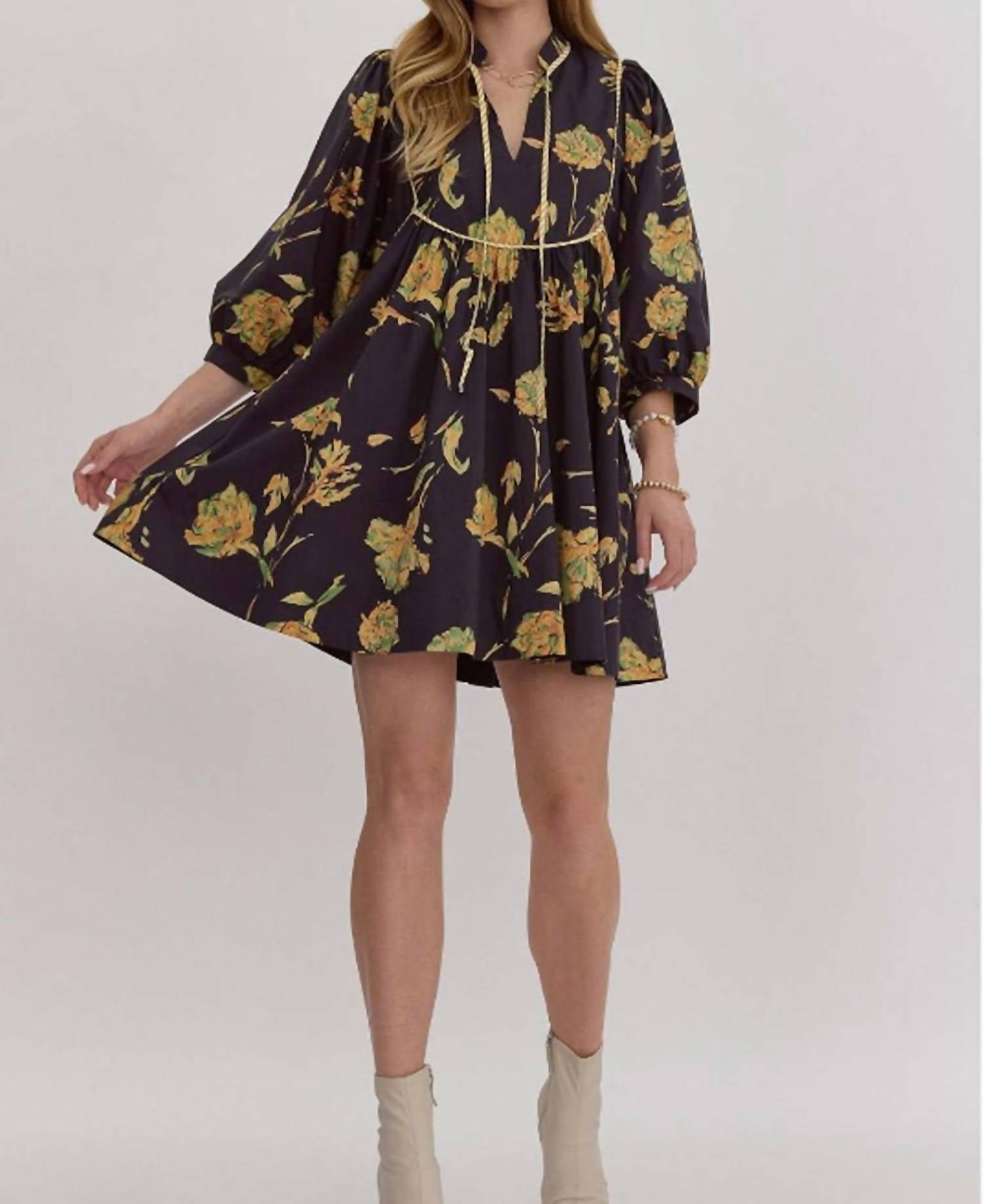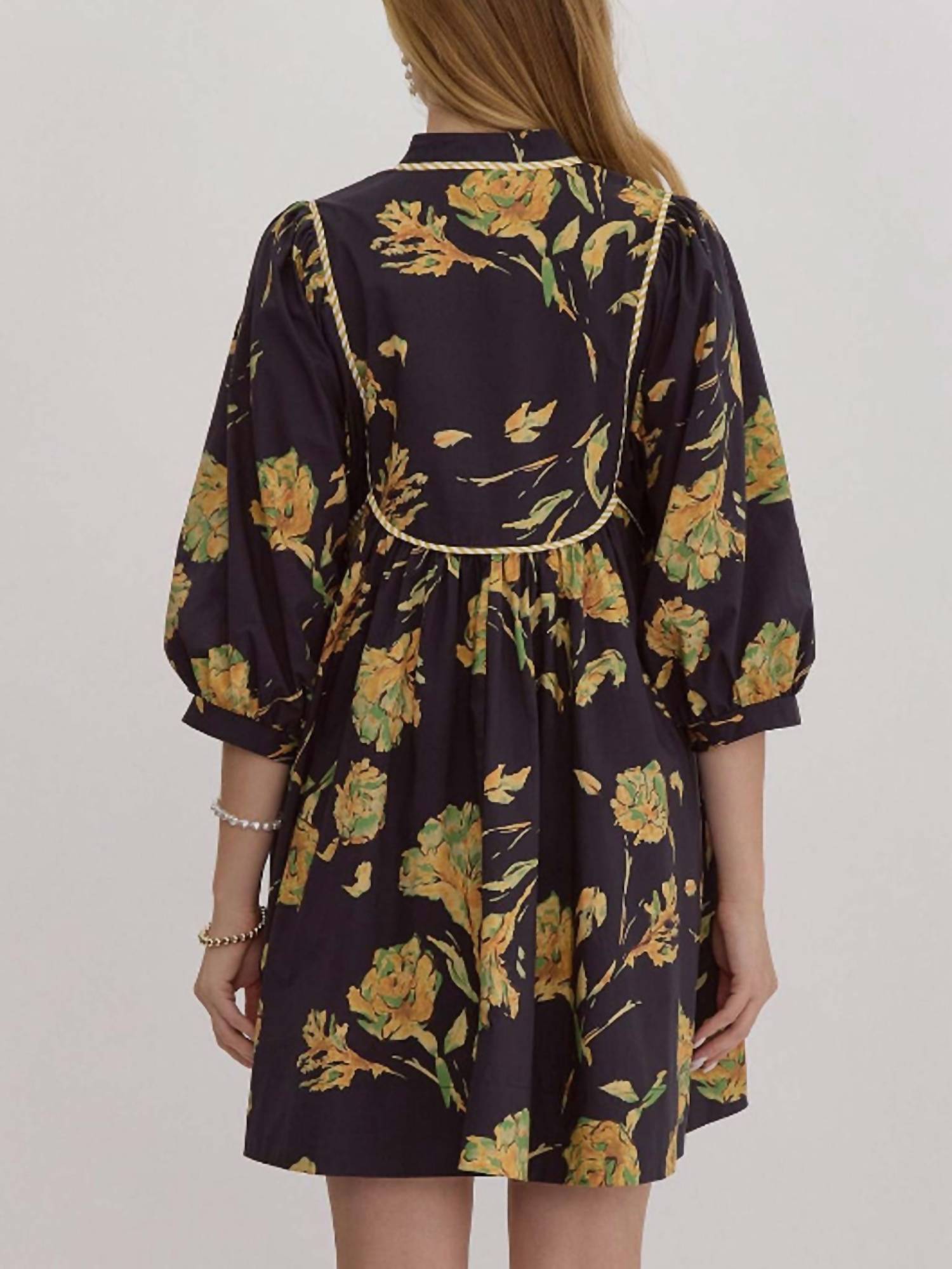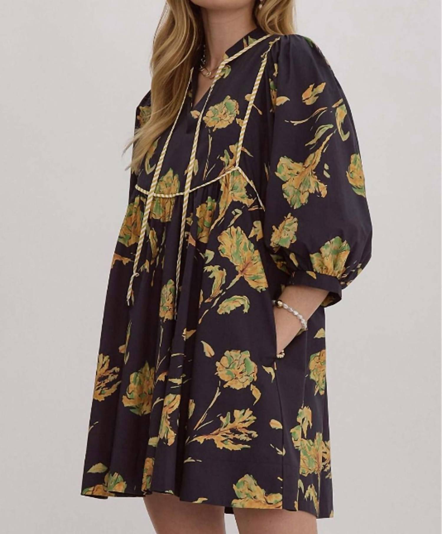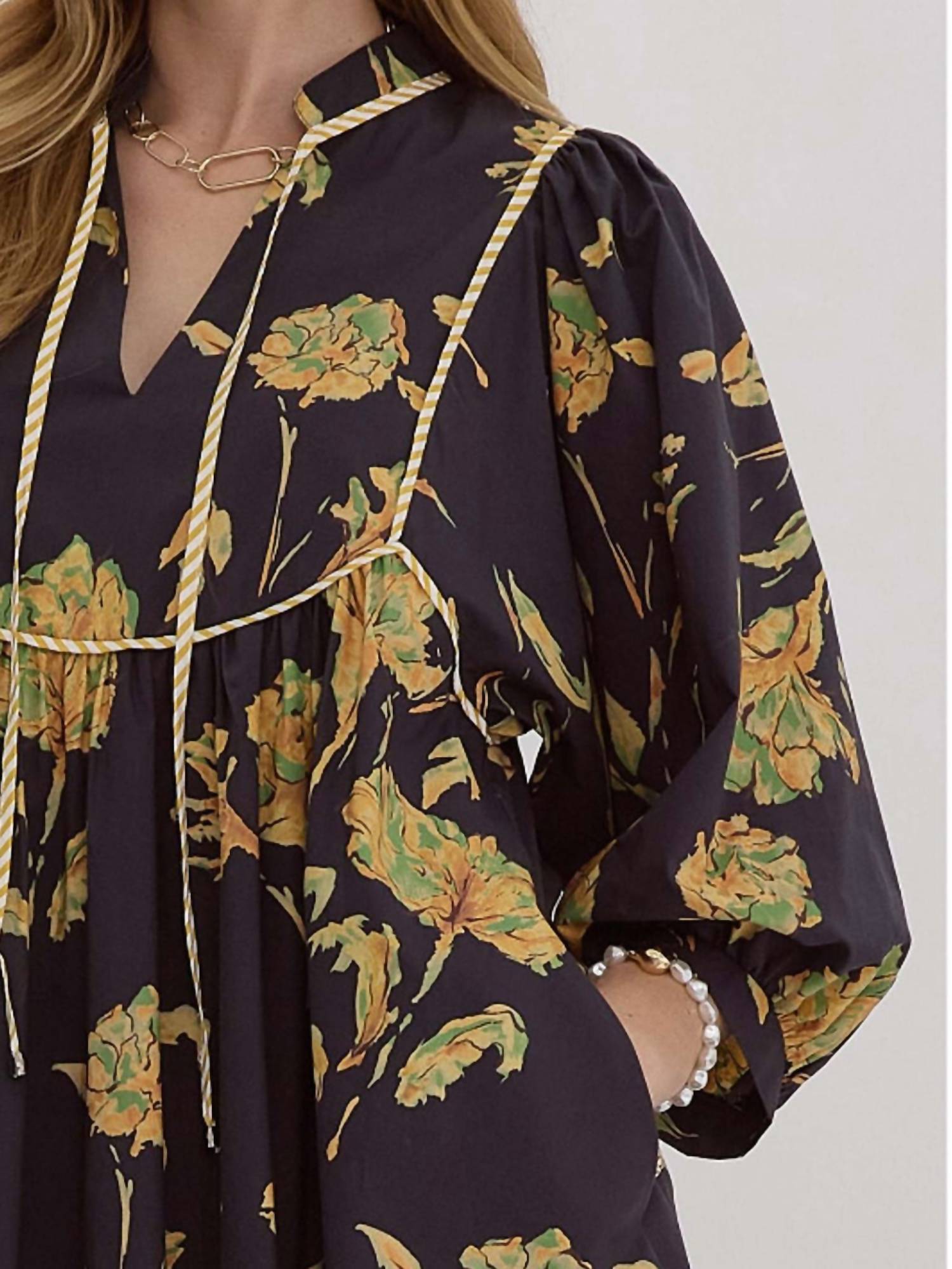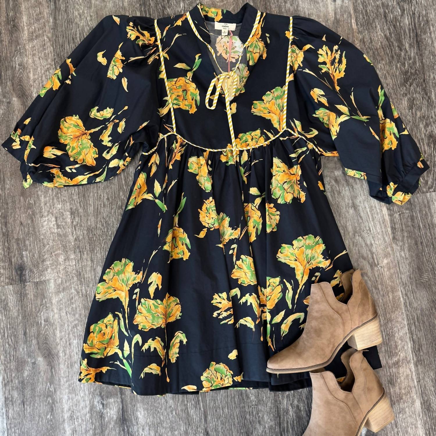 The perfect mini dress for those warmer months. Introducing the Flirty Floral Mini Dress by Entro, a captivating addition to your wardrobe. This dress boasts three-quarter puff sleeves and is crafted from 100% cotton, offering softness and breathability for all-day wear. It features a charming v-neckline with a self-tie front, and practical side pockets add functionality. Available in a chic black floral print, this lightweight dress is fully lined and designed with a pull-on closure.