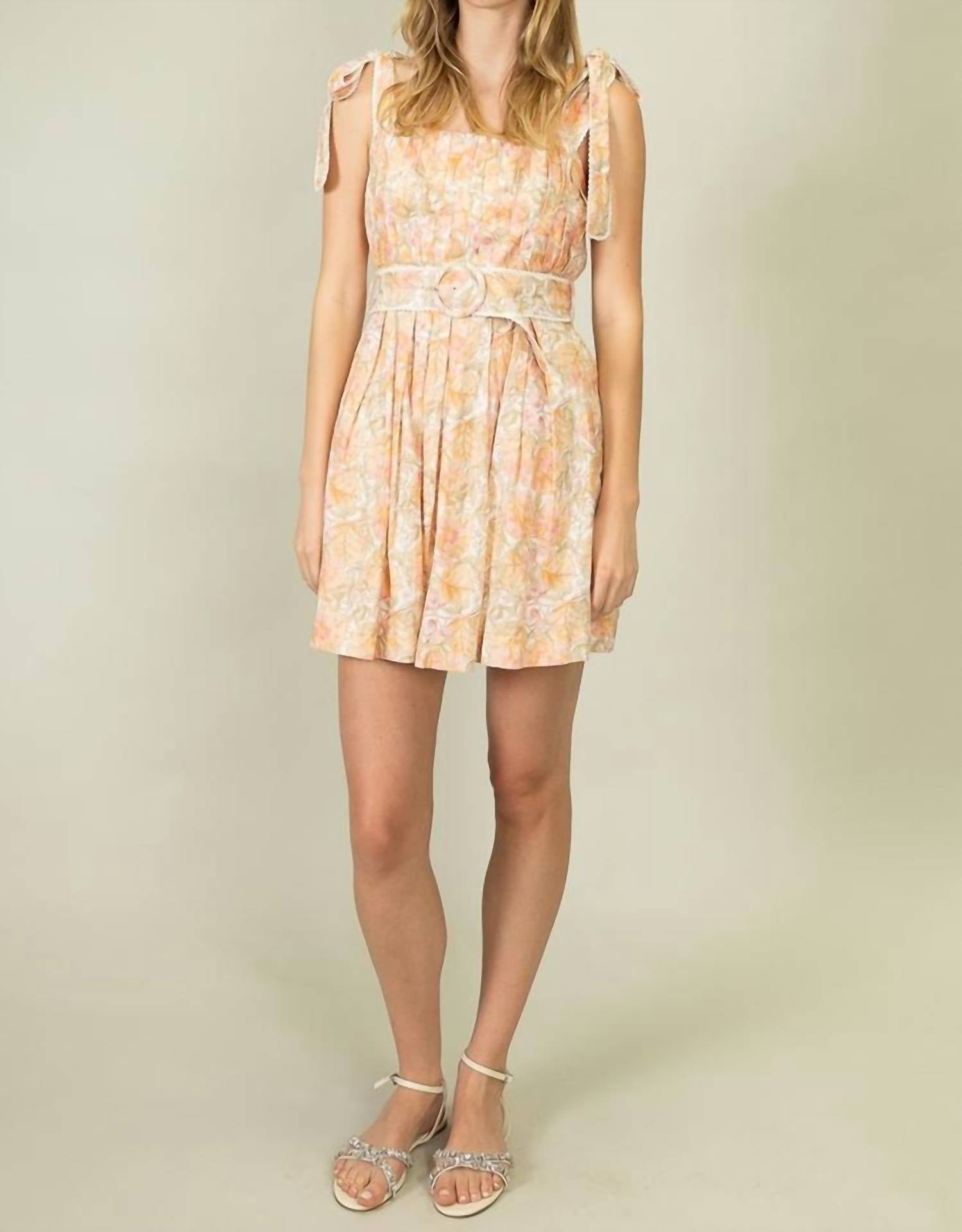 Heyson - Linen Print Crochet Trim and Pleated Belt Mini Dress