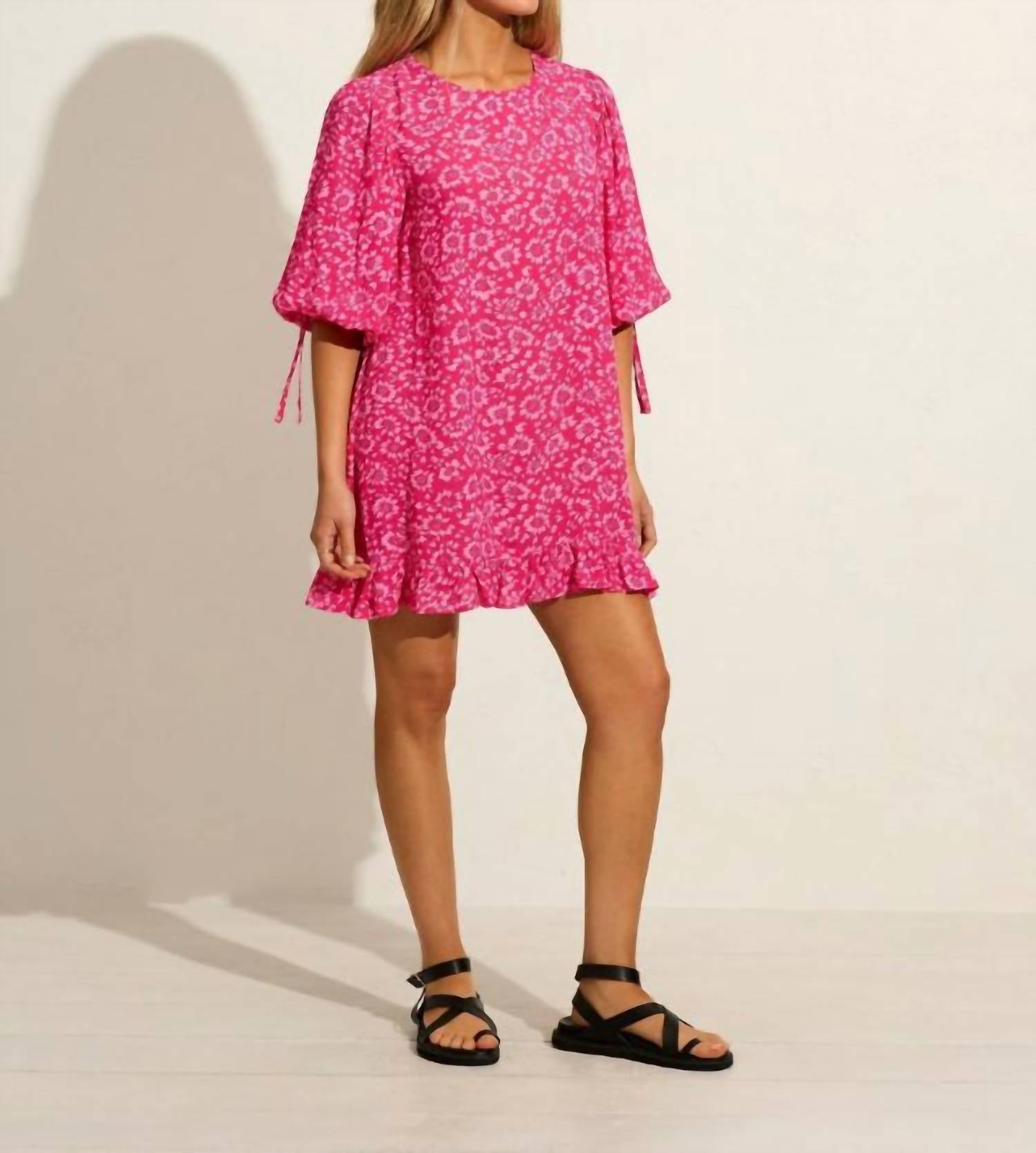The kind of easy and flattering dress you'll be reaching for all season long. Brighten up your wardrobe with the Lila Mini Dress by Auguste the Label, crafted in vibrant fuchsia with a playful floral pattern. This fun and flirty piece boasts three-quarter blouson sleeves featuring a charming ruffle and tie detail, complemented by a shift silhouette and ruffle hem. Made from 100% viscose, it features a button closure at the back neck. For care, hand wash separately in cold water, avoid soaking or bleaching, and lay flat to dry in the shade, then cool iron or steam.