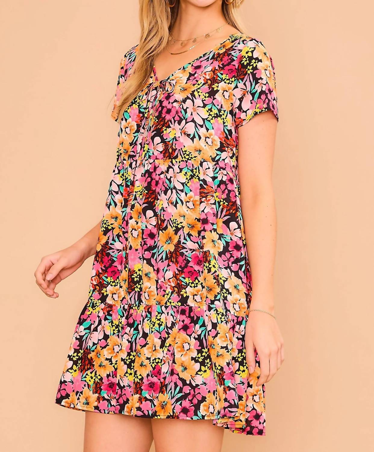 Cozy Co. - Floral Short Sleeve Tiered Dress