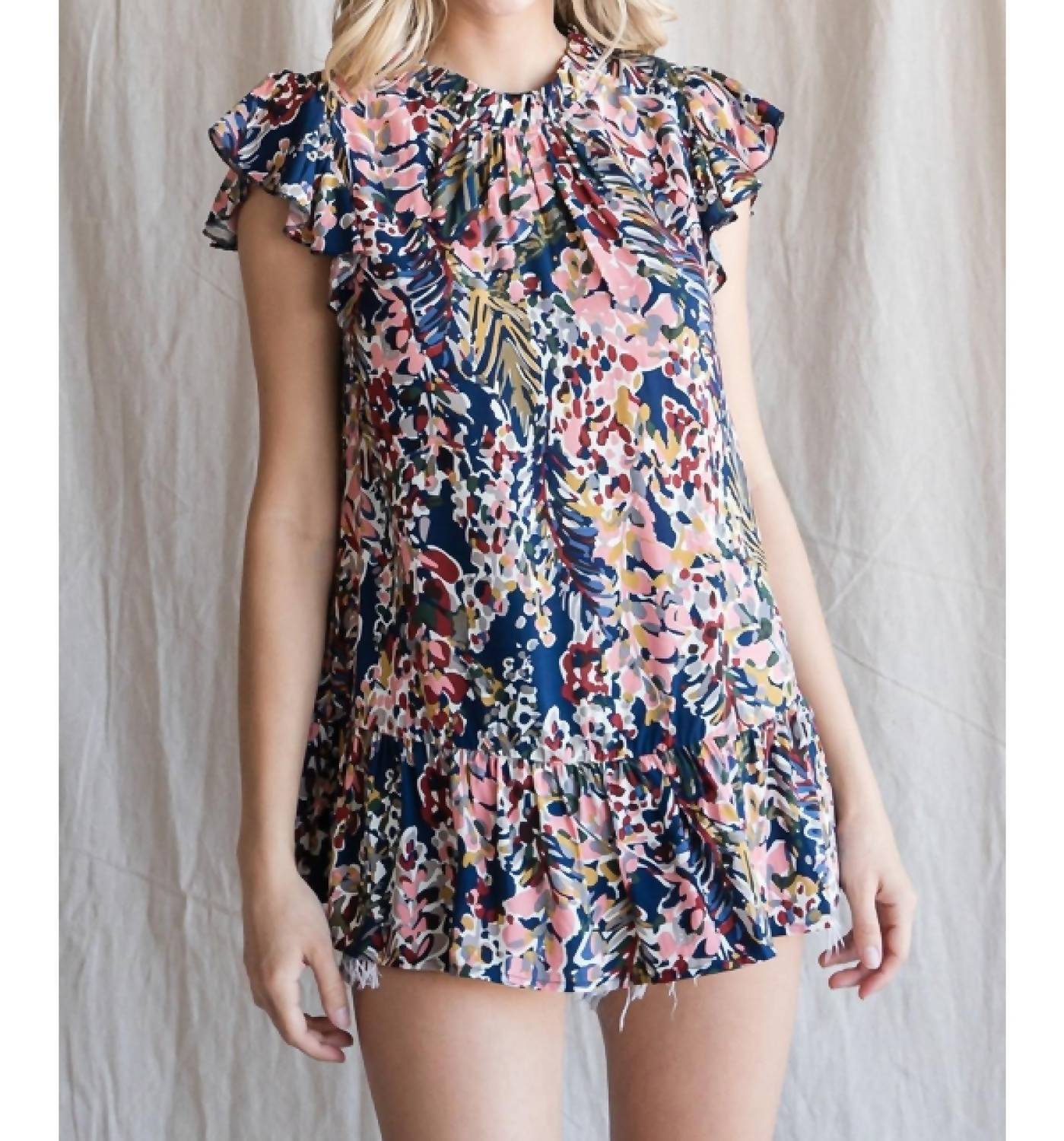A short and breezy dress for those warmer days. Must-have in a chic Navy Peach Combo perfect for this season. Designed with cap ruffle sleeves and a keyhole button closure at the back. Features intricate ruffle detailing around the neck and hem, creating an effortlessly elegant look. Made from 100% Rayon with a garment length of 26 inches. Offers no stretch for a polished fit suitable for a holiday party occasion. Care for this beautiful boho chic piece by hand washing it in cold water to keep it vibrant and stylish for your Spring outings.