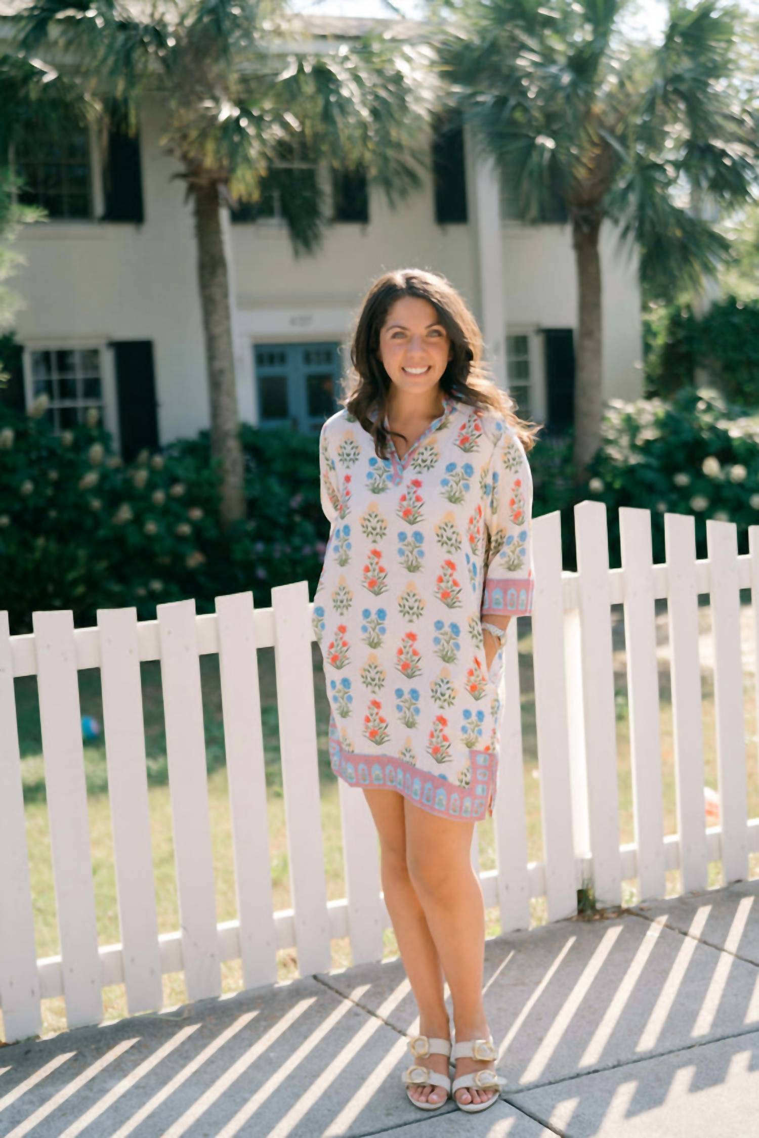 The perfect mini dress for those warmer months. Experience the Savannah Flourish Dress by Marigold, a delightful piece that merges comfort and elegance with its three-quarter length bell sleeves. Handcrafted in India, this mini dress showcases a breathable 100% cotton gauze construction and features a charming V-neckline with side slits. Its pull-on closure and floral pattern make it an ideal choice for a boho chic look, perfect for vacation settings. Care instructions recommend hand washing to maintain its delicate quality.