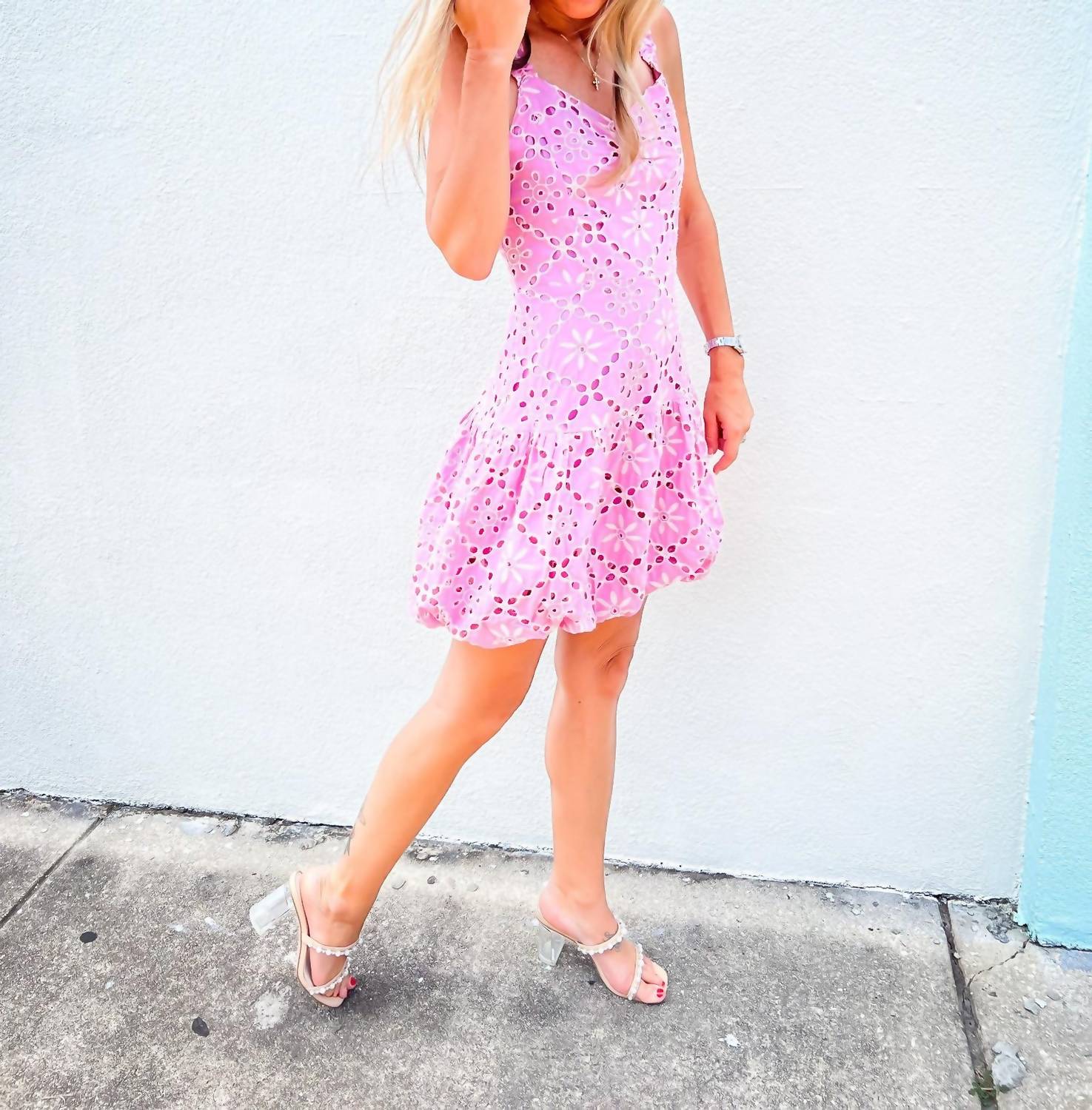 The kind of easy and flattering dress you'll be reaching for all season long. Discover the Sweet Magnolia Eyelet Mini Dress by Fate, a pink floral beauty perfect for summer outings. This sleeveless dress, crafted from 100% Cotton with a lining of 100% Polyester, features a charming ruched v-neckline, ruffle straps, and a flirty bubble hem with a scalloped edge. Designed without closure, it offers seamless wear with a pull-on style. For care, simply machine wash and lay flat to dry, ensuring your dress remains as beautiful as the day you wore it first.