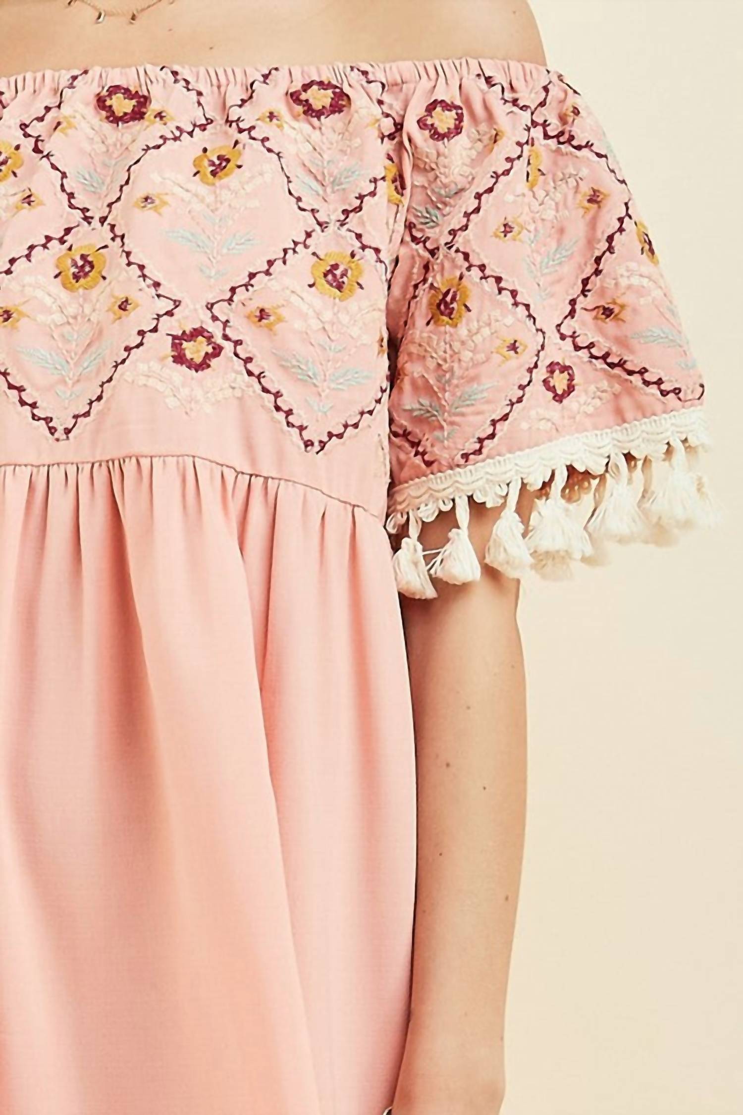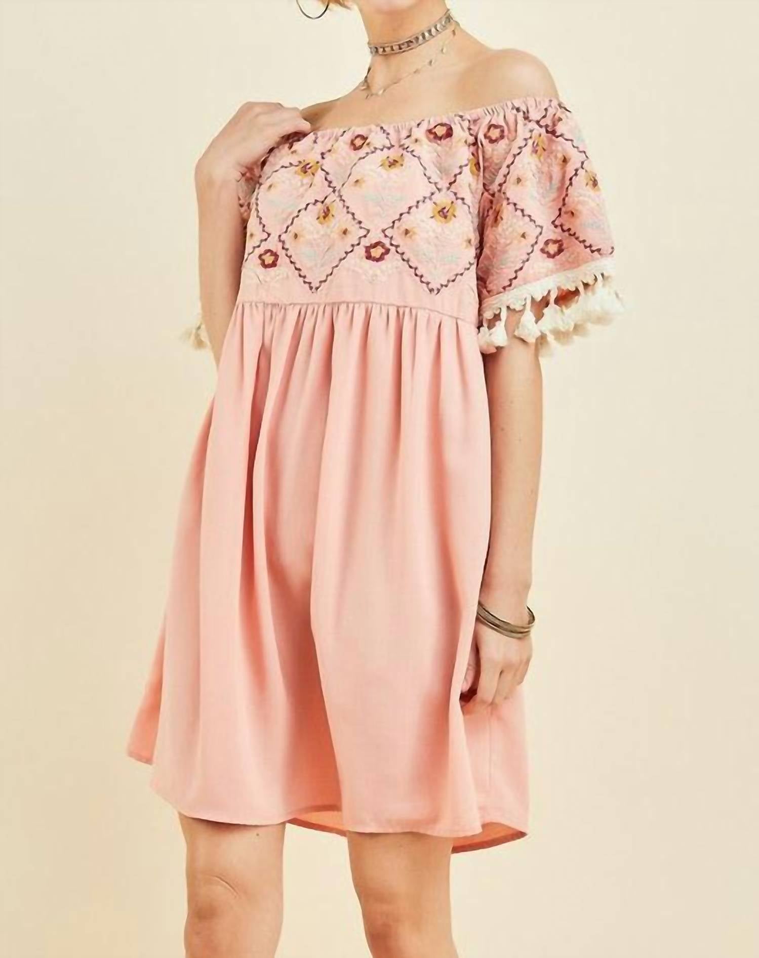 The kind of easy and flattering dress you'll be reaching for all season long. Embrace effortless elegance with the Wildflower Off The Shoulder Dress by Entro, featuring short sleeves and a chic off-the-shoulder neckline. The vibrant floral embroidery blooms across the chest and sleeves, enhancing its playful, feminine charm. As a shift mini dress, it offers a relaxed silhouette trimmed with tassels. Closure: Pull on. Perfect for showcasing a free-spirited style with ease.