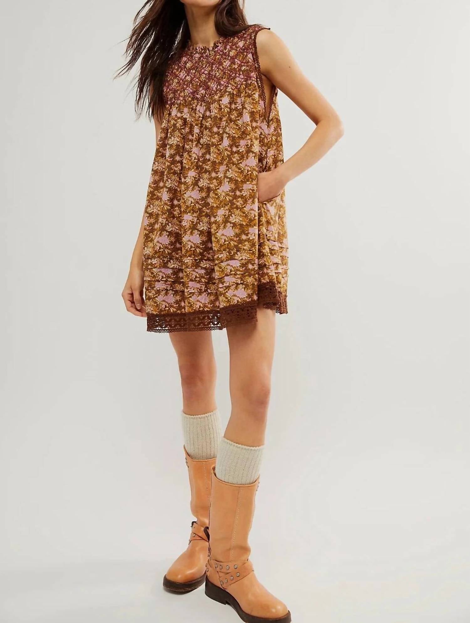 A short and breezy dress for those warmer days. The Shea Printed Mini Dress by Free People is a charming boho chic piece perfect for Valentine's Day or any summer vacation. This sleeveless mini dress boasts a floral pattern in a chocolate combo and features a classic A-line silhouette. It's crafted from a soft cotton blend with intricate sheer lace trim and subtle embroidered detailing, complete with a keyhole cutout at the back secured by a button closure. For care, gently hand wash and line dry to maintain its lovely design.