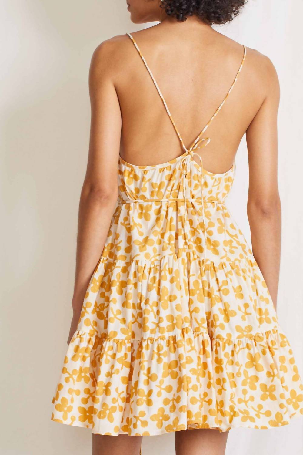 A short and breezy dress for those warmer days. 100% Organic Cotton. Made in India. Scoop neckline, spaghetti straps, self tie at waist, tiered skirt. Dry clean recommended, or hand wash cold and lay flat to air dry