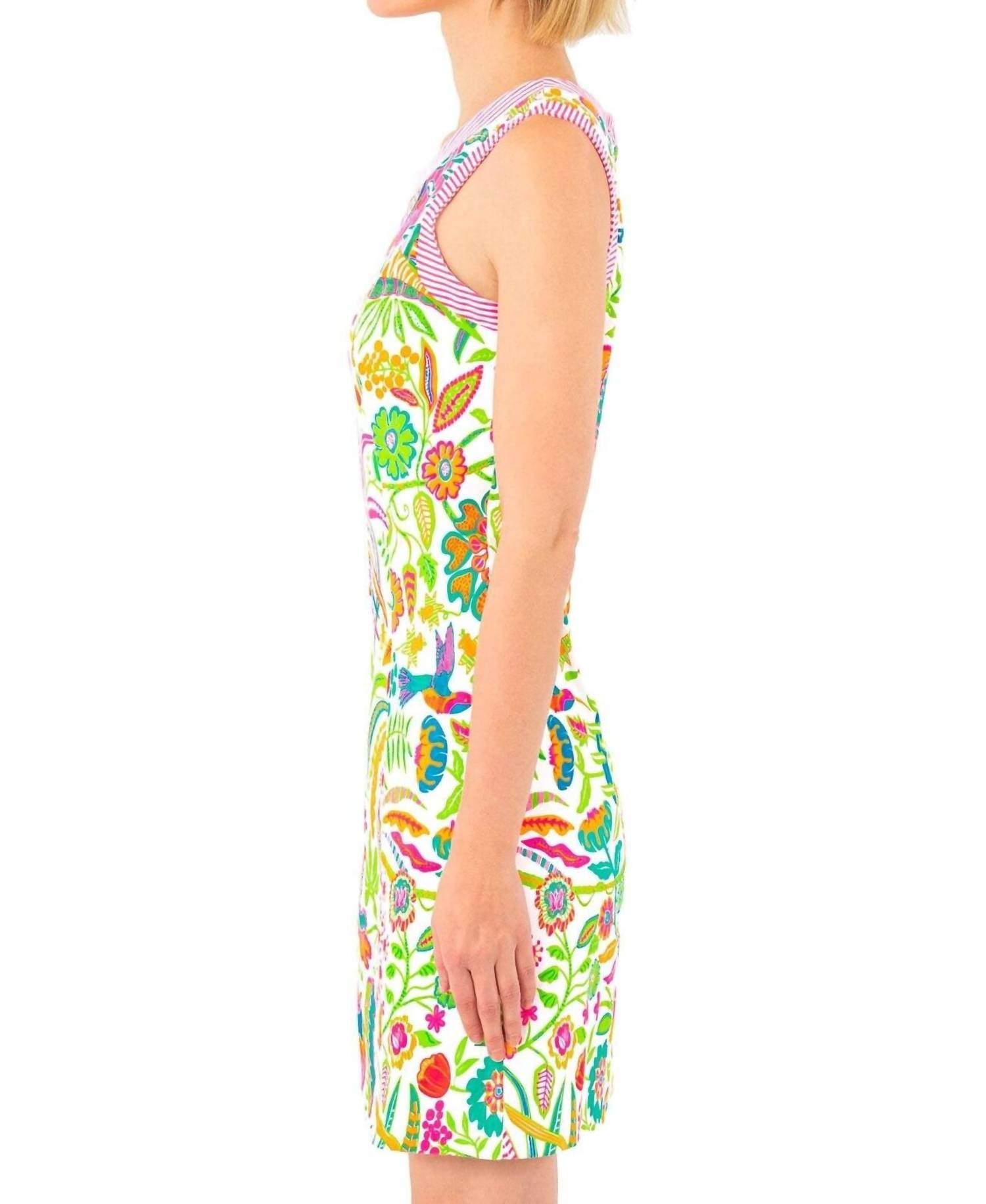The perfect mini dress for those warmer months. Elevate your spring wardrobe with the Hummingbird Heaven Dress by Gretchen Scott, an eye-catching piece in Pink Multi. This sleeveless sheath dress is crafted from a comfortable cotton blend and features a crewneck with contrast banding along the neckline and armholes for added flair. It hits at the knee, creating a form-fitting and flattering silhouette, perfect for making a statement. With a zip closure, this dress offers easy wear and maintenance, simply machine wash and tumble dry.