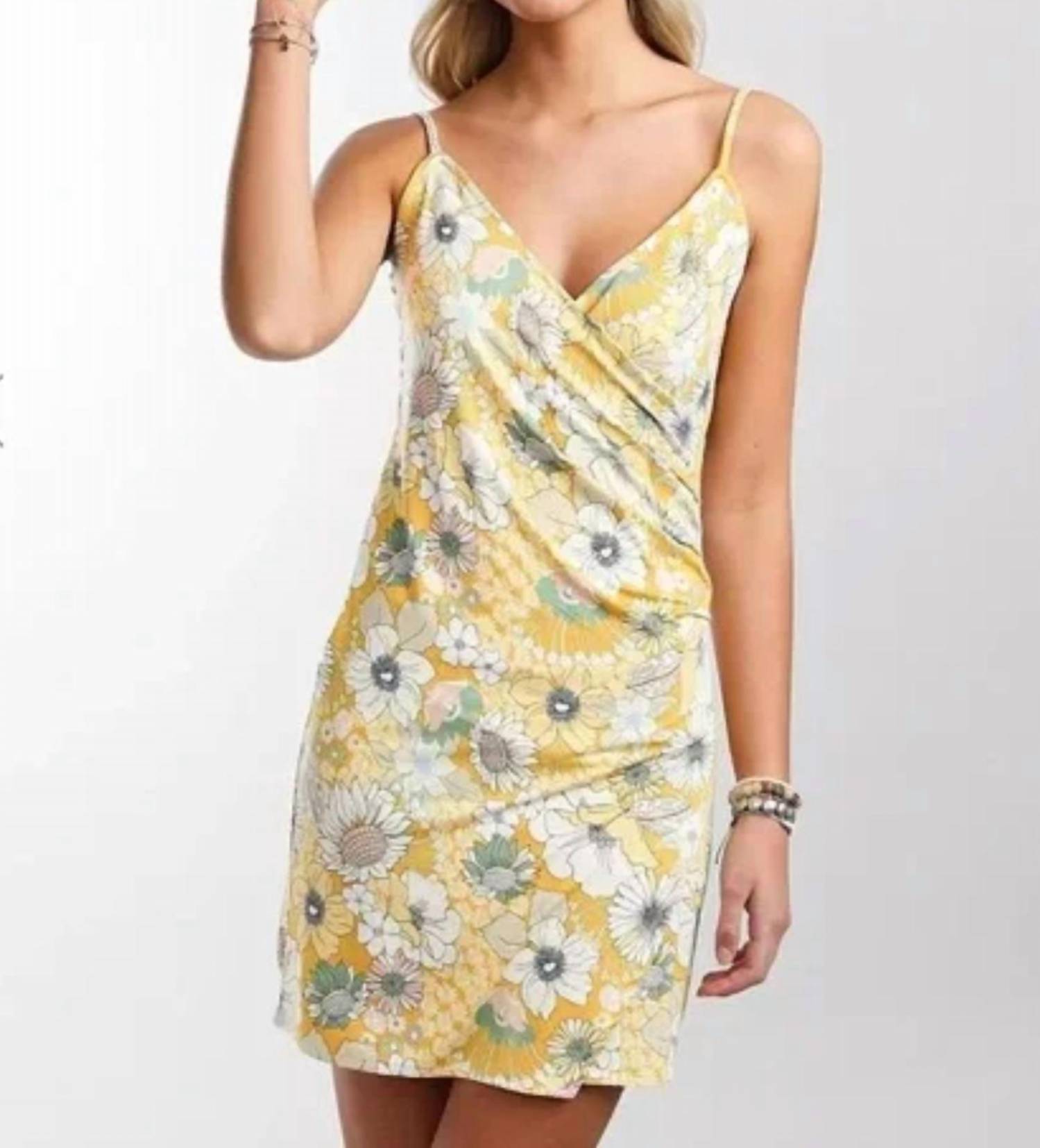 The kind of easy and flattering dress you'll be reaching for all season long. Introducing the Kiki Floral Mini Dress by O'NEILL, a charming piece perfect for any spring dinner party. This vibrant yellow dress features spaghetti straps and a flattering A-line silhouette adorned with a playful floral pattern. Designed with a convenient pull-on closure and a feminine V-neckline, it’s an effortless choice for any Thanksgiving celebration. To maintain its delicate fabric, hand wash and lay flat to dry.