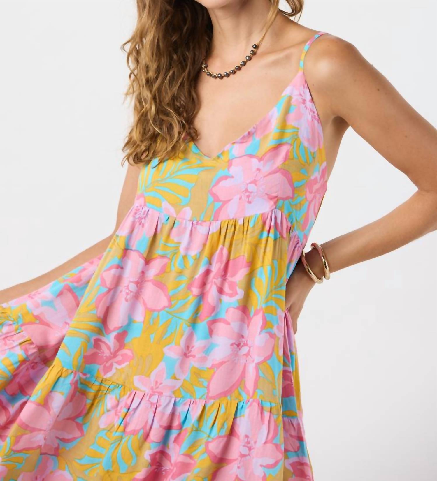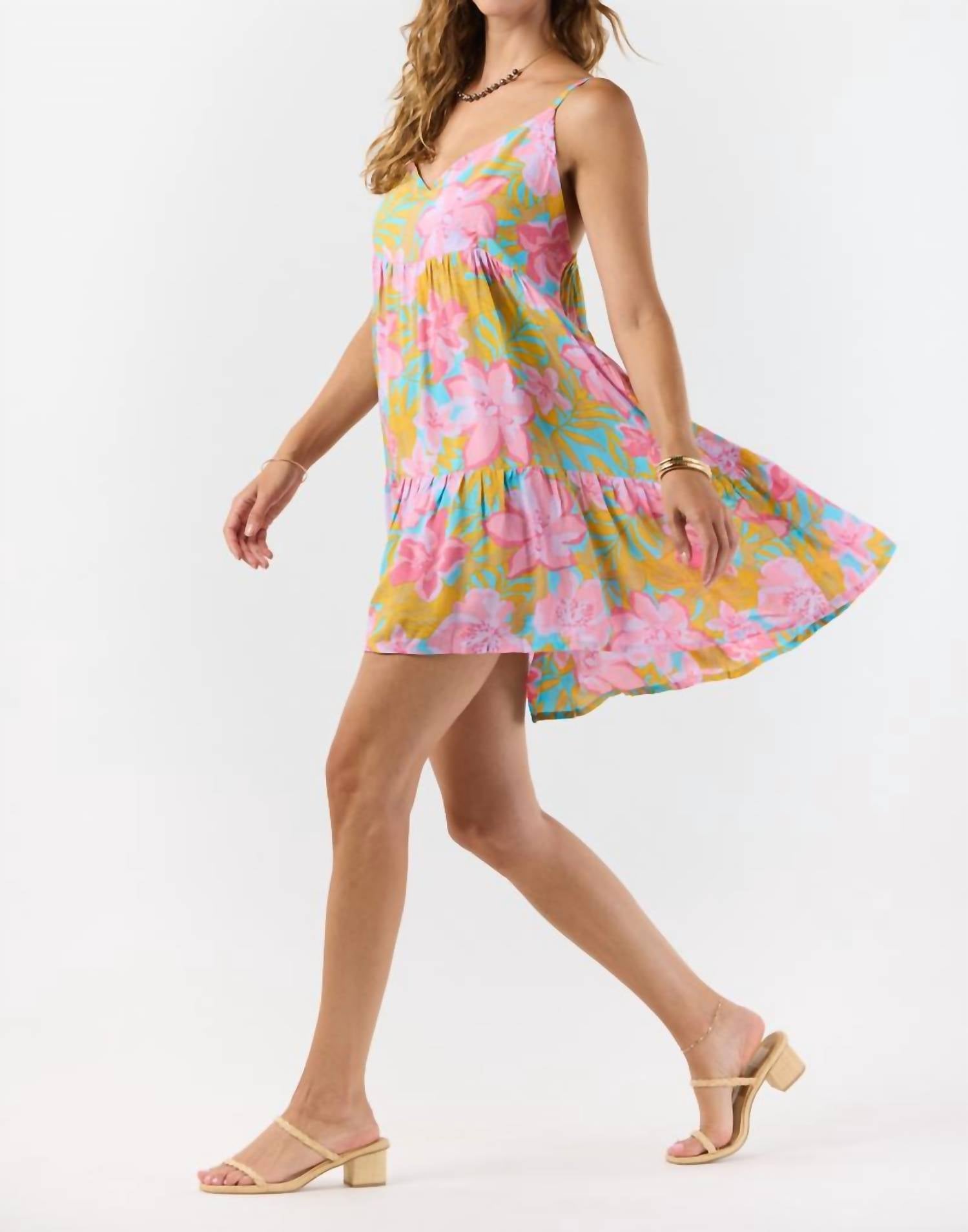 A short and breezy dress for those warmer days. Embrace effortless style with the Jenna Mini Dress by Tiare Hawaii in vibrant Honduras Pink. This A-line dress showcases delicate spaghetti straps and a V-neckline that adds an elegant touch, complemented by a playful tiered skirt. Crafted from 100% Rayon, it offers a flowy fit perfect for vacation or a casual day out. Closure: Pull on. Care: Hand wash cold, lay flat to dry.