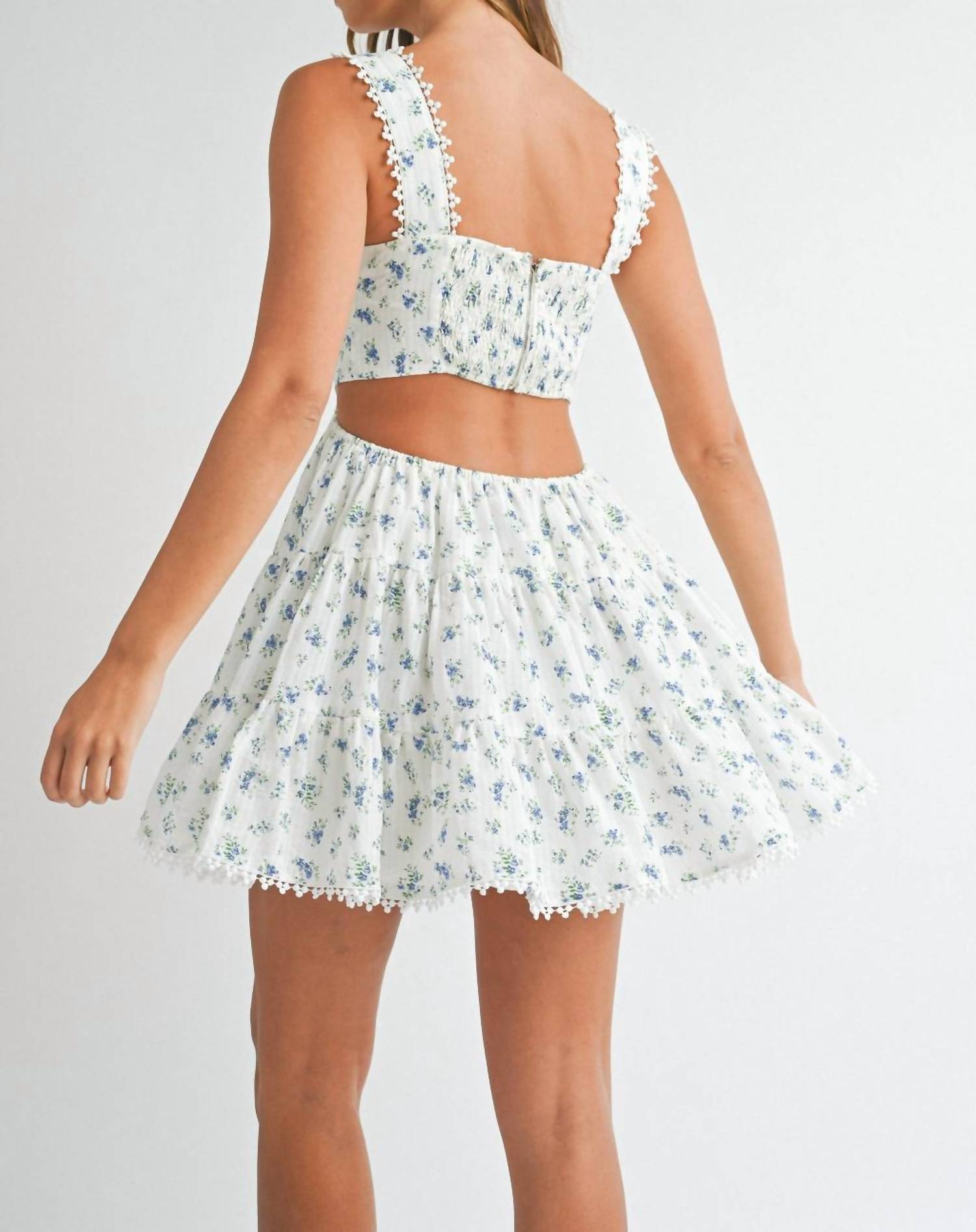 The perfect mini dress for those warmer months. Elevate your summer wardrobe with the Floral Cutout Dress by MABLE, a chic addition in a captivating white and blue floral print. This sleeveless mini dress, featuring side cutouts and a tiered ruffle skirt, is crafted from an 80% Viscose and 20% Rayon blend. Designed with a flattering square neckline and A-line silhouette, it secures with a convenient zipper closure. Care for this boho chic piece by hand washing and laying flat to dry.