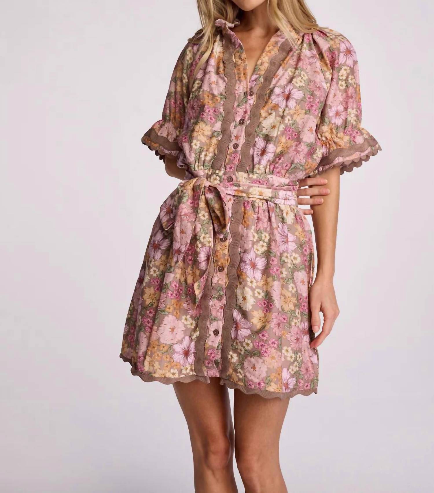 The perfect mini dress for those warmer months. Introducing the Evelyn Mini Dress by Sundays, a captivating addition to your spring wardrobe. This elegant piece features elbow sleeves and a flattering A-line silhouette, crafted from a luxurious blend of 80% cotton and 20% silk. With its vibrant floral pattern and charming ric-rak detailing, this dress finishes just above the knee with a classic V-neck and button closure. Care: Hand wash, lay flat to dry. Note: The dress runs large; sizing down is recommended.