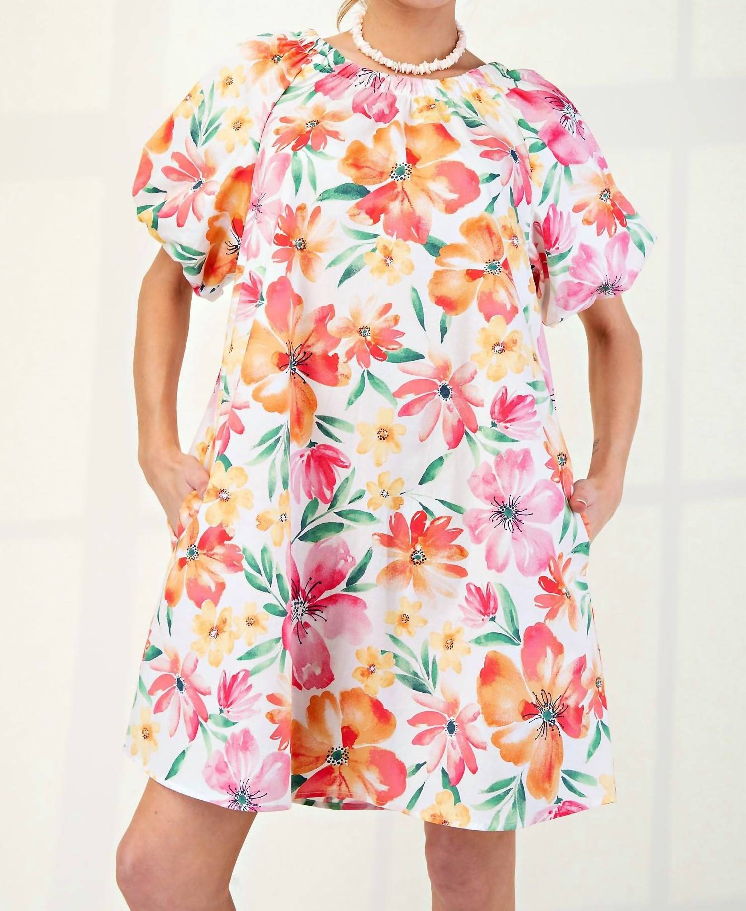 The perfect mini dress for those warmer months. Introduce a touch of boho chic to your spring wardrobe with the Poppy Poplin Floral Mini Dress by Easel. This multi-color mini dress boasts elbow sleeves and a charming floral print that exudes vacation vibes. It features an elastic cinched crewneck and an adjustable ribbon tie closure at the back for a custom fit, complemented by convenient side pockets. Designed in a relaxed A-line silhouette.