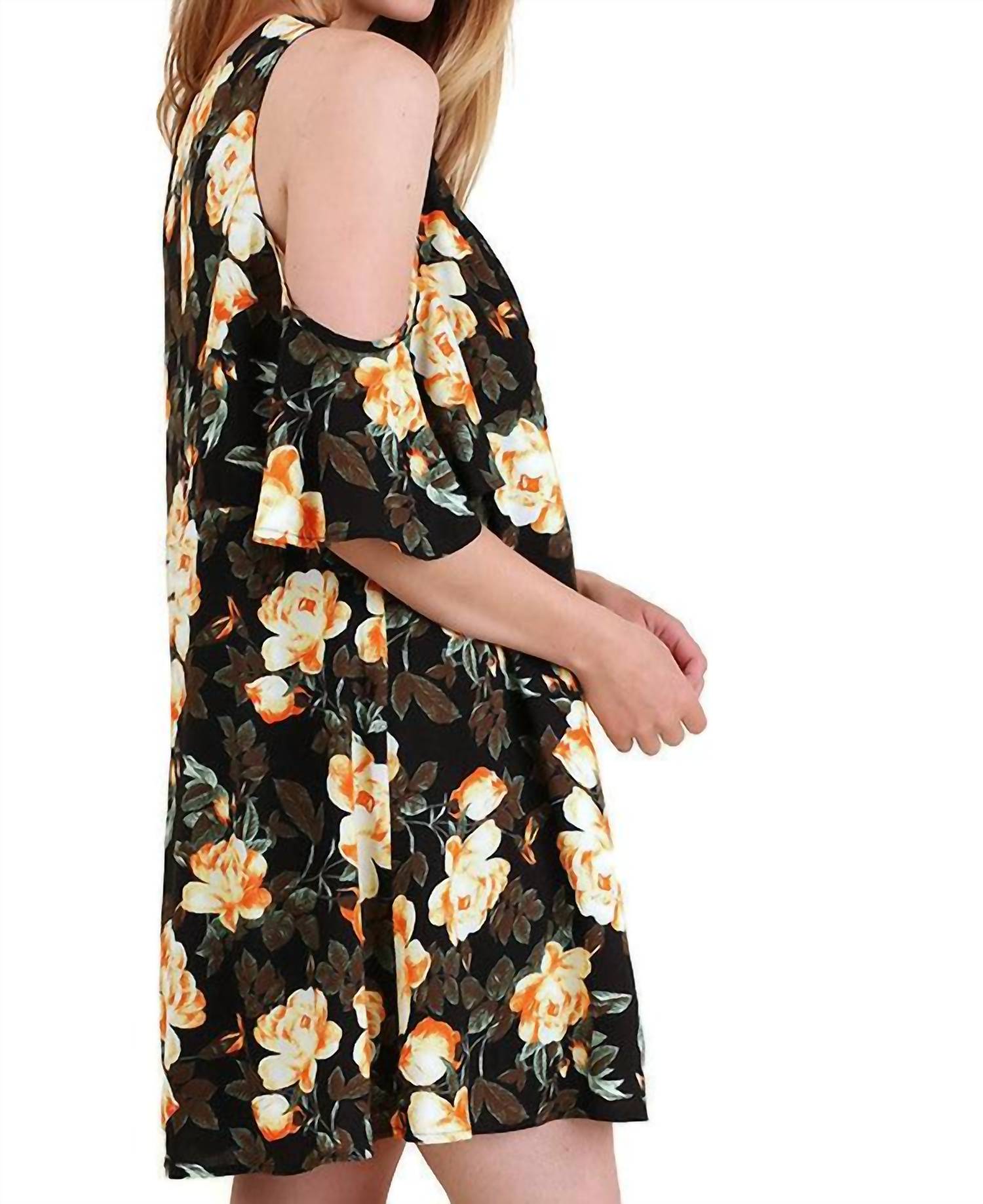 The kind of easy and flattering dress you'll be reaching for all season long. Experience effortless boho chic style with the Floral Cold Shoulder Dress by Umgee. This black dress showcases a vibrant floral pattern with elbow sleeves and a flattering crewneck, perfect for any summer beach day. Made from a breathable cotton blend, it features a button closure and an A-line mini silhouette, fully lined for comfort. Care for this piece by hand washing and line drying. Available in sizes ranging from Small to 2X, with bust measurements from 38" to 48" and lengths from 35" to 36".