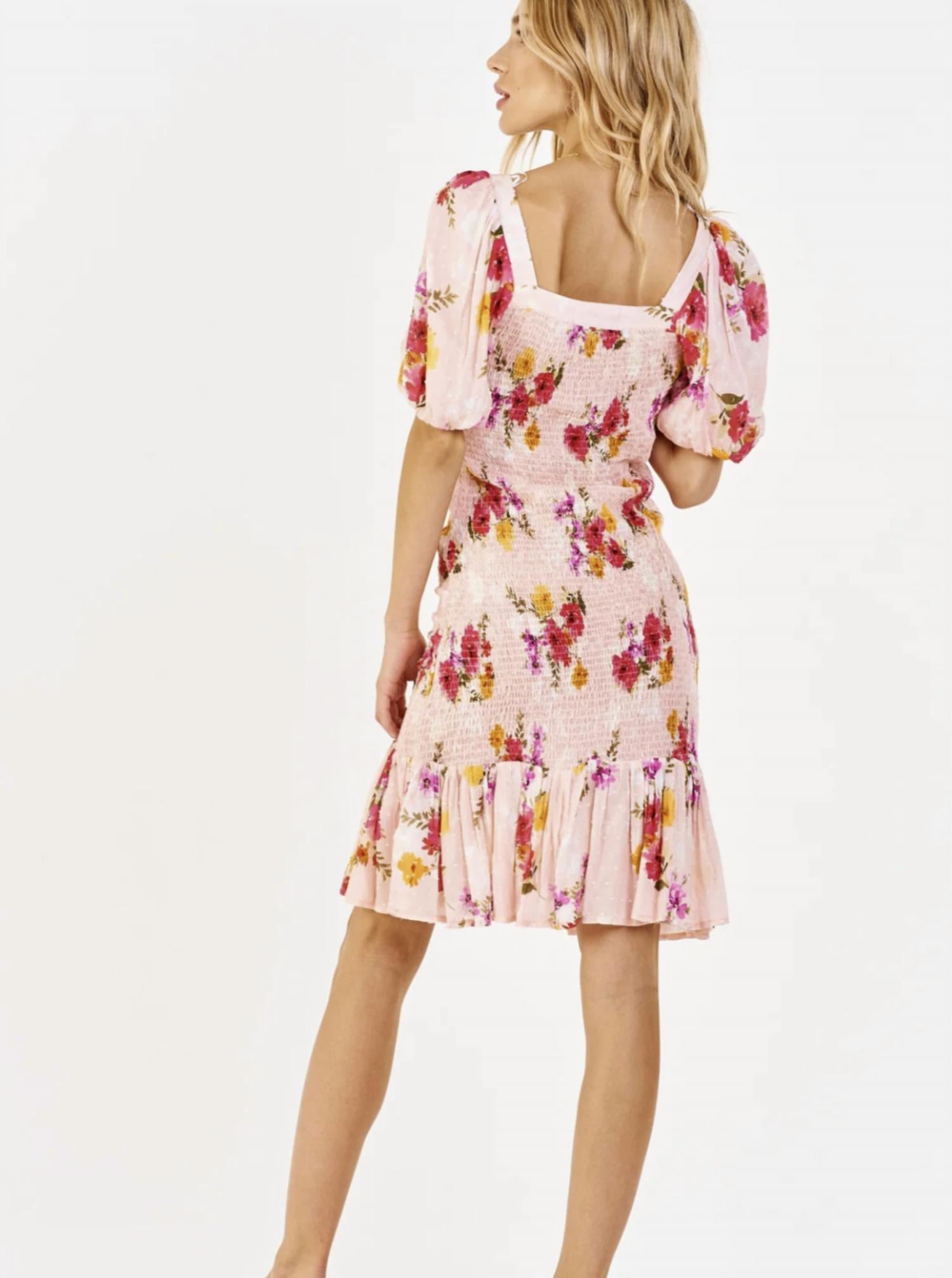 The kind of easy and flattering dress you'll be reaching for all season long. Embrace spring with the Camille Smocked Bodice Mini Dress by DEAR JOHN DENIM, featuring a charming floral pattern in Sweet Garden. This short-sleeve dress is made from 100% rayon, offering a breezy and comfortable fit that flares beautifully from the smocked bodice. Imported with a pull-on closure, it boasts a sophisticated banded square neck with a puffed shoulder and elastic cuff. Care instructions include machine wash cold and line dry. Body length from HPS: 35", Sleeve length: 12", Bust: 29" (Size Small).