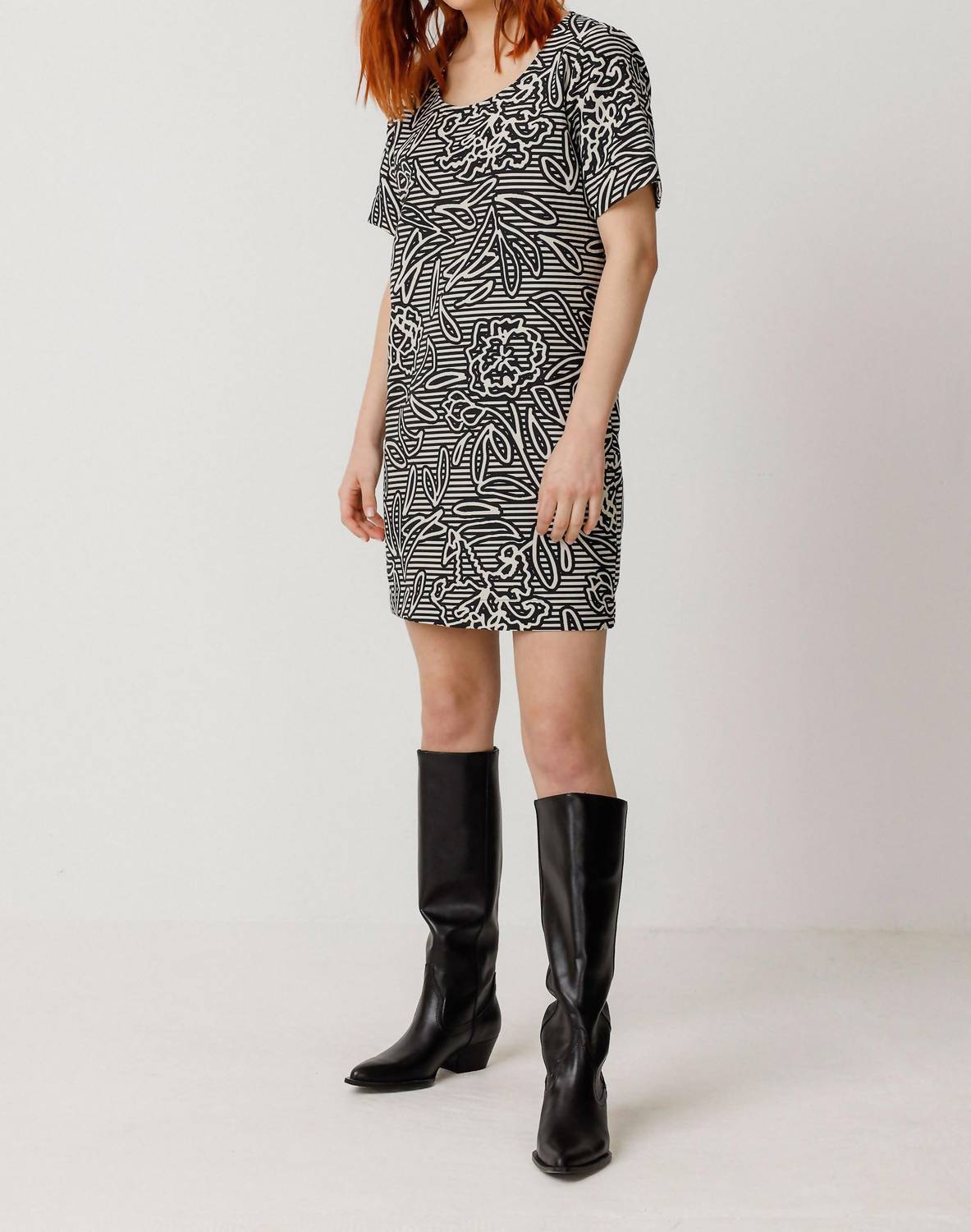 The perfect mini dress for those warmer months. The Gorane Dress by SKFK is a chic choice for a spring holiday party, with its eye-catching floral print in black and cream. Designed as a straight above-the-knee mini, this shift silhouette features a crewneck and short sleeves, ensuring comfort and style. Its composition of 63% organic cotton and 37% recycled polyester offers an eco-friendly appeal with a breathable cotton blend. This dress is crafted for simplicity with a pull-on closure and should be machine washed cold, ironed on low heat, and kept away from bleaching and tumble drying.