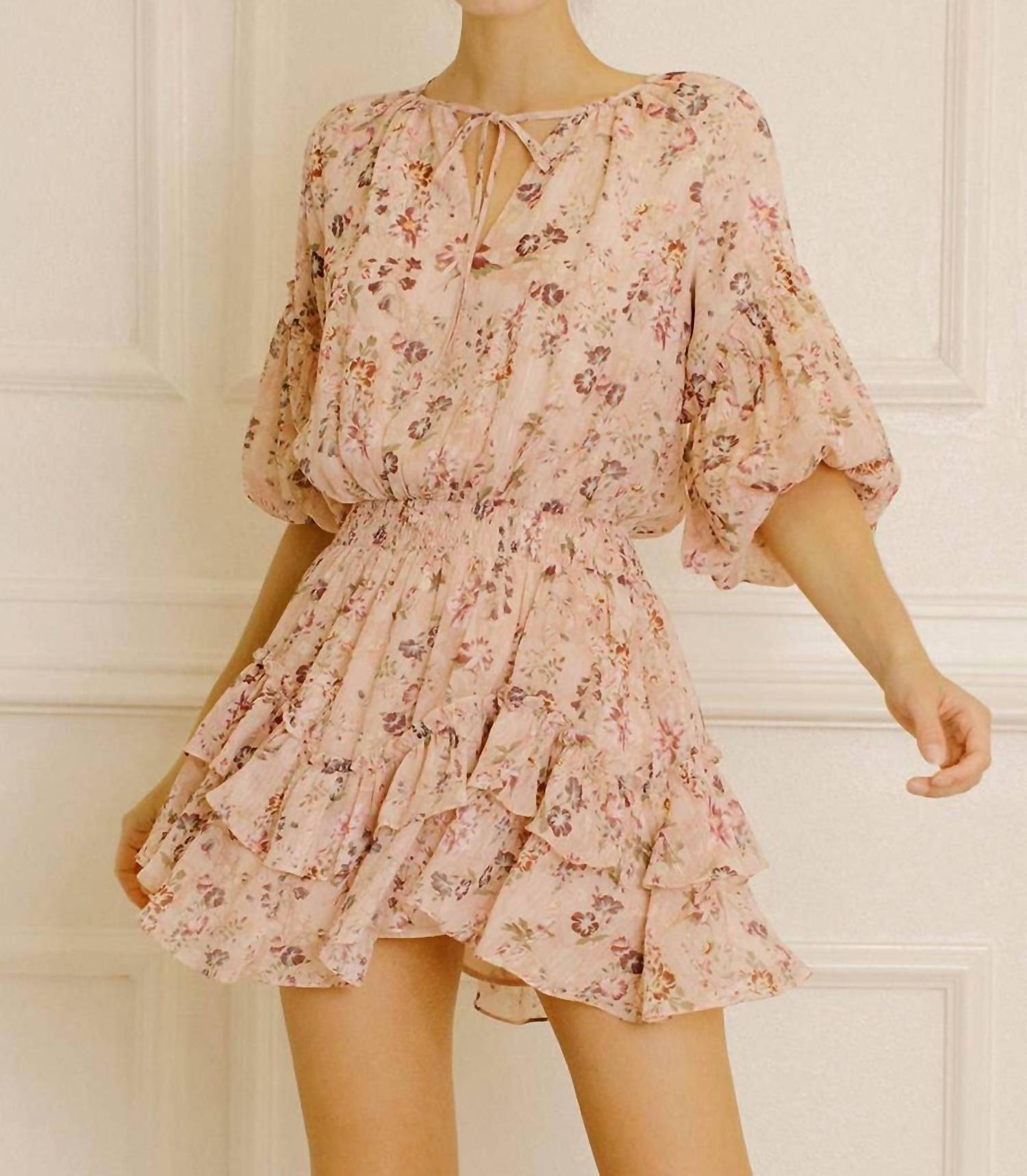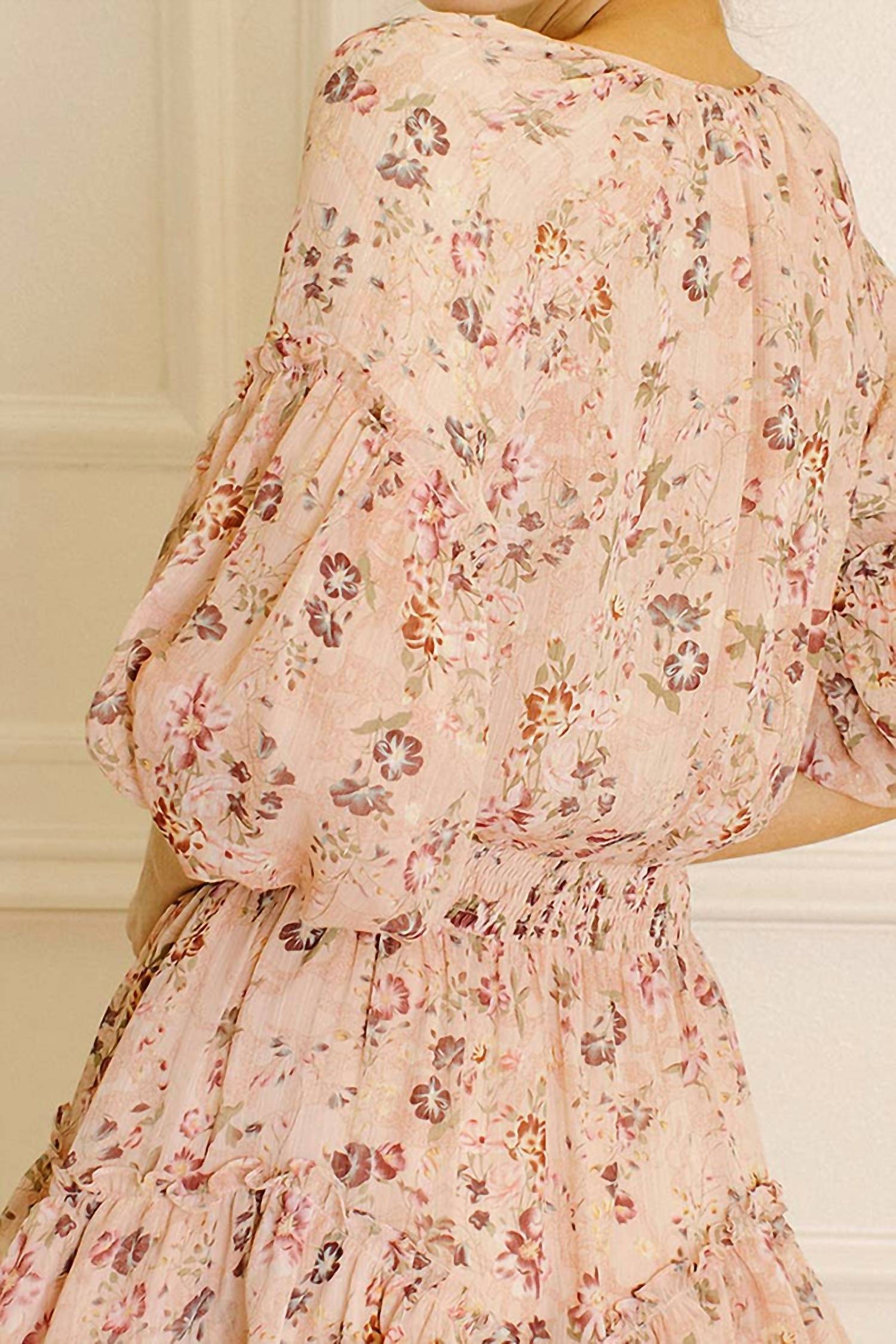 The kind of easy and flattering dress you'll be reaching for all season long. Elevate your spring wardrobe with the STORIA Floral Print Ruffled Mini Dress in Pink Multi Floral, designed for chic elegance at any dinner party. Featuring elegant elbow sleeves with wide gathered hems, a center tie-string peephole, and a flattering cinched smocked waist, this dress offers a delightful blend of class and playfulness. Crafted from lightweight materials, it embodies a tiered ruffled layered mini bottom that adds movement and flair. The pull-on closure makes it easy to wear, and it is machine washable for effortless care.