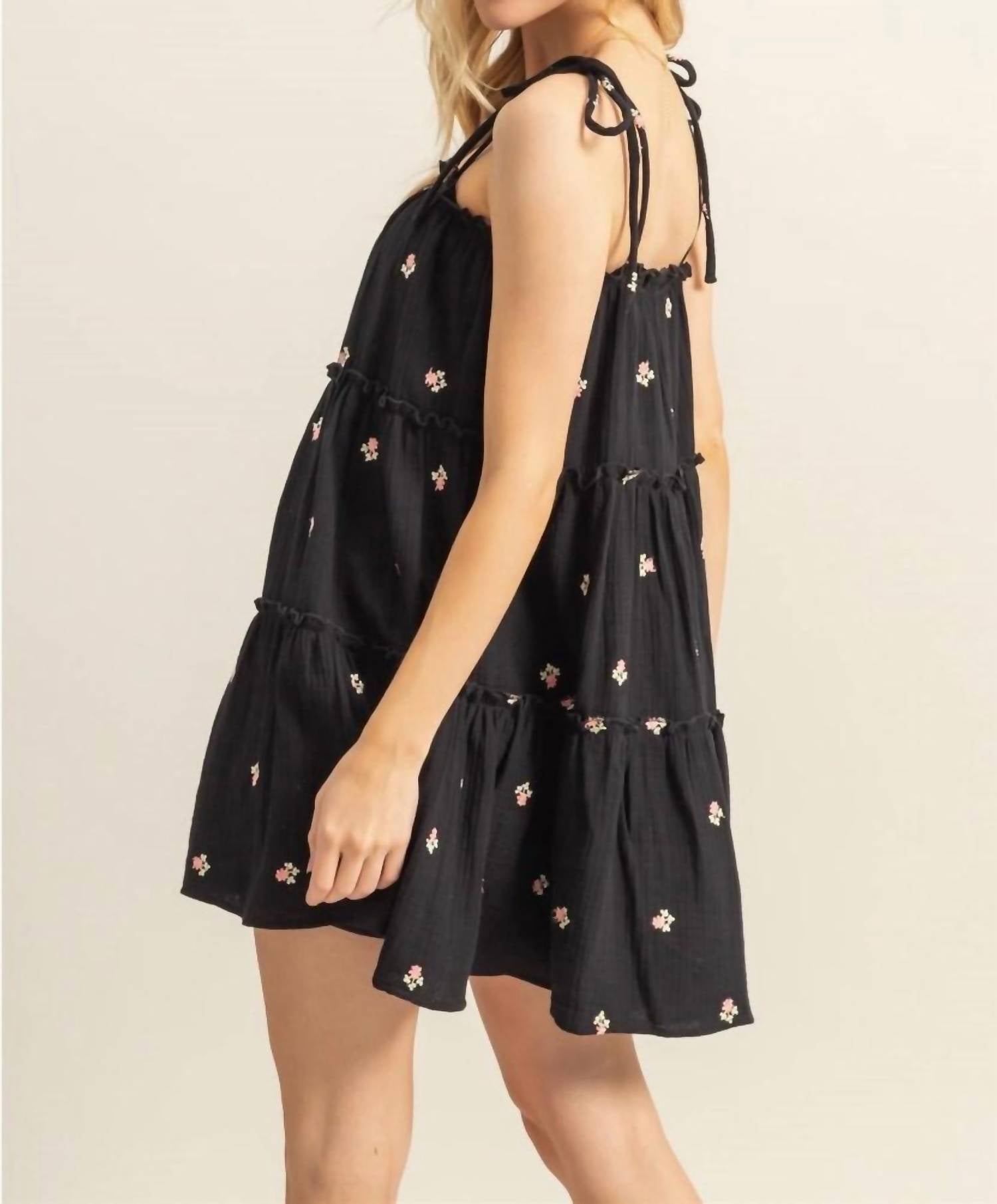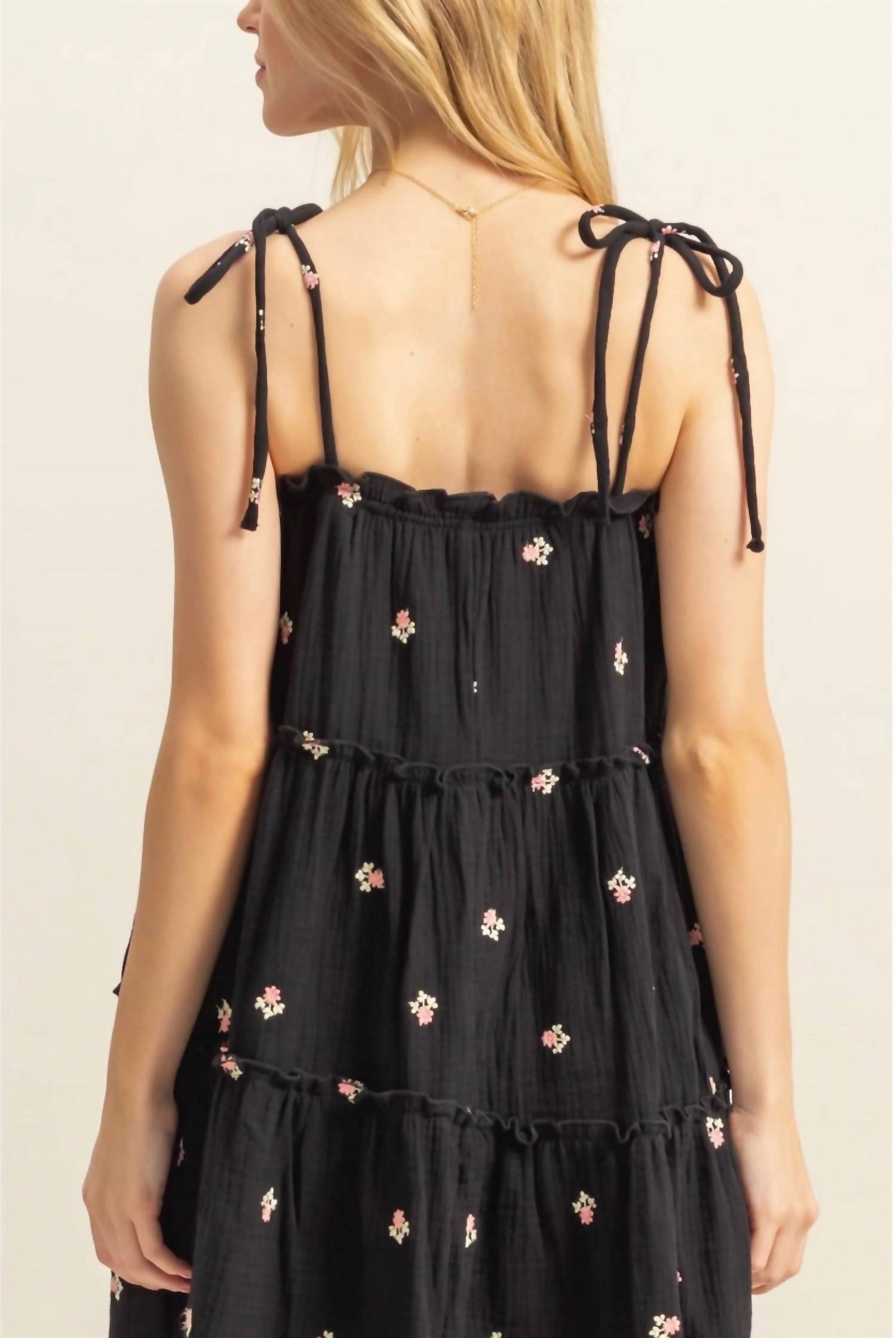 The perfect mini dress for those warmer months. Discover the Emma Embroidered Tiered Mini Dress by HYFVE, a charming addition to your spring wardrobe. This black A-line mini dress showcases a delicate floral embroidery throughout and features spaghetti straps with self-tie shoulder detailing, enhancing the ruffled square neckline. Made from 100% Cotton, it offers a pull-on closure for easy wear. Care for this dress by simply hand washing and line drying. Model is wearing a size small (5'6" tall, 32" chest, 24" waist, 32" hips).