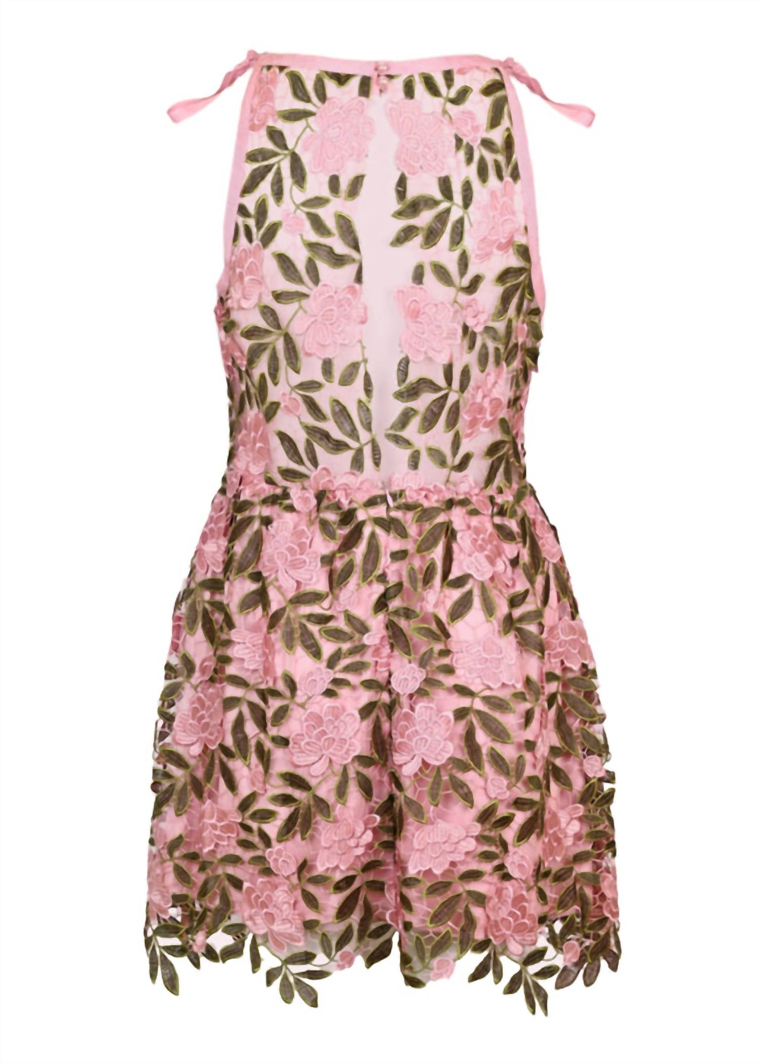 A short and breezy dress for those warmer days. Elevate your wardrobe with the SAYLOR Saffi Dress, a romantic mini A-line silhouette in a captivating floral pattern. This sleeveless dress is perfect for a Valentine's Day dinner party, offering a boatneck and adjustable shoulder straps for a custom fit. Crafted from 100% Polyester with a 100% Recycled Polyester lining, it presents a delicate rose embroidery and soft baby pink underlay. Care: Dry clean only. Model is 5'8" and wears a size x-small. Closure: Button closure.