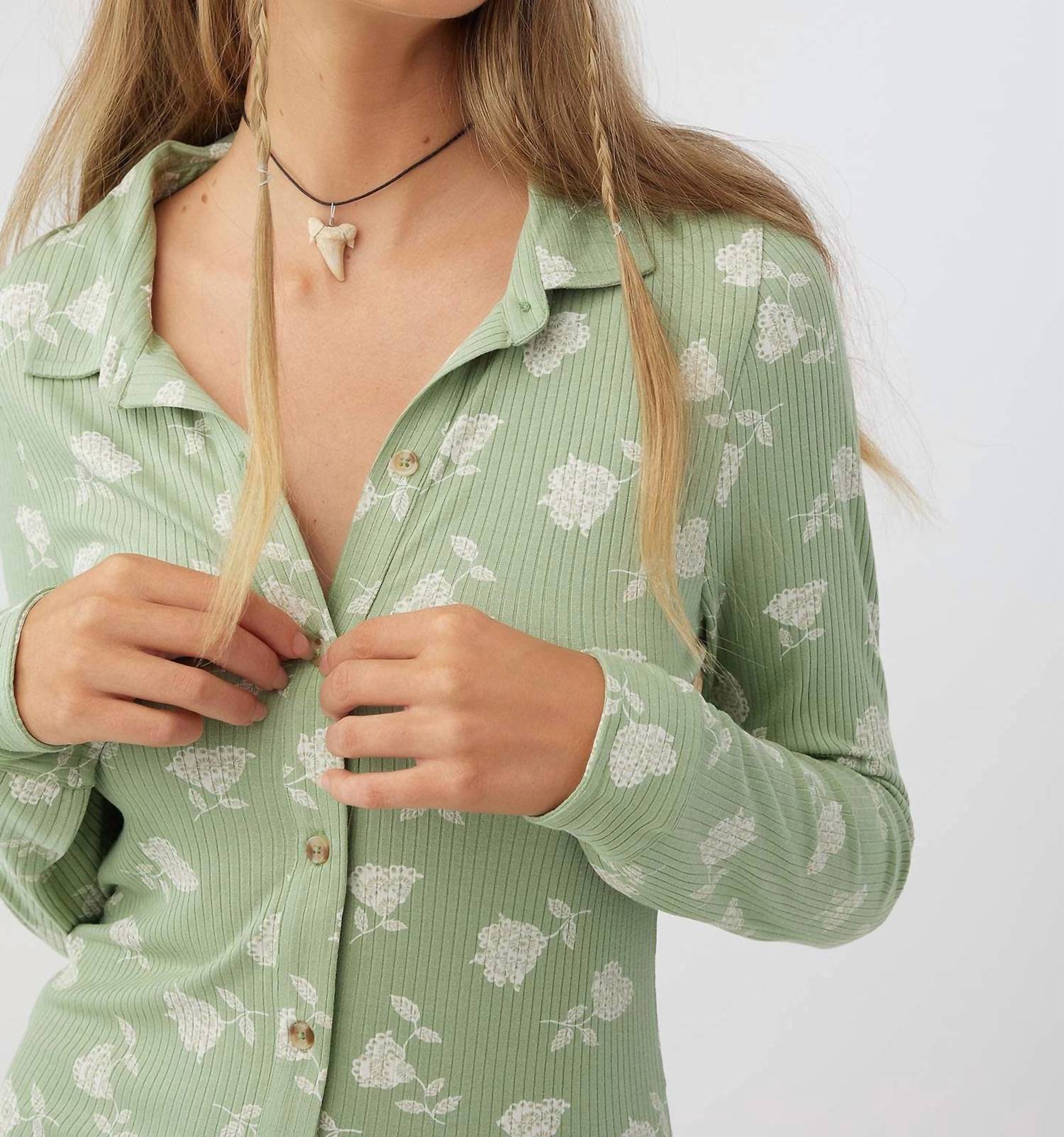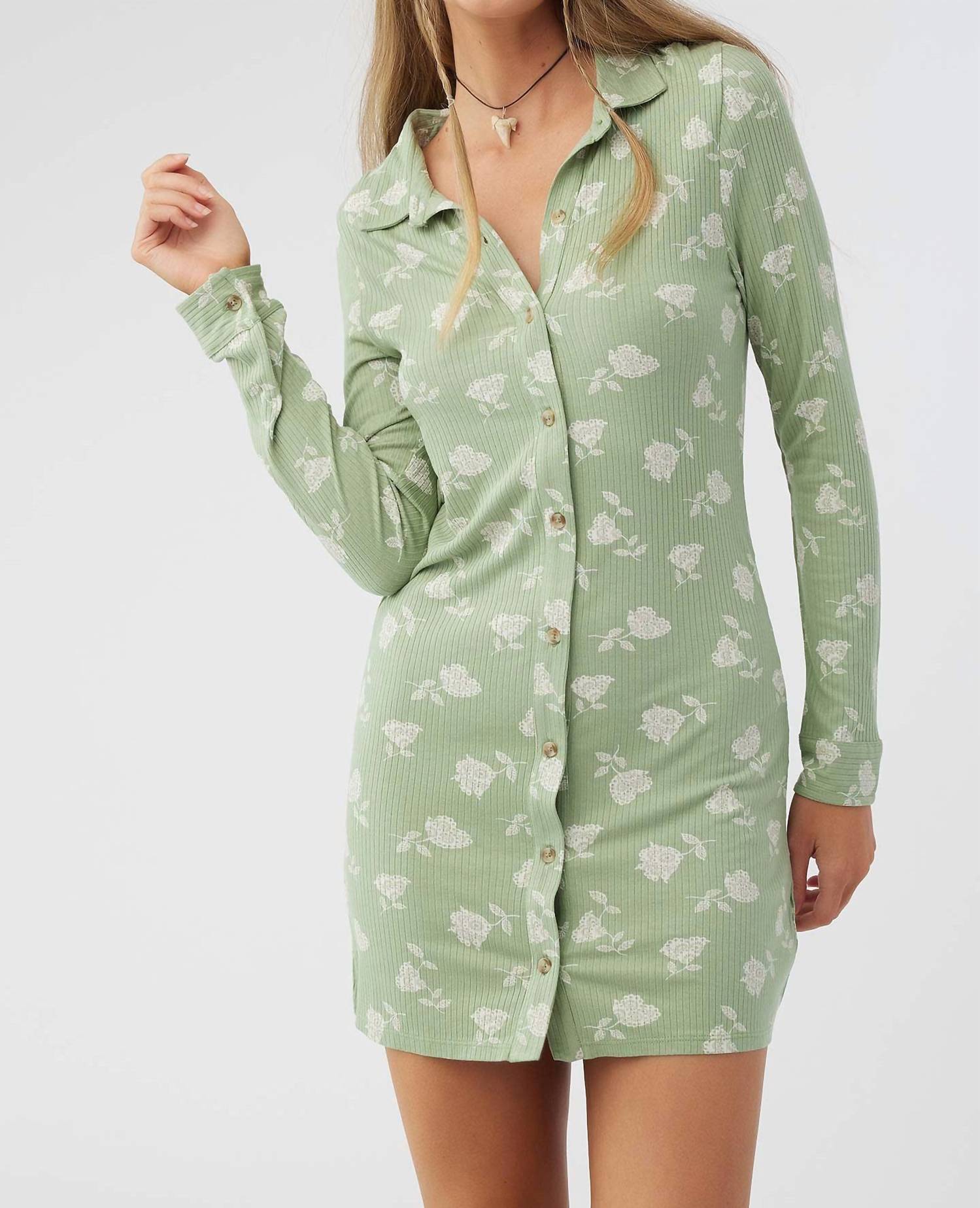 The perfect mini dress for those warmer months. Meet the Juliette Dress by O'NEILL, a stunning addition to your fall wardrobe. This bodycon mini dress comes in a captivating green floral pattern and features long sleeves and a classic collared neckline, perfect for Thanksgiving and housewarming occasions. Made from a viscose blend, it offers a comfortable fit while the button closure adds a touch of elegance. Enjoy seamless style without the fuss, as specific care instructions are not provided.