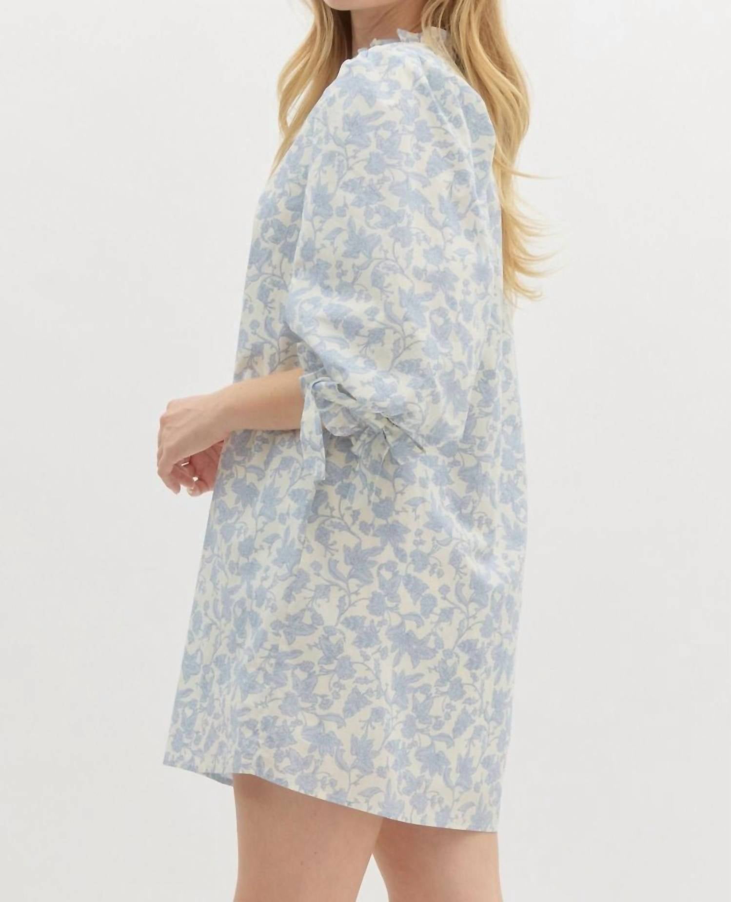 The kind of easy and flattering dress you'll be reaching for all season long. Introducing the Floral Print Pullover Mini Dress by Entro, a charming choice for those who love floral designs. Featuring long puff sleeves with elasticated openings and fixed ribbons, this dress is both stylish and functional with side pockets. Crafted from a lightweight woven material with a sheath silhouette, this dress offers ease with its pull-on closure. Care: Machine wash, lay flat to dry. Available in blue, with bust measurements of small 40", medium 42", large 44", and lengths of small 33", medium 34", large 35".