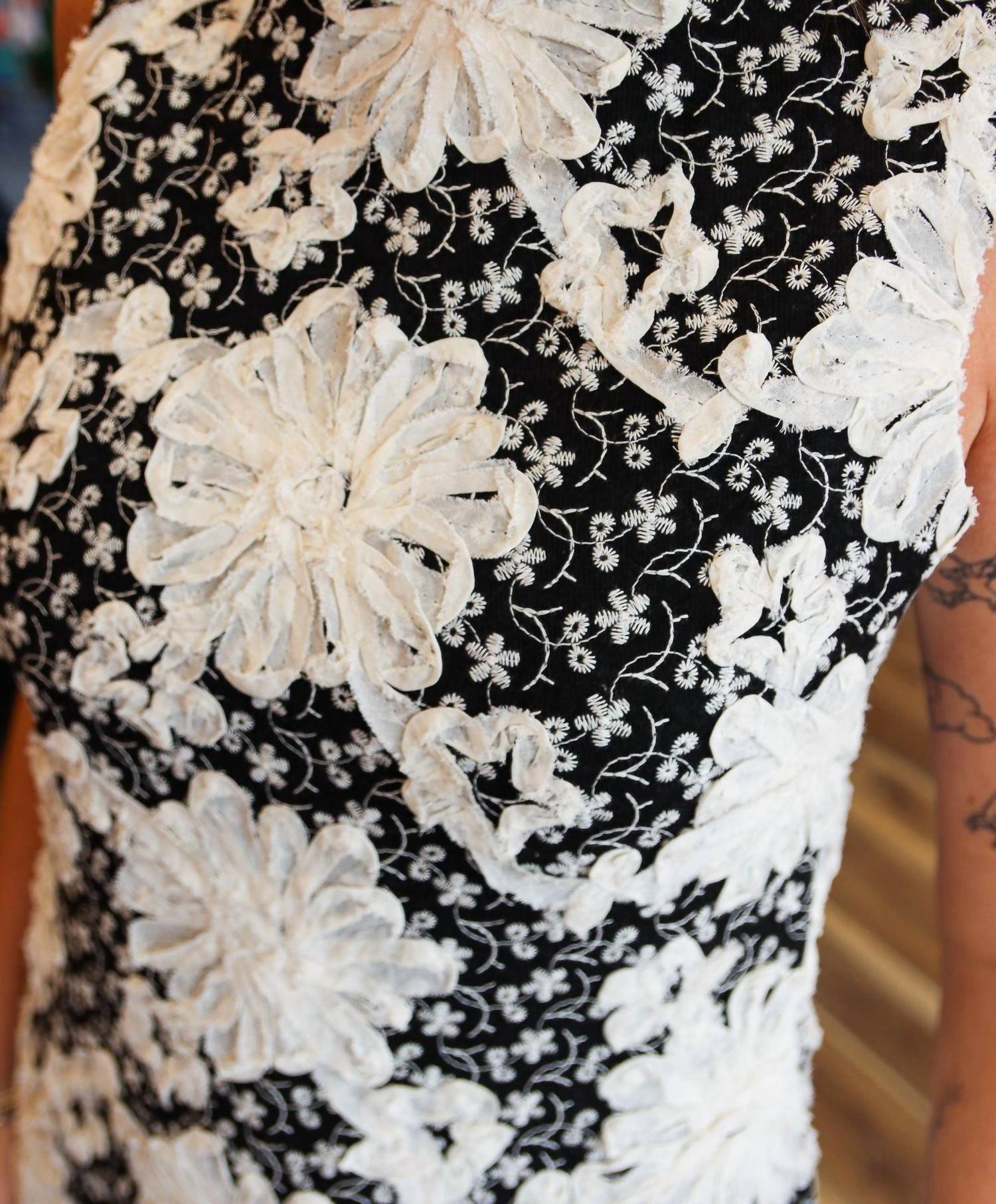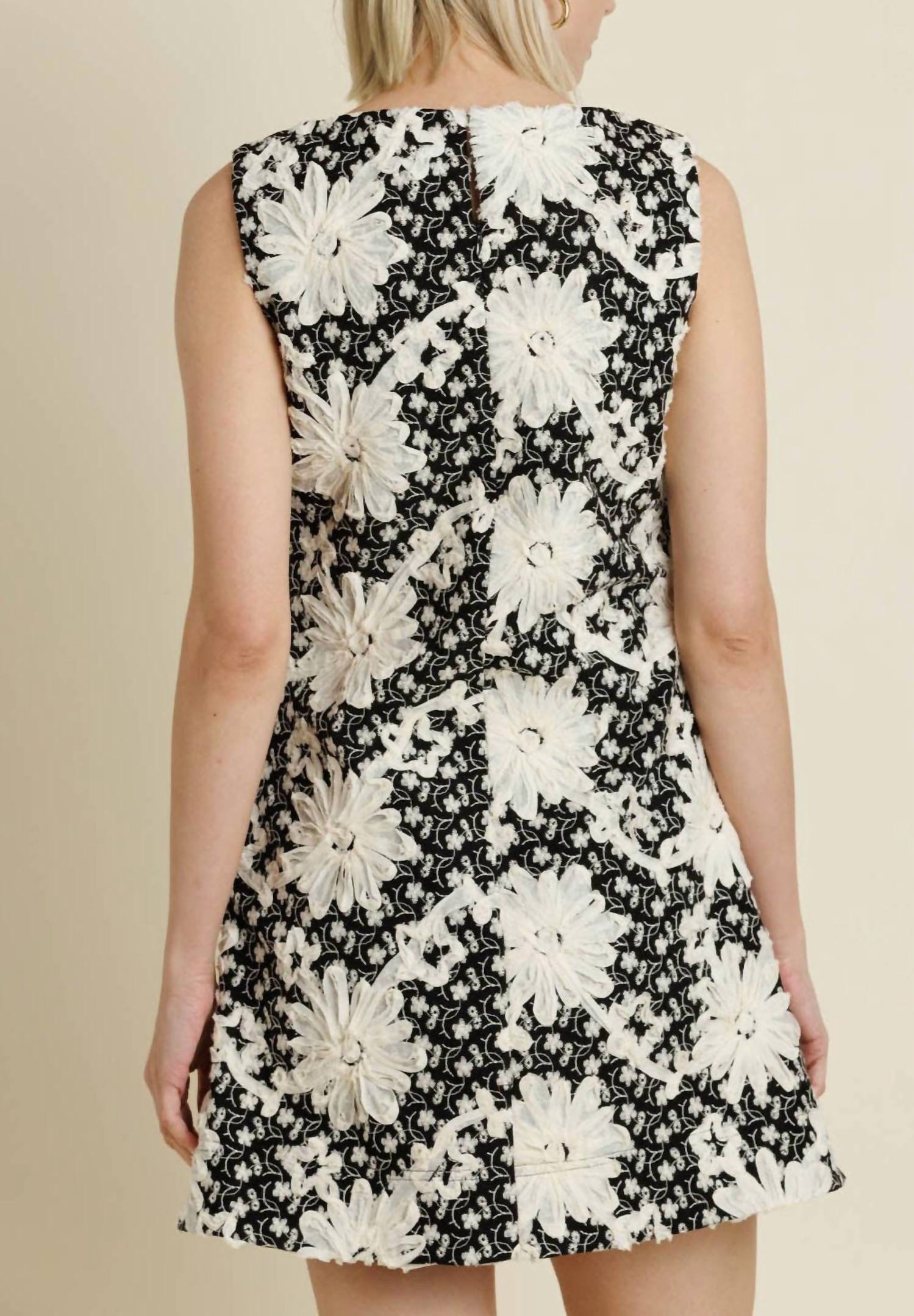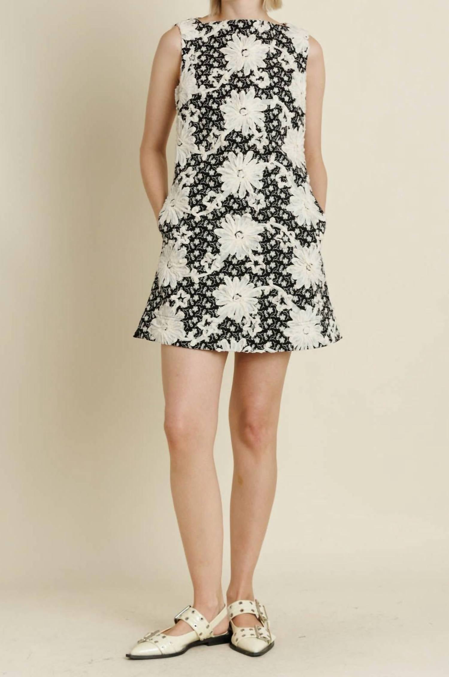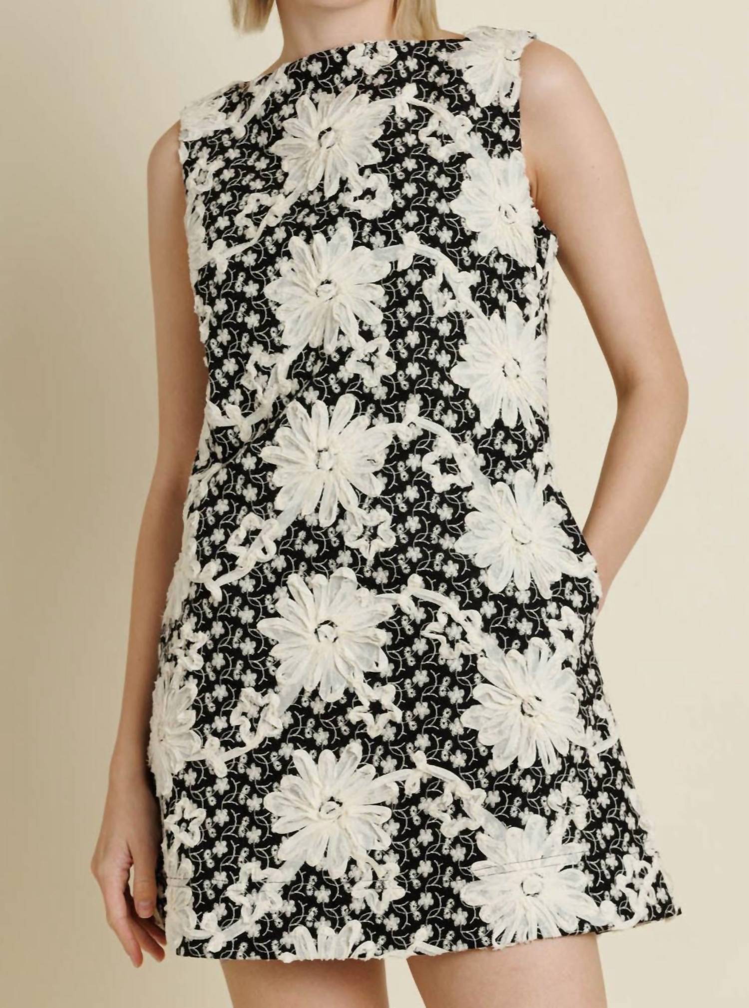 The perfect mini dress for those warmer months. Discover the Embroidered Twill Mini Dress by Aureum, a stunning piece perfect for holiday parties. This sleeveless dress boasts a chic boatneck and shift silhouette with a flattering zip closure. Made from durable polyester, this dress features a charming floral pattern in black and white, with convenient pockets for added functionality. Ideal for spring and Thanksgiving occasions, this boho-chic mini dress is sure to become a staple in your wardrobe.
