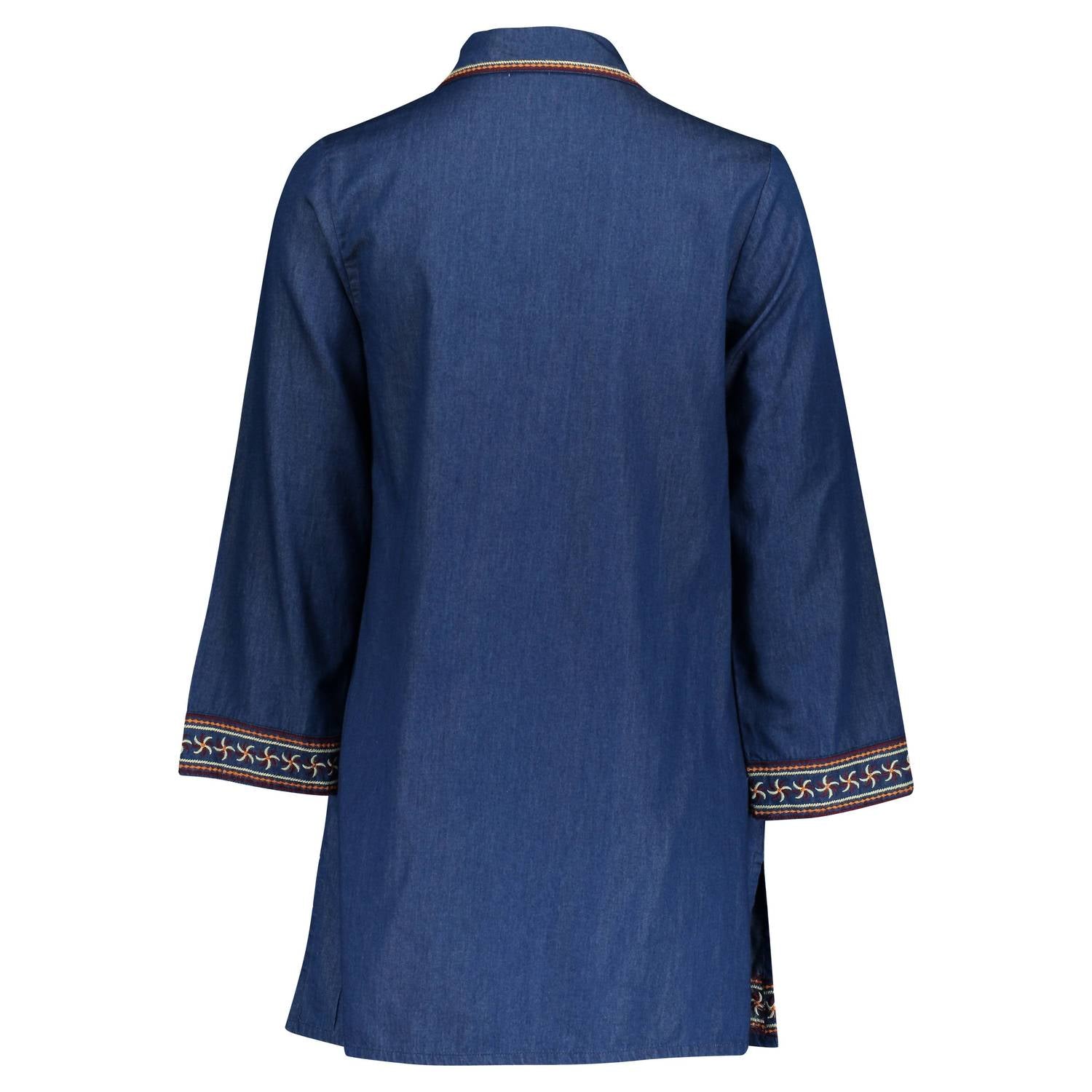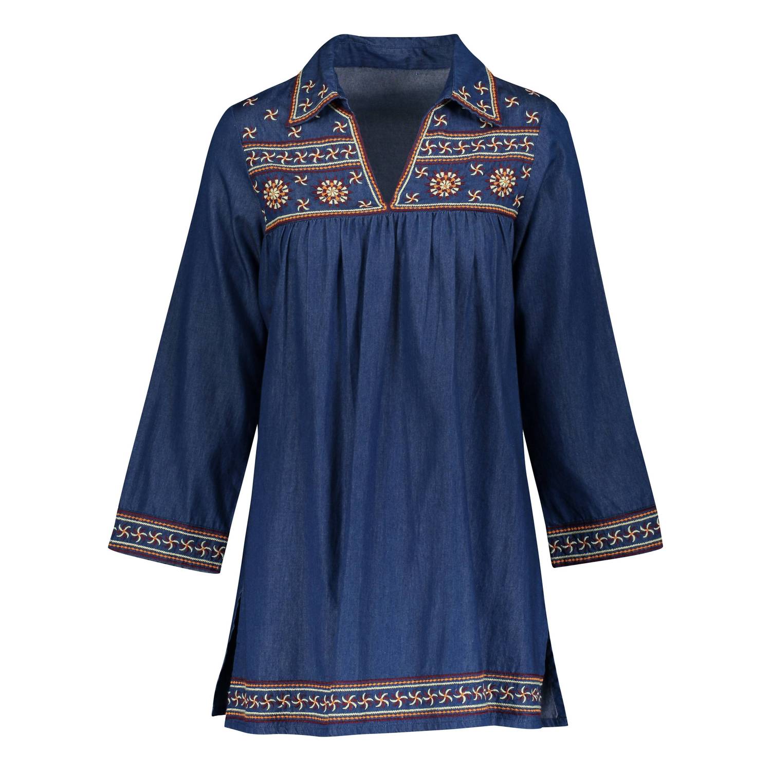The perfect mini dress for those warmer months. Introducing the Ellie Floral Dress by Guadalupe Design, a boho-chic piece in a stunning blue denim. Featuring long sleeves and a charming V-neck, this shift silhouette dress is crafted from cotton denim with delicate embroidered floral details. Enjoy the convenience of a pull-on closure and embrace effortless style this spring. Care instructions include machine washing cold, tumble drying low, and avoiding bleach.