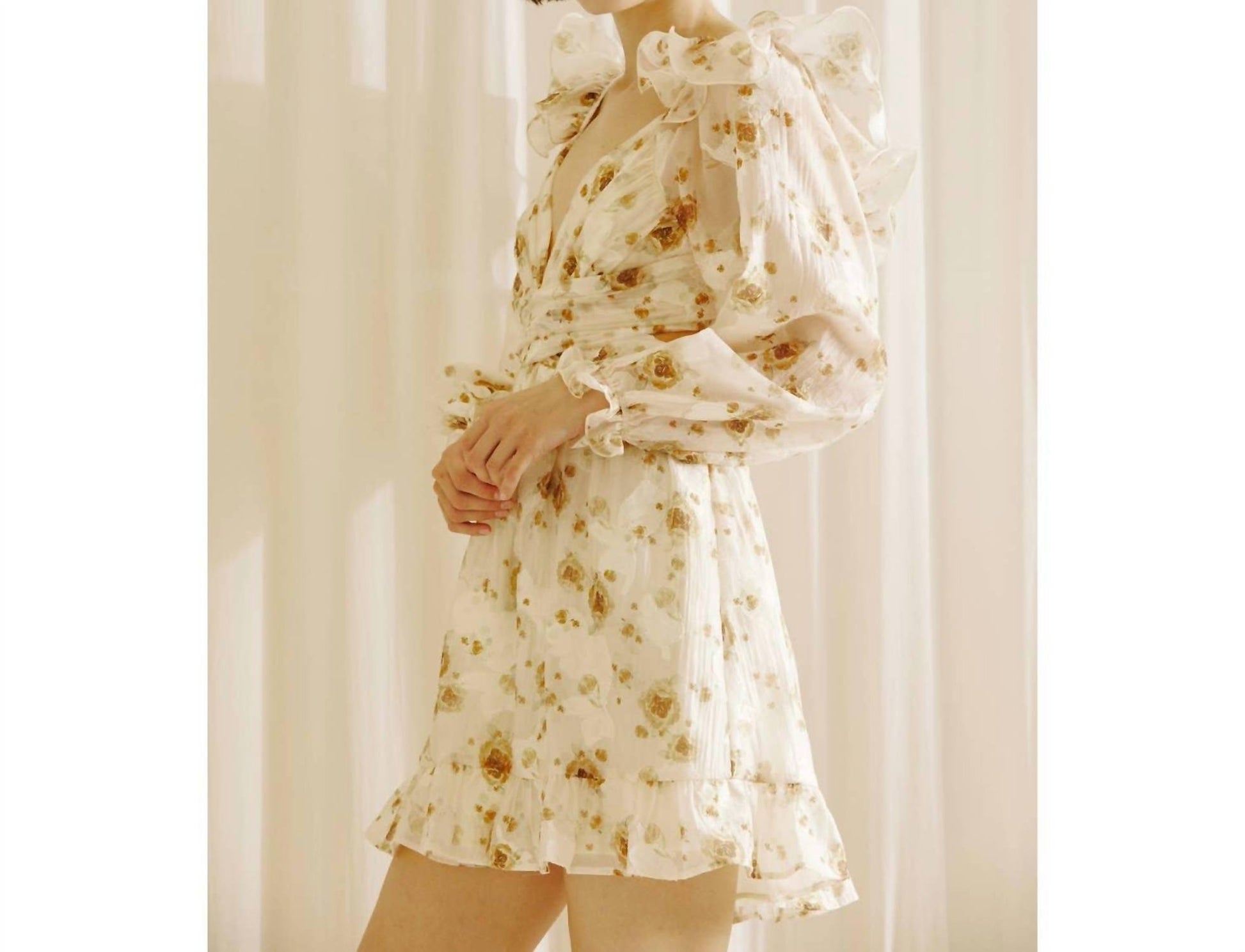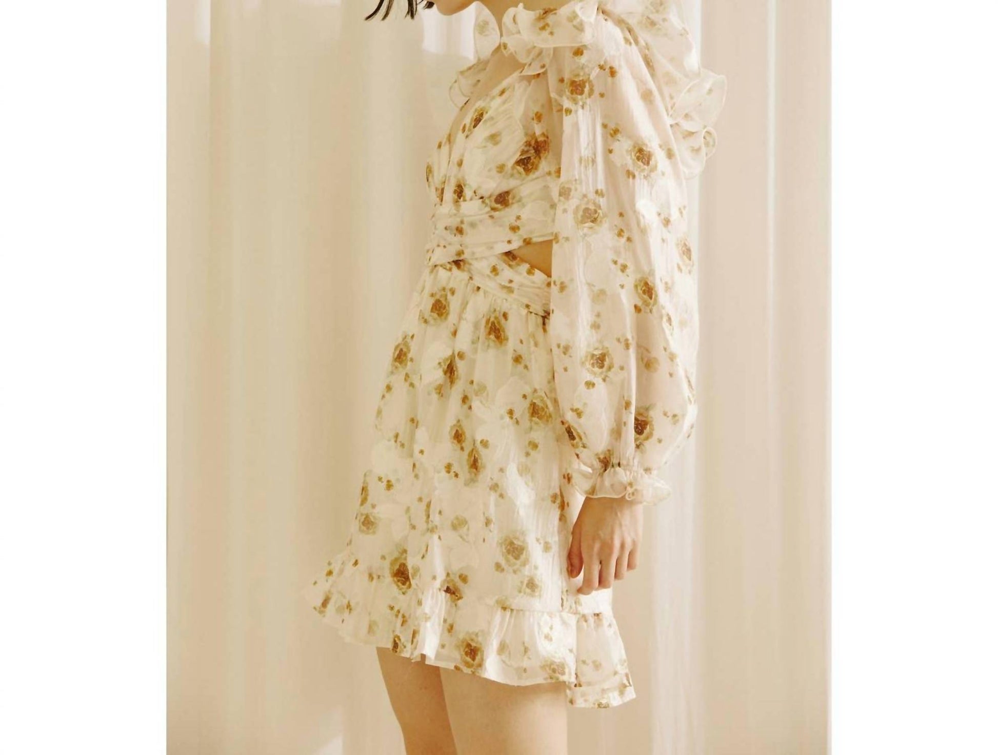 The perfect mini dress for those warmer months. Unveiling the Rose Ruffled Mini Dress by STORIA, a standout piece in a charming cream brown floral pattern. This mini dress features long puffy sleeves and a flattering V-neckline, enhanced by a wrapped empire waist with chic side cutouts. Designed with a tie closure, its open back boasts a criss-cross string detail, while the ruffled hem adds a playful touch. Ideal for weddings or any special spring occasion, this dress encapsulates the elegance of quiet luxury.