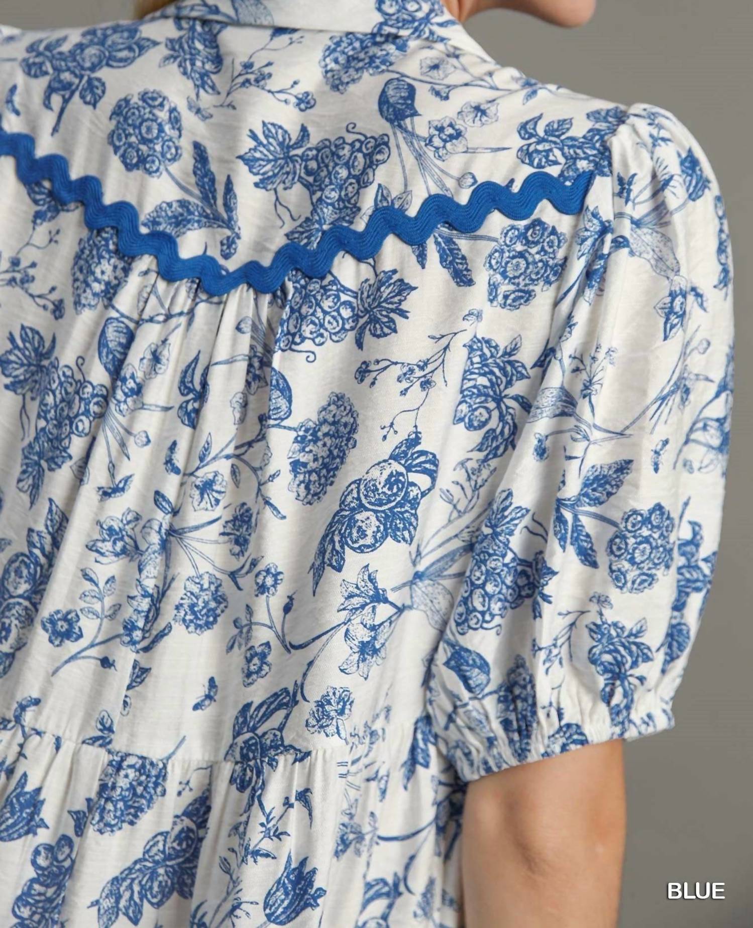 A short and breezy dress for those warmer days. Introducing Umgee's Two Tone Landscape China Print Mini Dress, a perfect blend of style and comfort for your summer wardrobe. This chic piece features short elbow-length puffed sleeves, a V-neck collared neckline, and an eye-catching blue floral print with intricate ric rac trim. Made from a lightweight blend of 80% rayon and 20% nylon, it showcases a relaxed A-line silhouette for a flattering fit. Designed with a pull-on closure, this mini dress is true to size and machine washable for easy care, ideal for casual outings or special events. Model is 5’9” and wearing a size small. Available in sizes S-L.