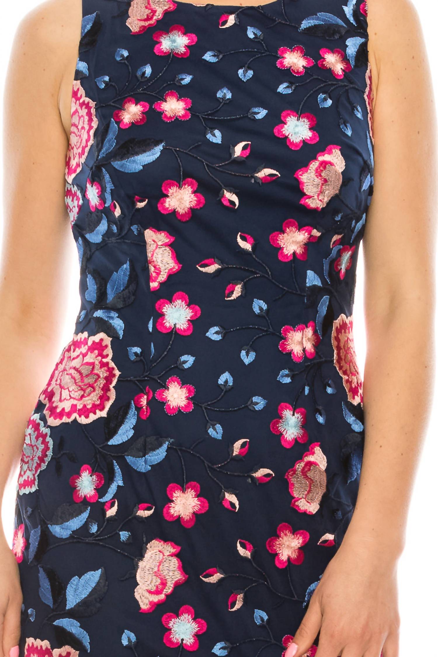 The kind of easy and flattering dress you'll be reaching for all season long. Embrace your femininity with the Sleeveless Floral Embroidered Dress by AIDAN MATTOX, perfect for spring and summer events. This sheath mini dress, crafted entirely from polyester, features a charming scoop neckline and a vibrant mesh overlay with floral embroidery. It ensures easy wear with a hidden back zipper and a hook-and-eye closure. For best results, it's advised to dry clean.