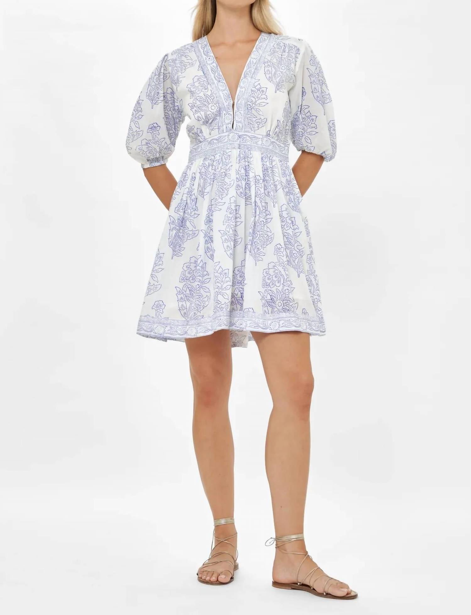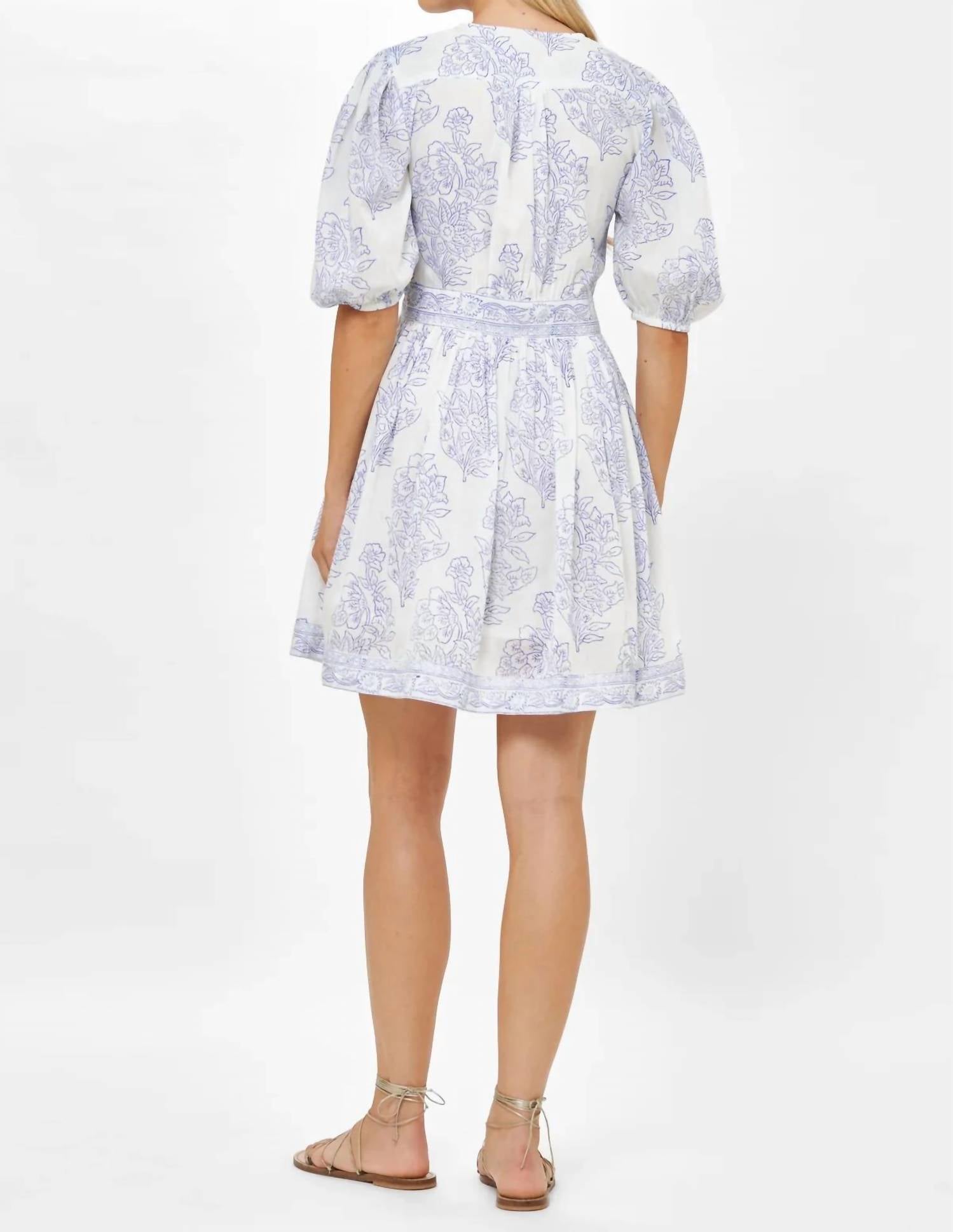 A short and breezy dress for those warmer days. Elevate your summer wardrobe with the V-neck Puff Mini Dress by Oliphant, crafted for women in a stunning Marseille Blue hue. This A-line mini dress is made from 100% lightweight cotton voile and features short puff sleeves with elasticized cuffs and a fitted bodice for a flattering, slim fit. The all-over hand block printed pattern and contrasting trimming enhance its chic appeal, while the side zipper ensures a tailored fit. Fully lined through the body, it can be cared for by hand washing with gentle detergent and laying flat or hanging to dry.