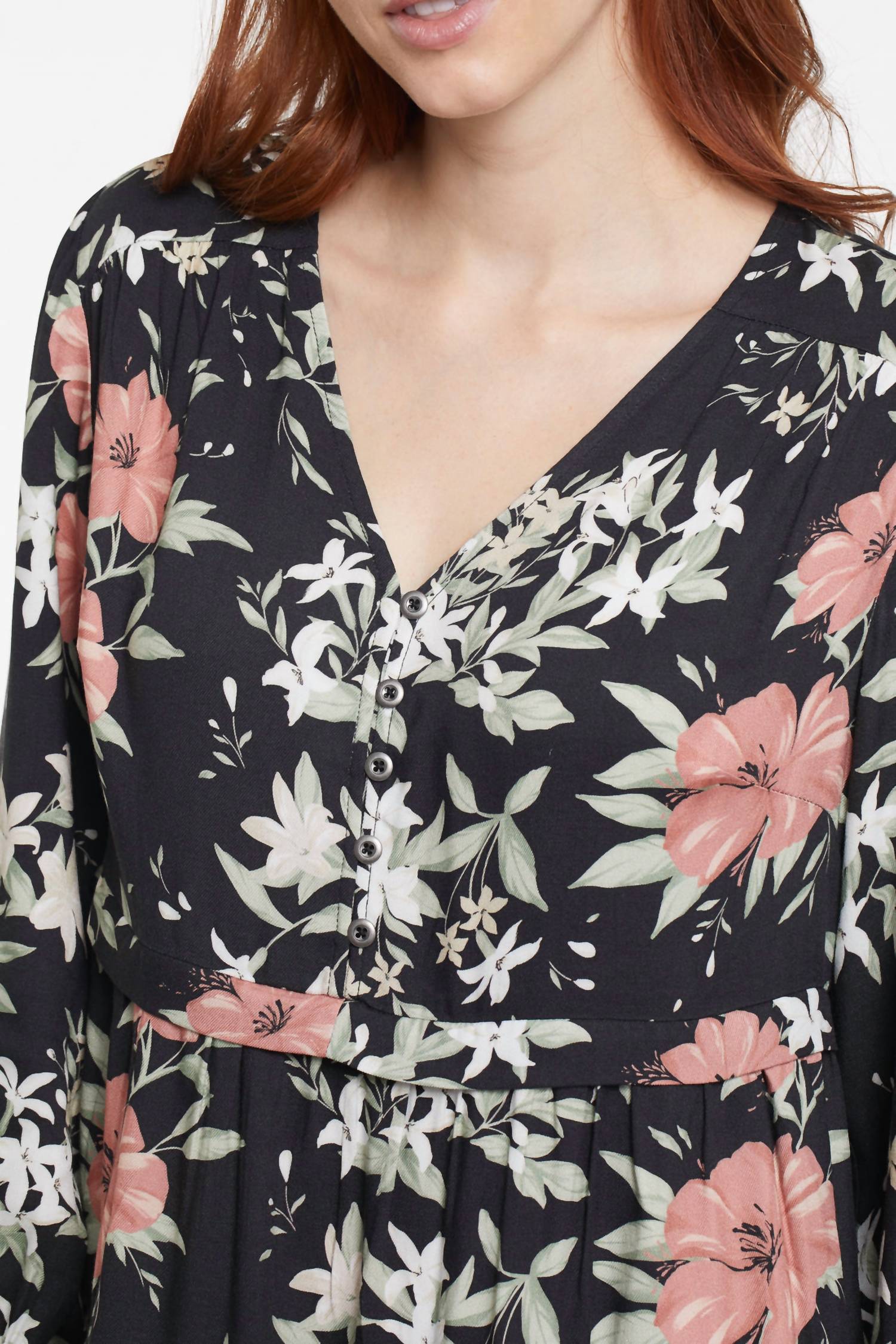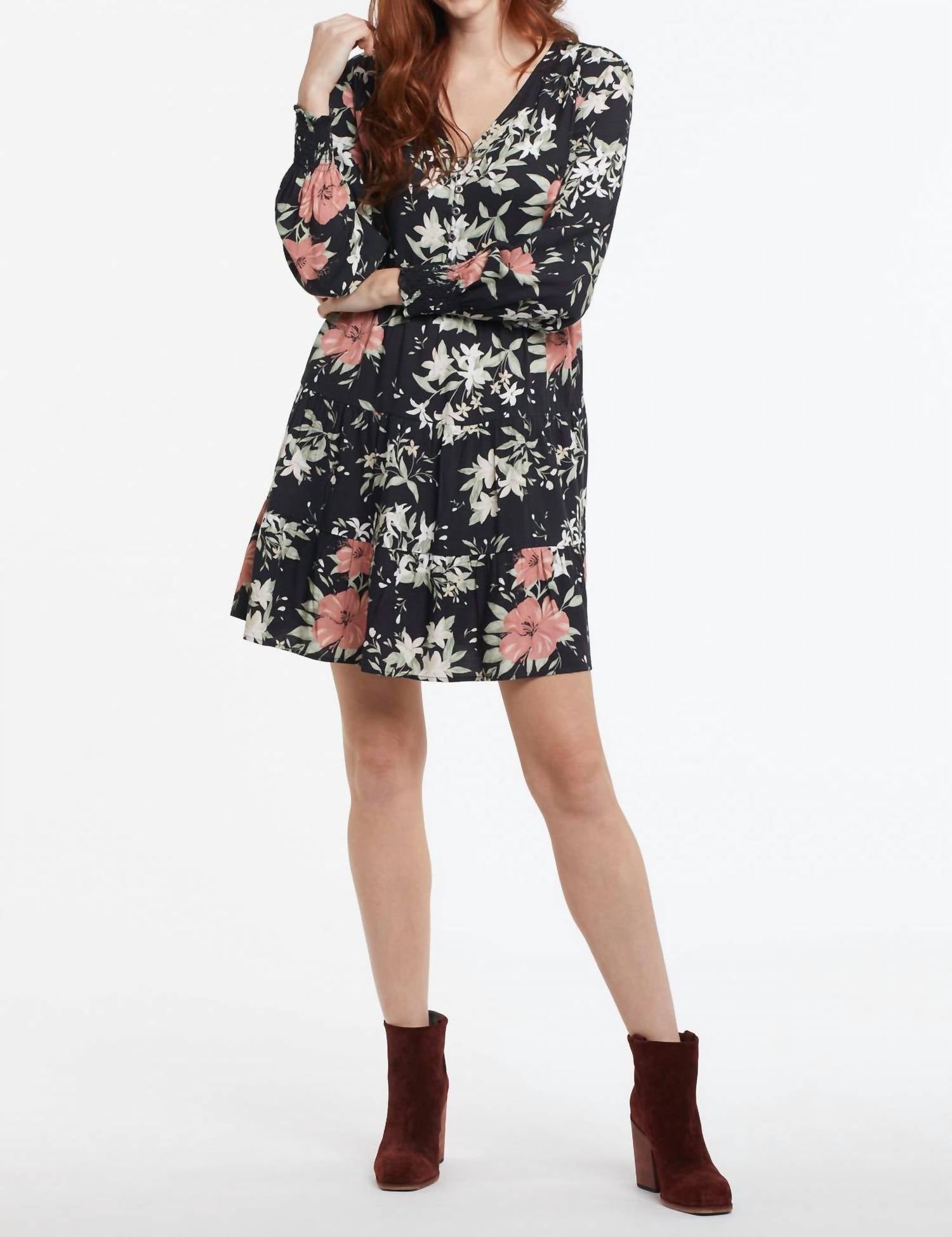 The perfect mini dress for those warmer months. Embrace Boho Chic style with the Long Sleeve Tiered Mini Dress by TRIBAL, perfect for a vacation-ready look in an elegant floral print. This Spring-ready dress is tailored in a feminine A-line silhouette with a flattering V-neckline and crafted from 100% Rayon for lightweight comfort. Designed for ease, it features a pull-on closure and is ideal for Thanksgiving celebrations or any seasonal event. Care instructions include hand washing and line drying to maintain its exquisite charm.