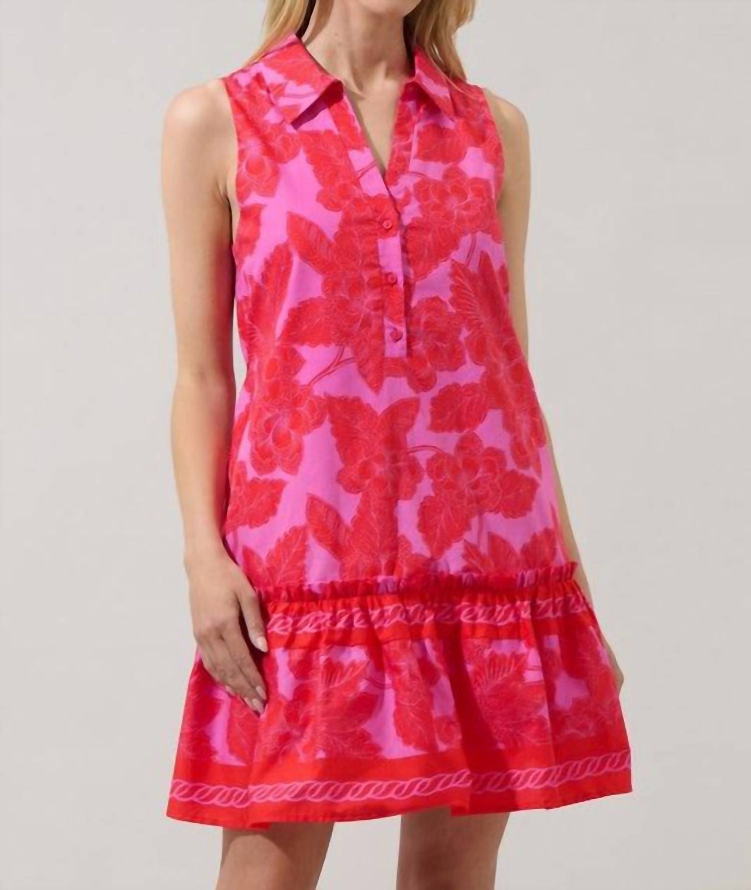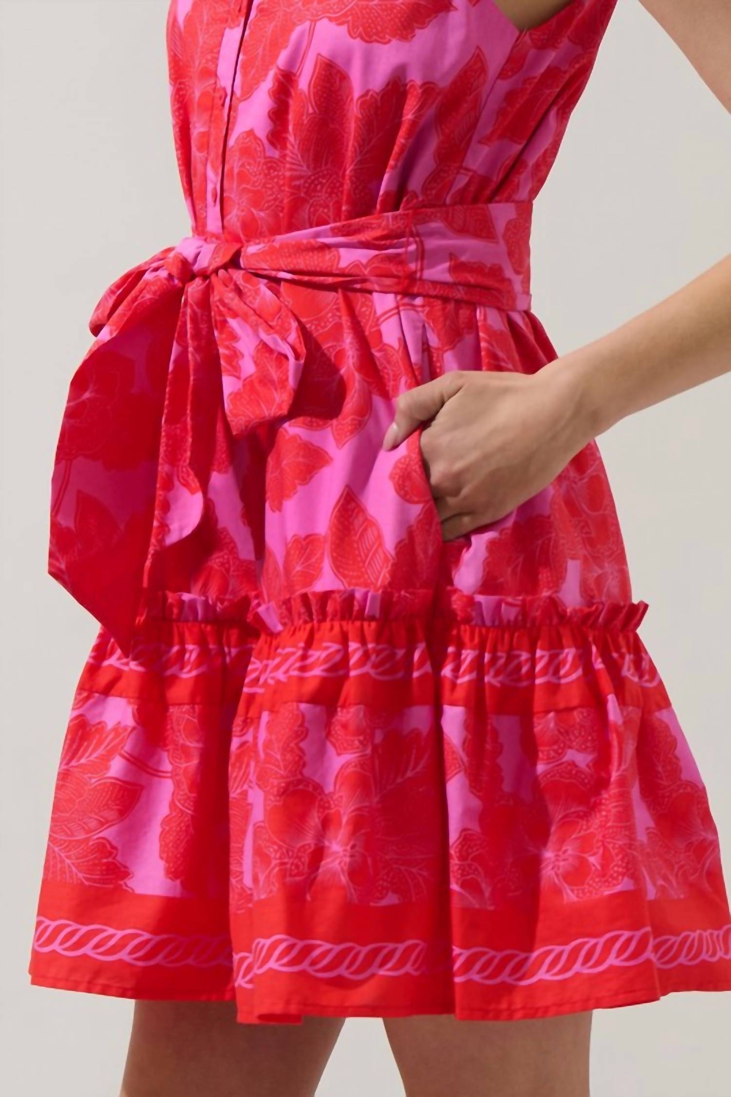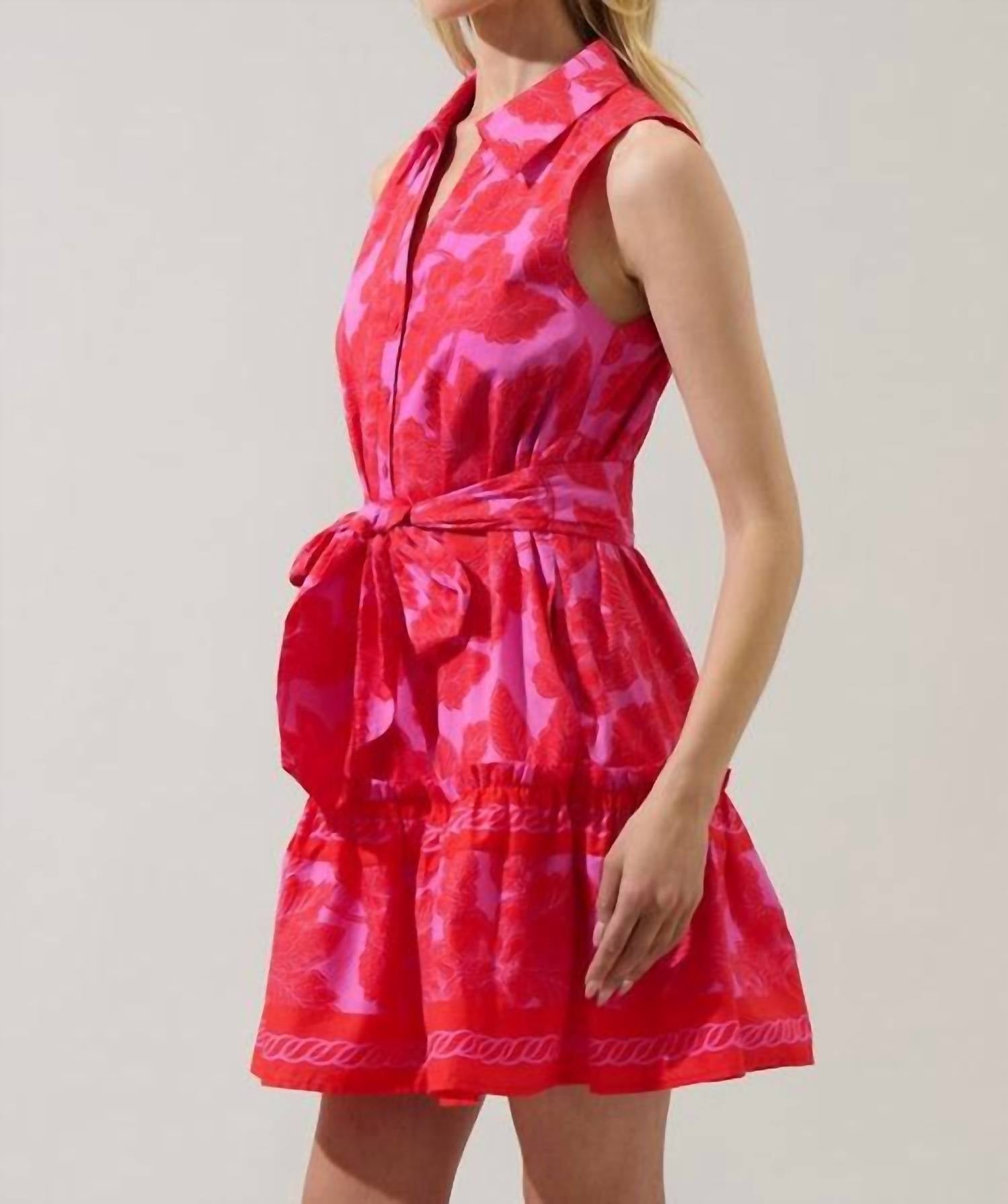 The kind of easy and flattering dress you'll be reaching for all season long. Embrace the charm of the Rency Floral Zady Sleeveless Mini Dress by SUGARLIPS, perfect for a summer occasion. This dress features a sleeveless cut with a vibrant floral pattern in fuchsia red, a button-up front, and a halter neck for a chic silhouette. Its composition in breathable cotton ensures comfort, and the belted waist complements the ruffle mini hem, adding a playful touch. Closure: Button closure. Care: Machine wash and tumble dry. Model is 5'9" and is wearing size XS (Chest: 19 1/4", Length: 35 3/4").