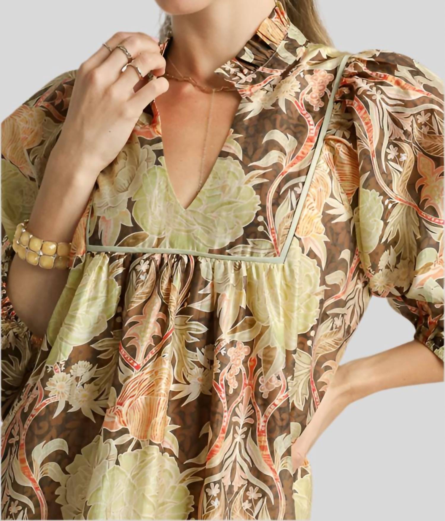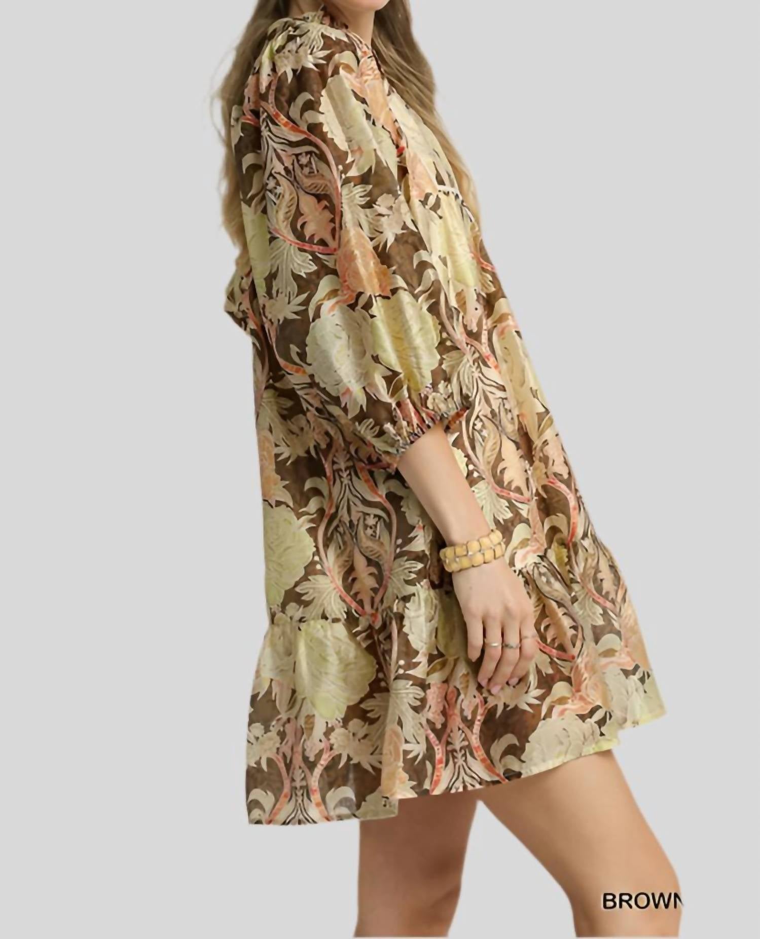 A short and breezy dress for those warmer days. Embrace the spirit of summer with the Women's Bohemian Nights Dress by Umgee, featuring a charming floral pattern. This mini dress showcases short puff sleeves and a split V-neck with ruffle trim, ideal for a breezy vacation look. Designed with a tiered ruffle hem and a relaxed babydoll silhouette, it promises stylish comfort. Closure: Pull on.