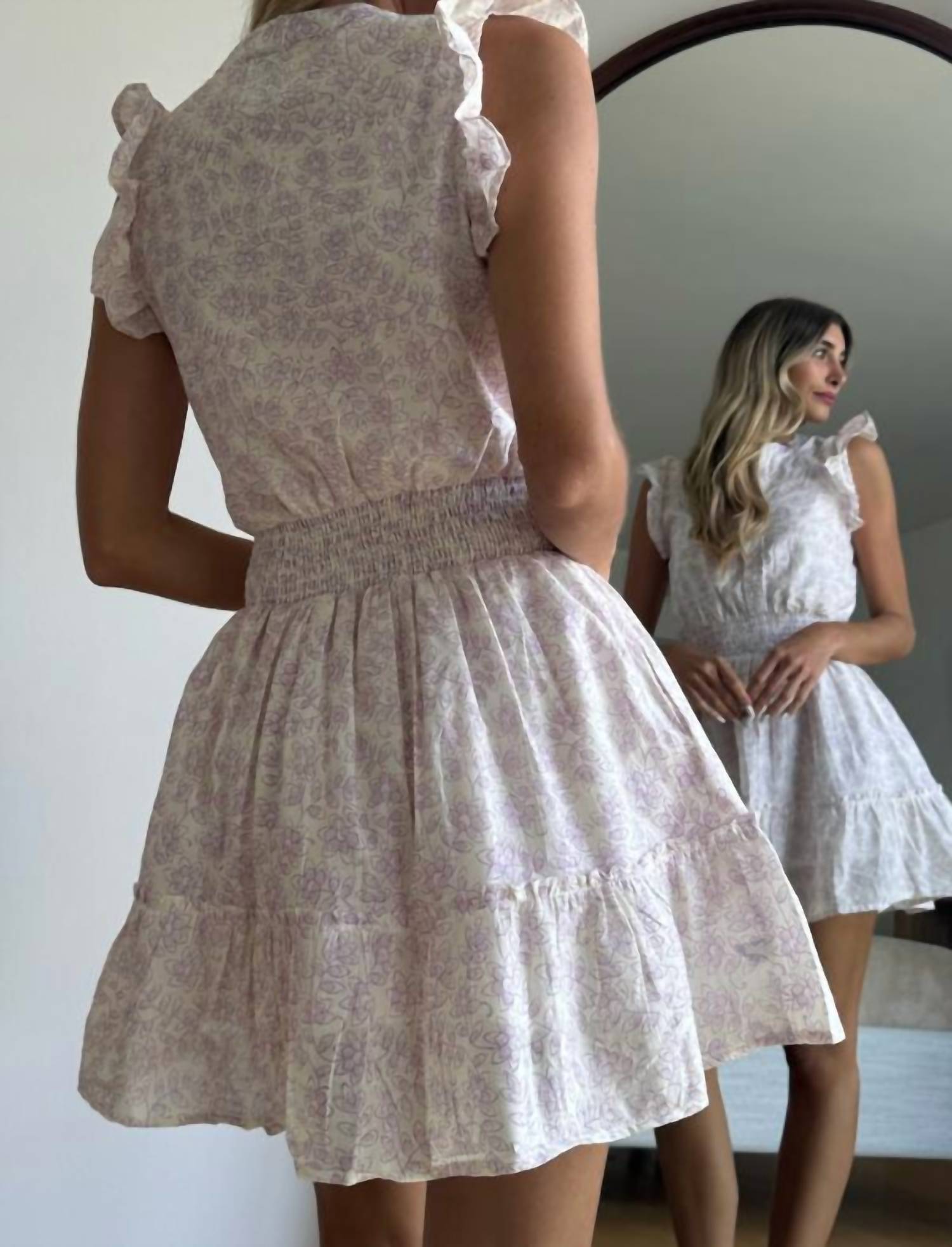 A short and breezy dress for those warmer days. Step into summer with the Lilac Blooms Flutter Sleeve Mini by Mint, crafted for sunny escapades. This sleeveless mini dress is composed of soft cotton and showcases a charming lilac bloom print. It features a flattering smocked waist, a button closure under a chic V-neck, and flutter sleeves that complement the playful ruffle trim. Designed for women seeking a vacation-ready fit-and-flare silhouette, its care instructions suggest hand washing and laying flat to dry.