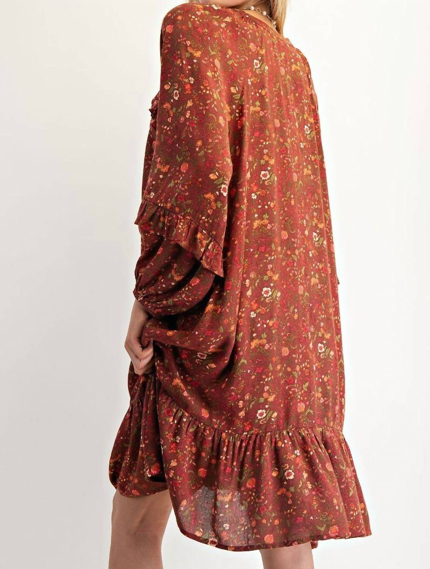 A short and breezy dress for those warmer days. Elevate your fall wardrobe with the Floral Printed Short Dress by Easel, featuring a vibrant all-over floral pattern in a stylish Chestnut hue. This above-the-knee mini dress showcases a flowy babydoll silhouette with long balloon sleeves and a V-neckline accentuated by a front tie. With a pull-on closure, it's crafted for effortless wear and movement, making it ideal for boho-chic vacation outings and Thanksgiving celebrations. Care instructions are simple: hand wash and line dry. Small measurements: 37.75" length, 22.5" bust.