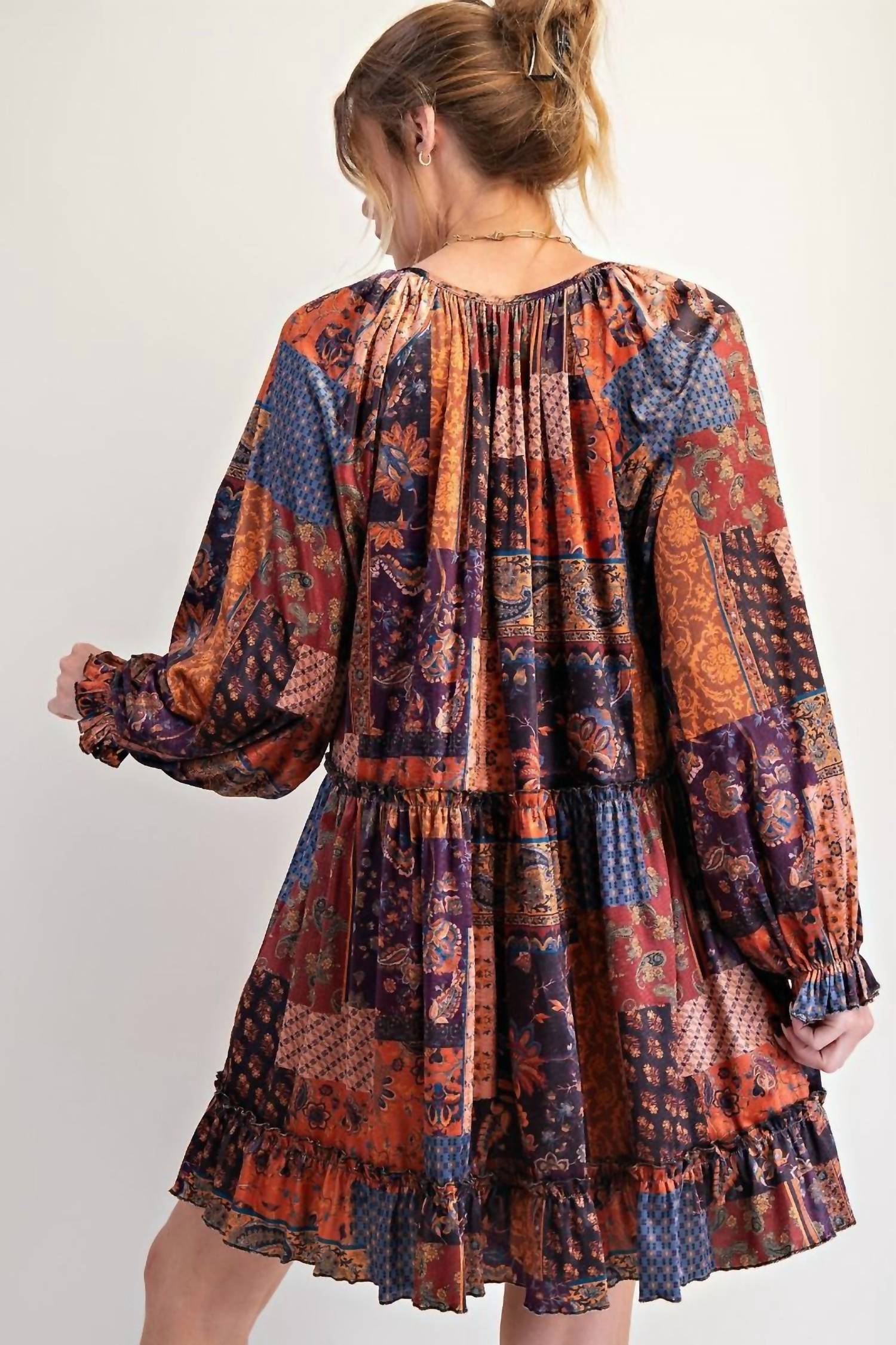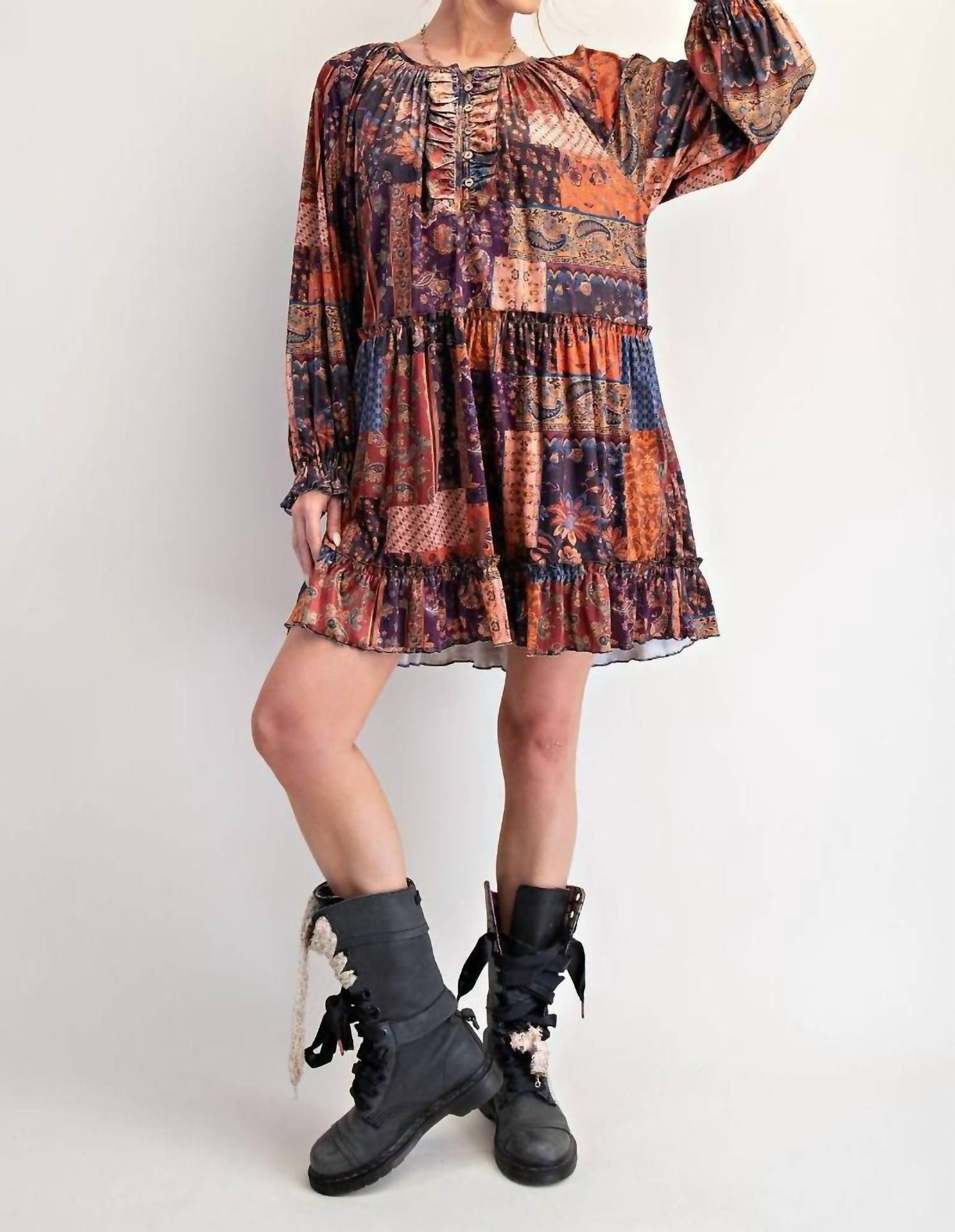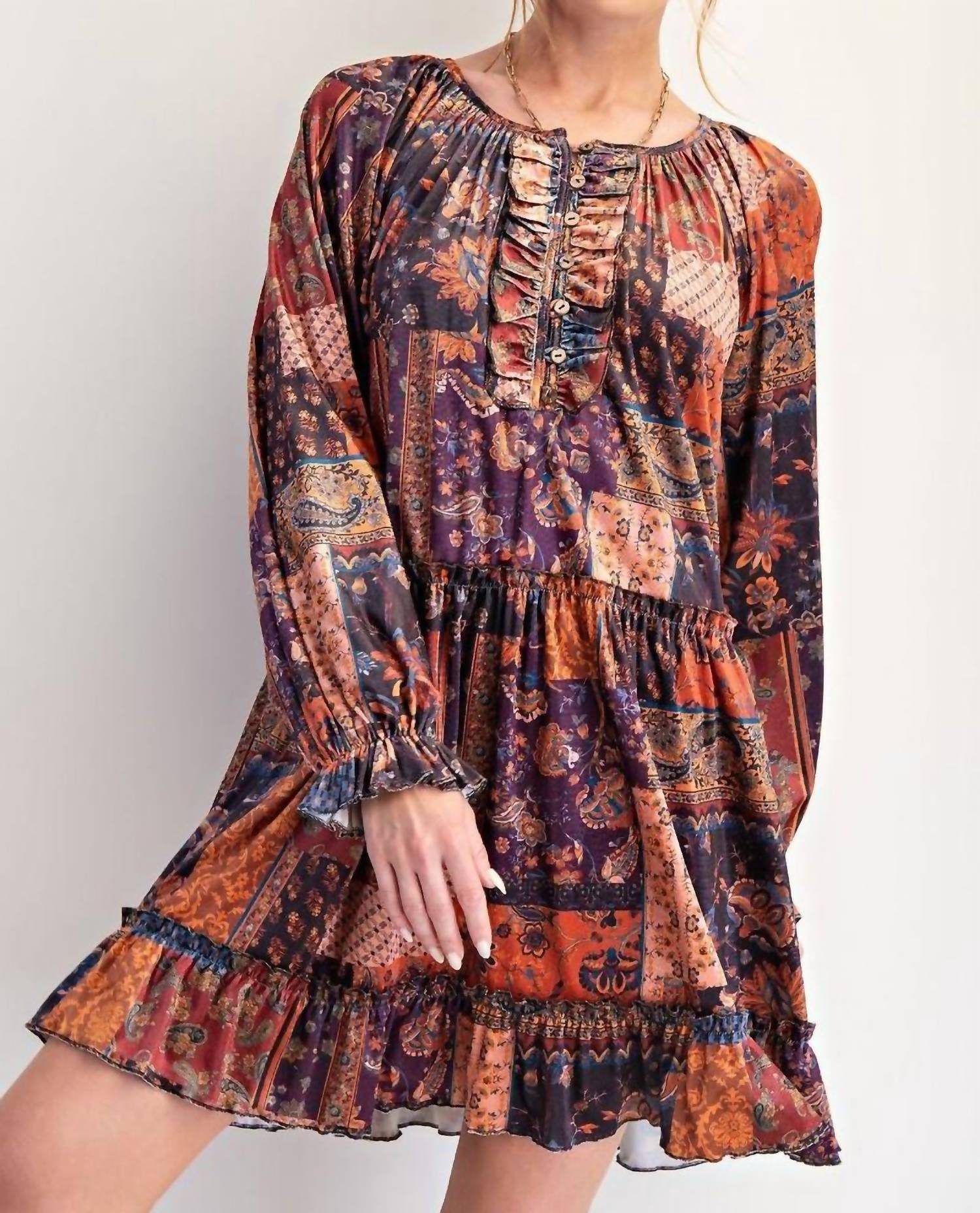 The kind of easy and flattering dress you'll be reaching for all season long. Introducing the Patchwork Printed Velvet Mini Dress by Easel, a bohemian blend of vibrant multi-color patches designed for a standout style. This long sleeve dress features a flattering babydoll silhouette with a flowy ruffled hemline and button closure accents for a touch of vintage charm. With a petite fit measuring 33.5" in length and 21.5" in bust, this kaftan-style dress effortlessly combines comfort with contemporary trends. Care: Machine wash and tumble dry, ideal for a chic summer vacation wardrobe.