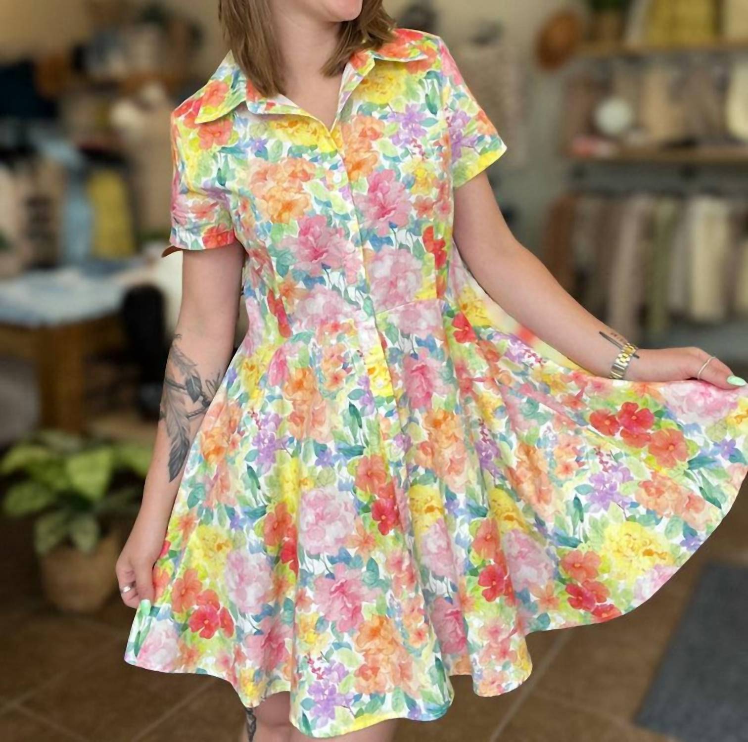 The perfect mini dress for those warmer months. Meet the Women's Color Me Happy Dress by Heyson, a vibrant choice for those who enjoy standing out. This multi-colored mini dress features a watercolor floral pattern and a stylish A-line silhouette with a button closure for a flattering fit. With short sleeves and a collared neckline, it's crafted for summertime strolls and vacation adventures. Embrace its easy, breezy appeal with your favorite sandals for any sunny occasion.