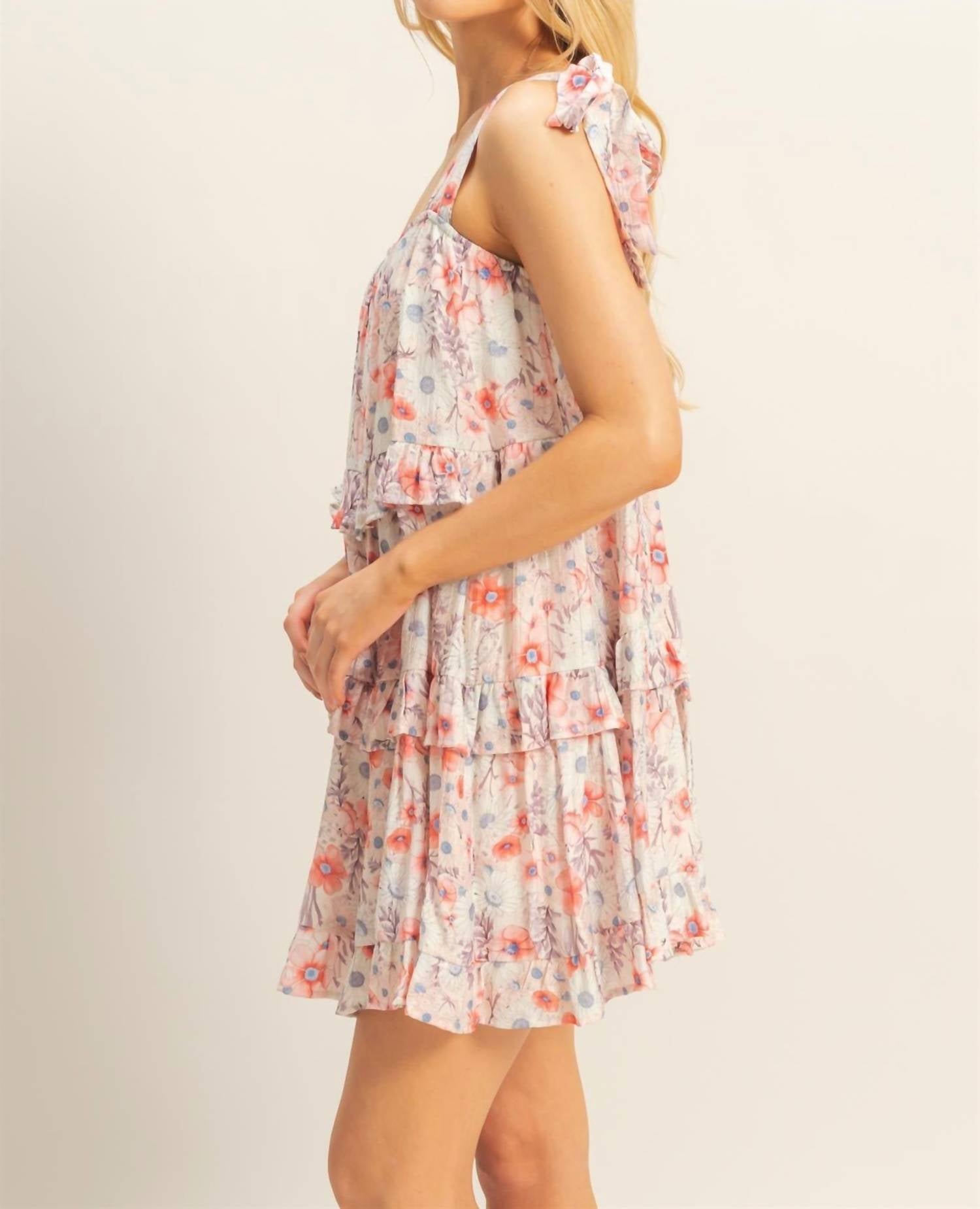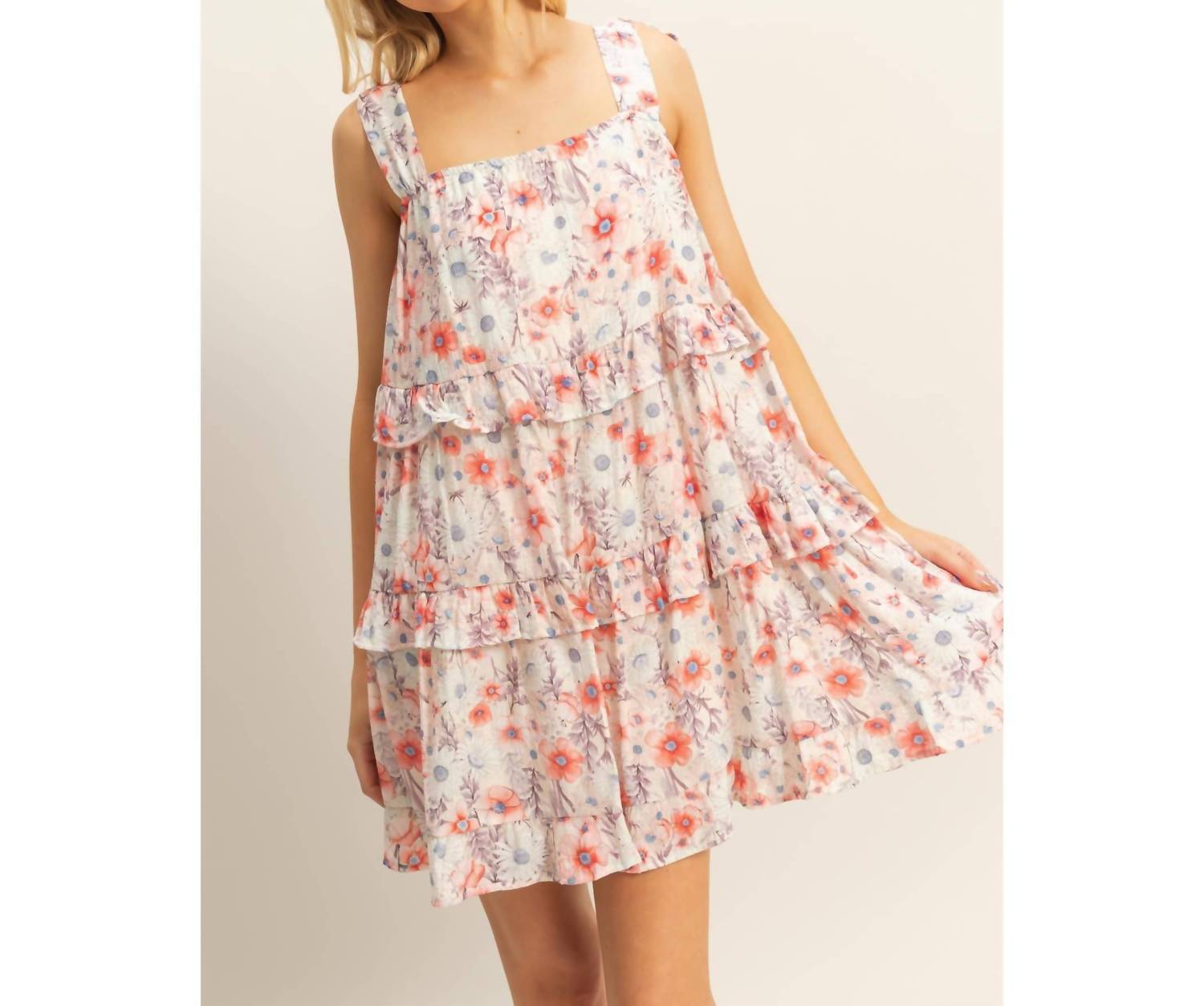 A short and breezy dress for those warmer days. Embrace summer vibes with the London Floral Tiered Mini Dress by HYFVE, a Boho Chic essential. This coral A-line dress features a sleeveless design with adjustable tie straps and a feminine squareneck, making it perfect for any dinner party. The floral print adds a cute touch, while its relaxed fit ensures comfort. Made with a full lining, this pull-on style dress is effortlessly versatile.