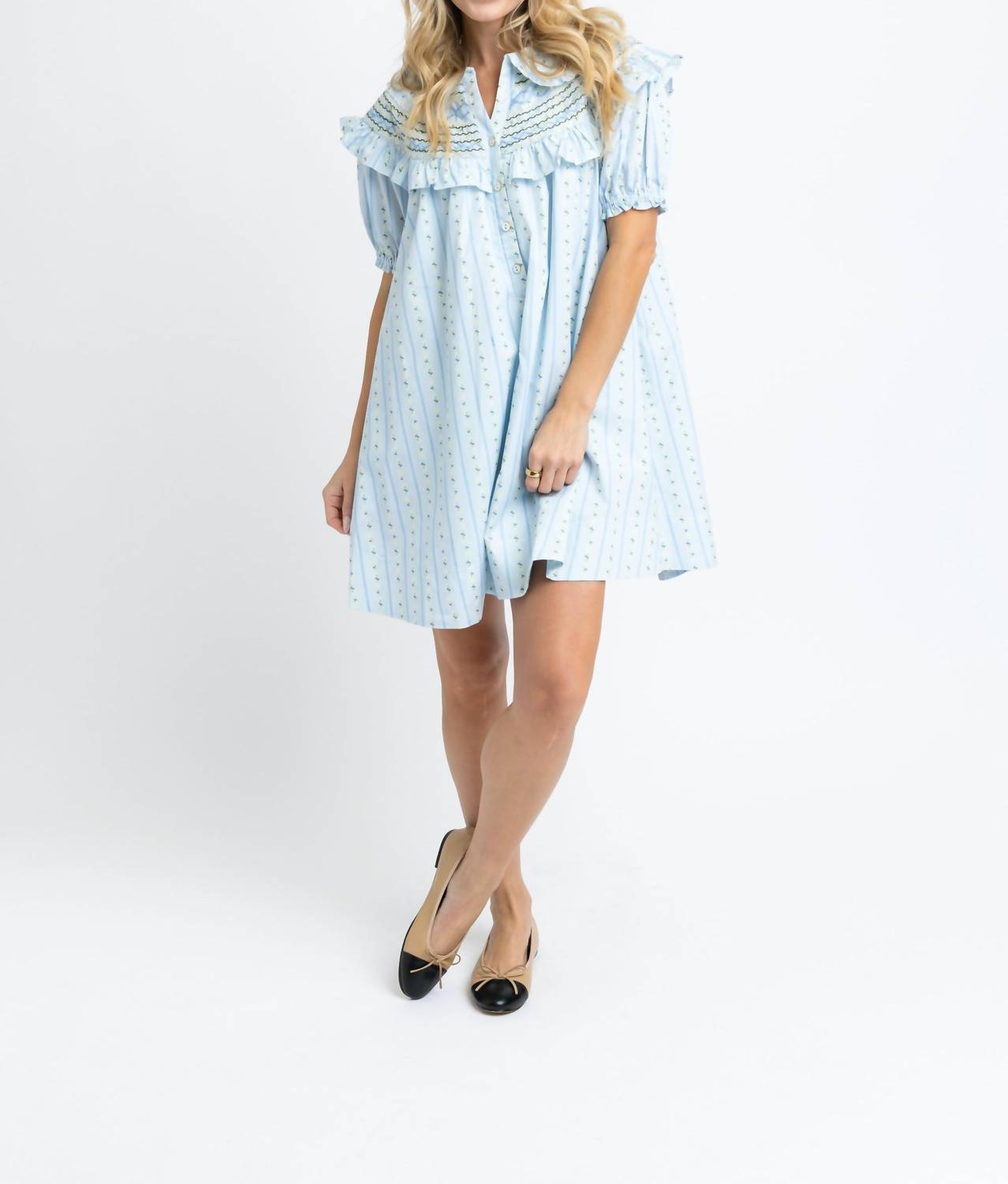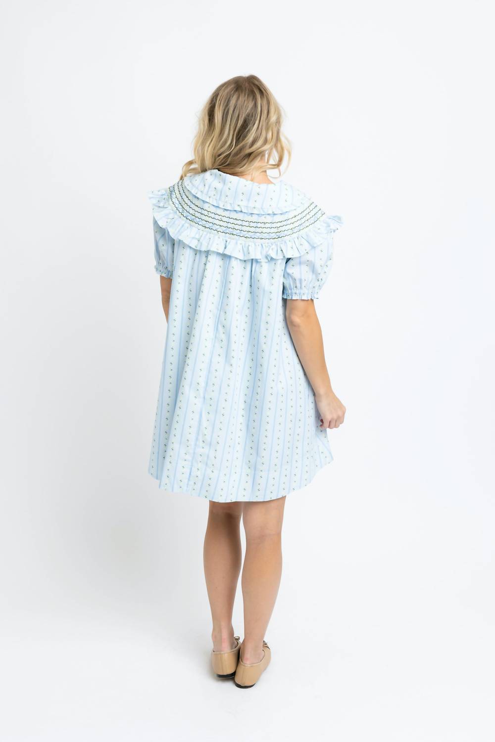 A short and breezy dress for those warmer days. Introducing the Juliette Peter Pan Stitch Dress by Karlie in baby blue blossom stripe, perfect for adding whimsy to your spring wardrobe. It features short puff sleeves with an elastic cuff and a charming ruffled Peter Pan collar. With its comfortable shift silhouette and front button closure, this above-the-knee dress is both stylish and functional. Care: Machine wash. Ideal for occasions like a baby shower or holiday events such as the 4th of July.