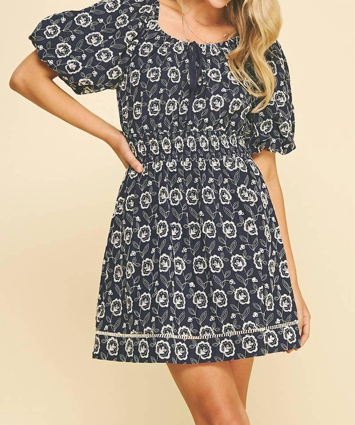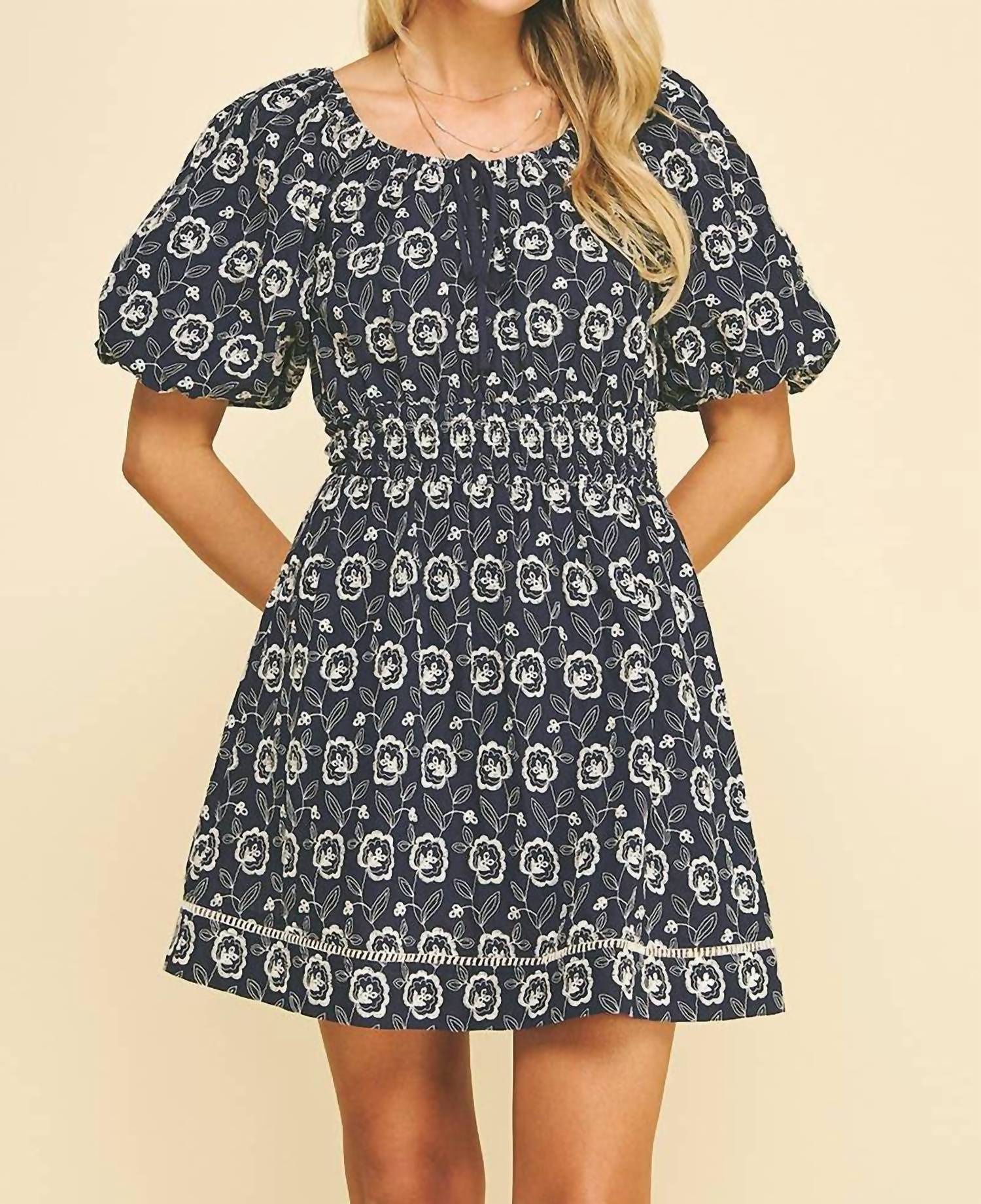 A short and breezy dress for those warmer days. Introducing the Floral Embroidered Mini Dress by PINCH, perfect for adding boho chic flair to your spring wardrobe. This navy dress features whimsical balloon short sleeves and a tie detail at the scoop neck, crafted from 100% cotton for a comfortable fit. Its A-line silhouette and smocked waistband offer a flattering shape, enhanced by floral embroidery and eyelet detailing. Closure: Pull on. Care: Hand wash, lay flat to dry. This dress, effortlessly elegant and ideal for occasions like baby showers, will make a stylish statement.