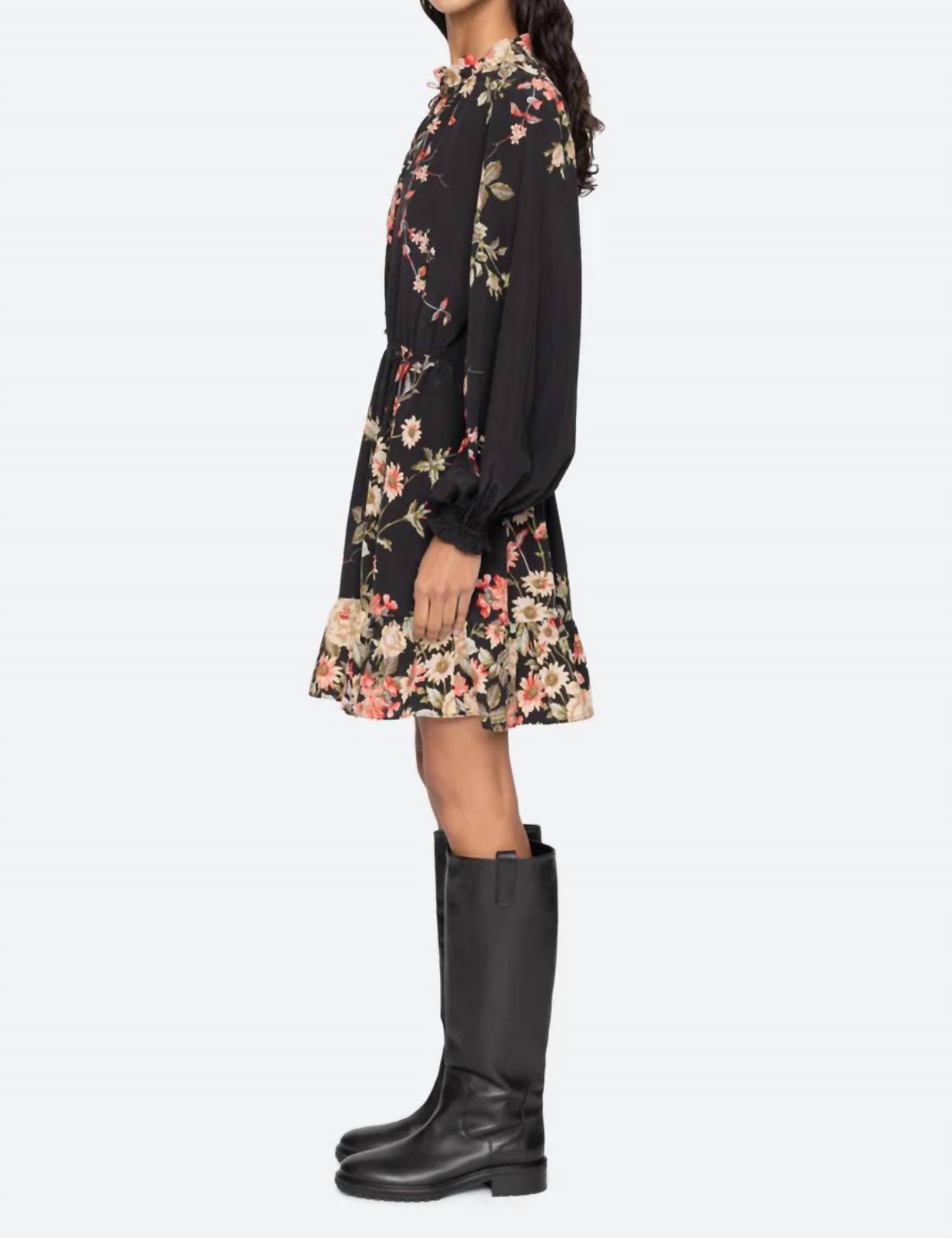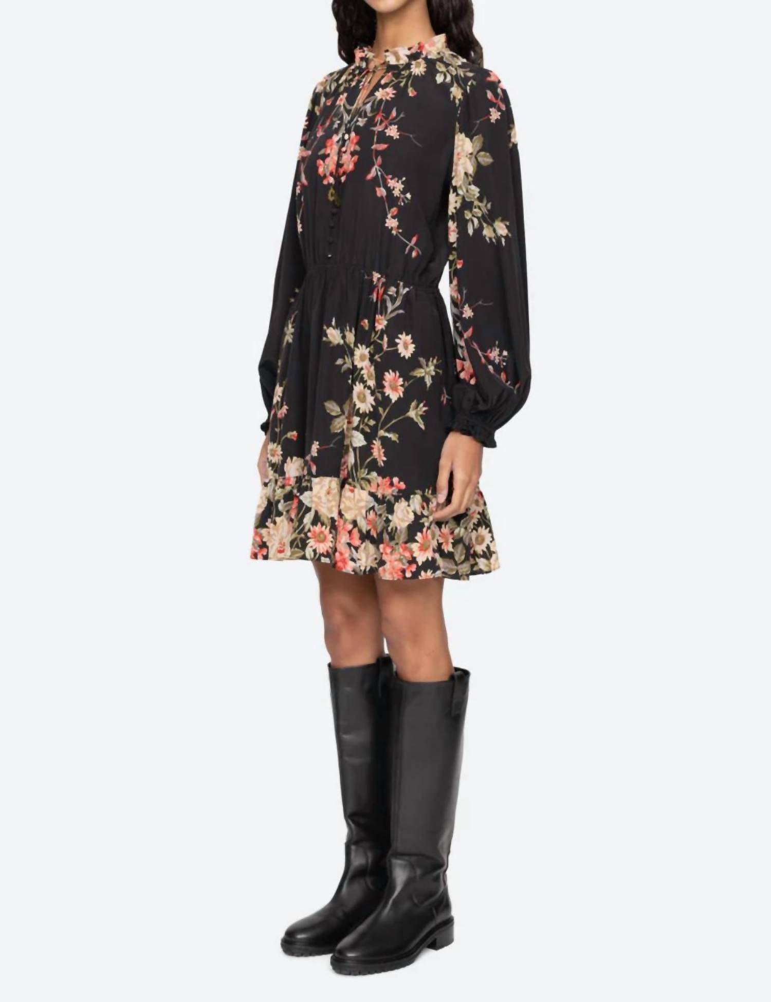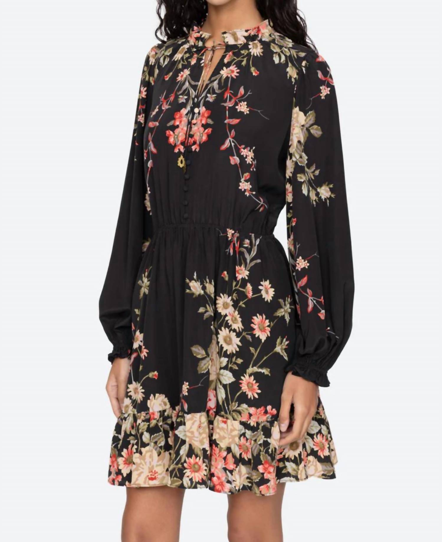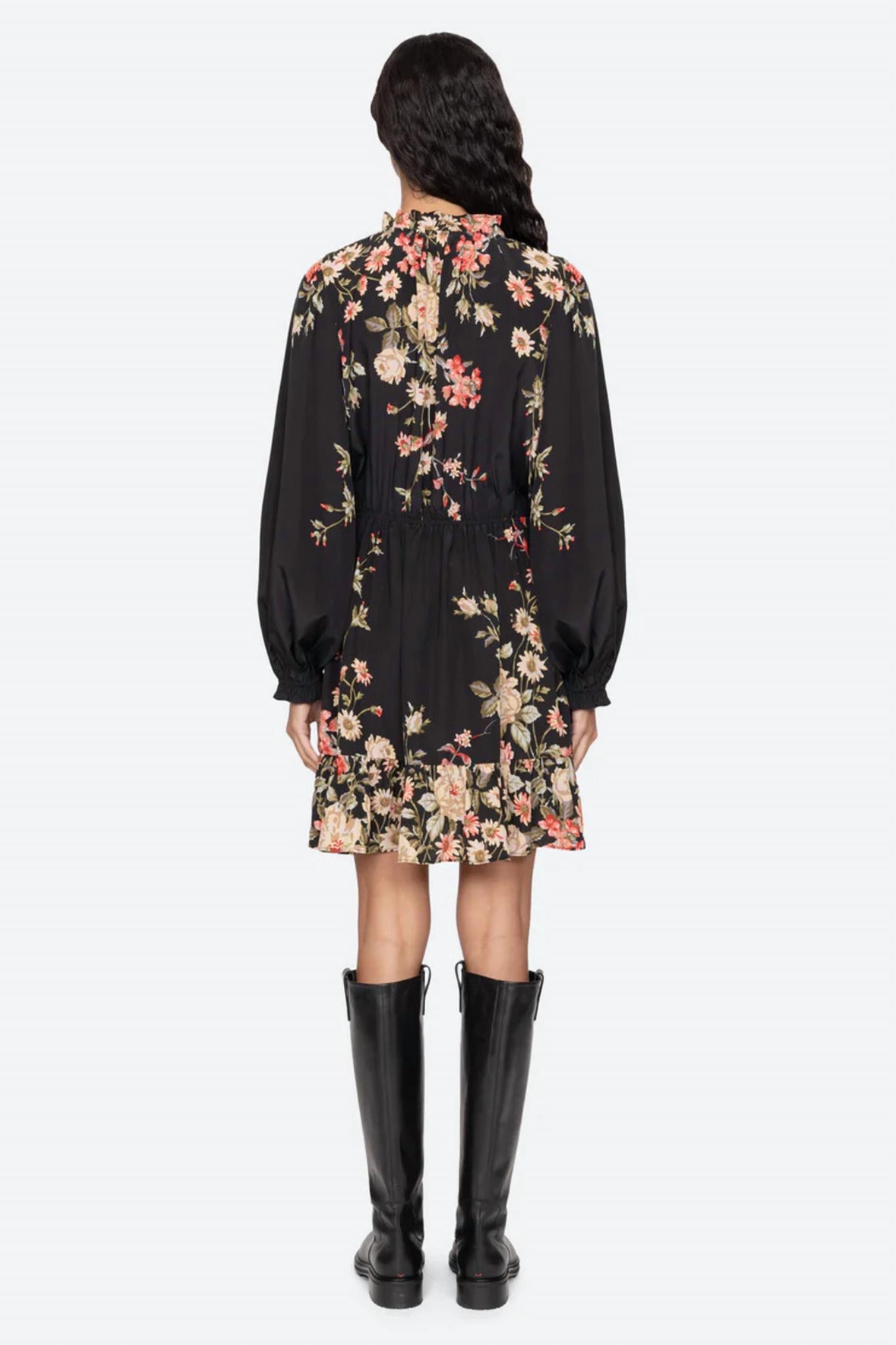 The perfect mini dress for those warmer months. Step into elegance with the Jolie Mini Dress by SEA in a chic multi-black floral print, perfect for fall dinner parties or Christmas gatherings. Featuring long voluminous puff sleeves, this boho chic piece is crafted from a luxurious blend of 65% viscose and 35% silk, with a 100% viscose lining. Originating from China, the dress showcases a vintage-inspired sheath silhouette, accentuated by a front tie closure adorned with tassel charms. Care for this exquisite piece by dry cleaning only. Model is 5'10'' and wearing a size S.