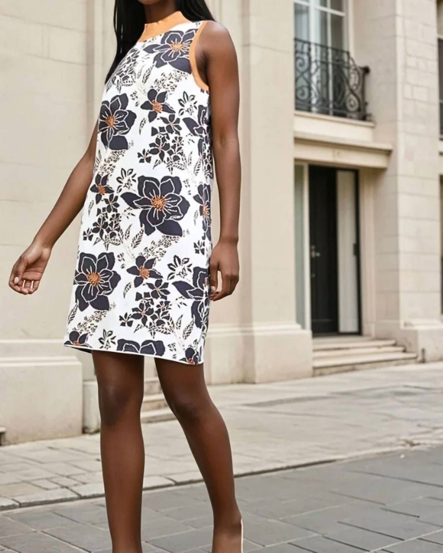 A short and breezy dress for those warmer days. Introducing the Roberta Mock Neck Floral Print Dress by SKIES ARE BLUE, a charming addition to any wardrobe. This sleeveless mini dress boasts a sophisticated mock neckline and a delightful floral pattern on a knit material, perfect for spring occasions. It features a convenient pull-on closure and offers ease of care with machine wash instructions. The ivory color and minimalist trend make it a versatile choice for dinner parties or daytime outings, effortlessly blending modern style with timeless elegance.