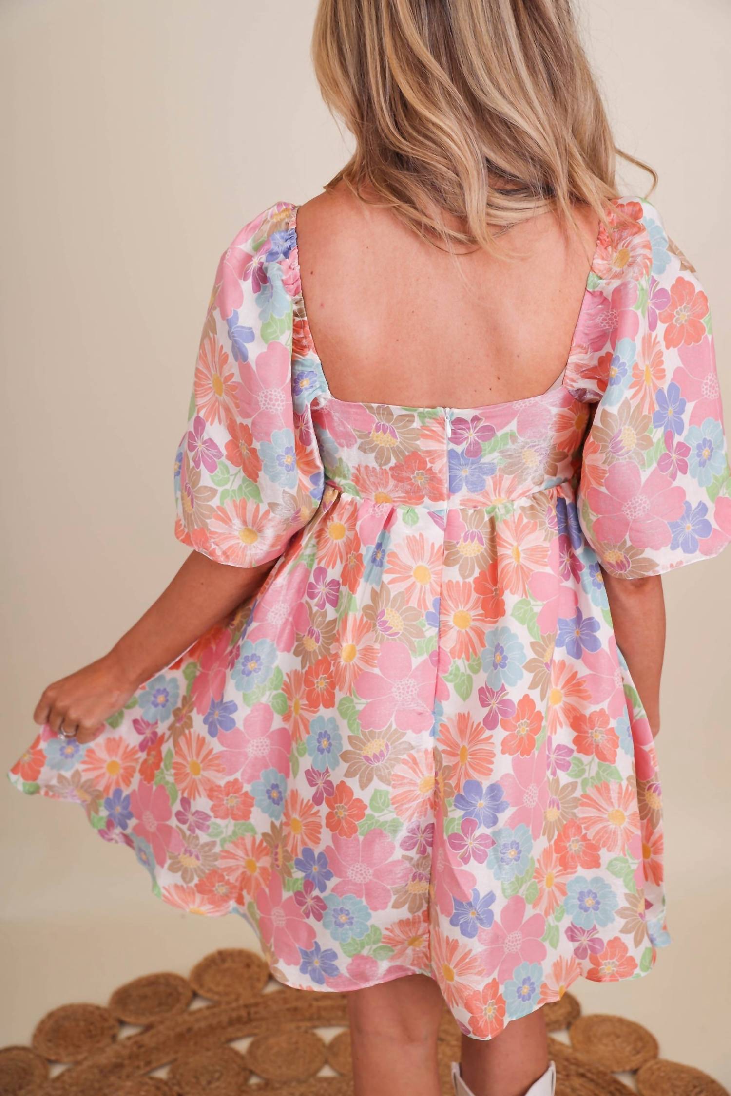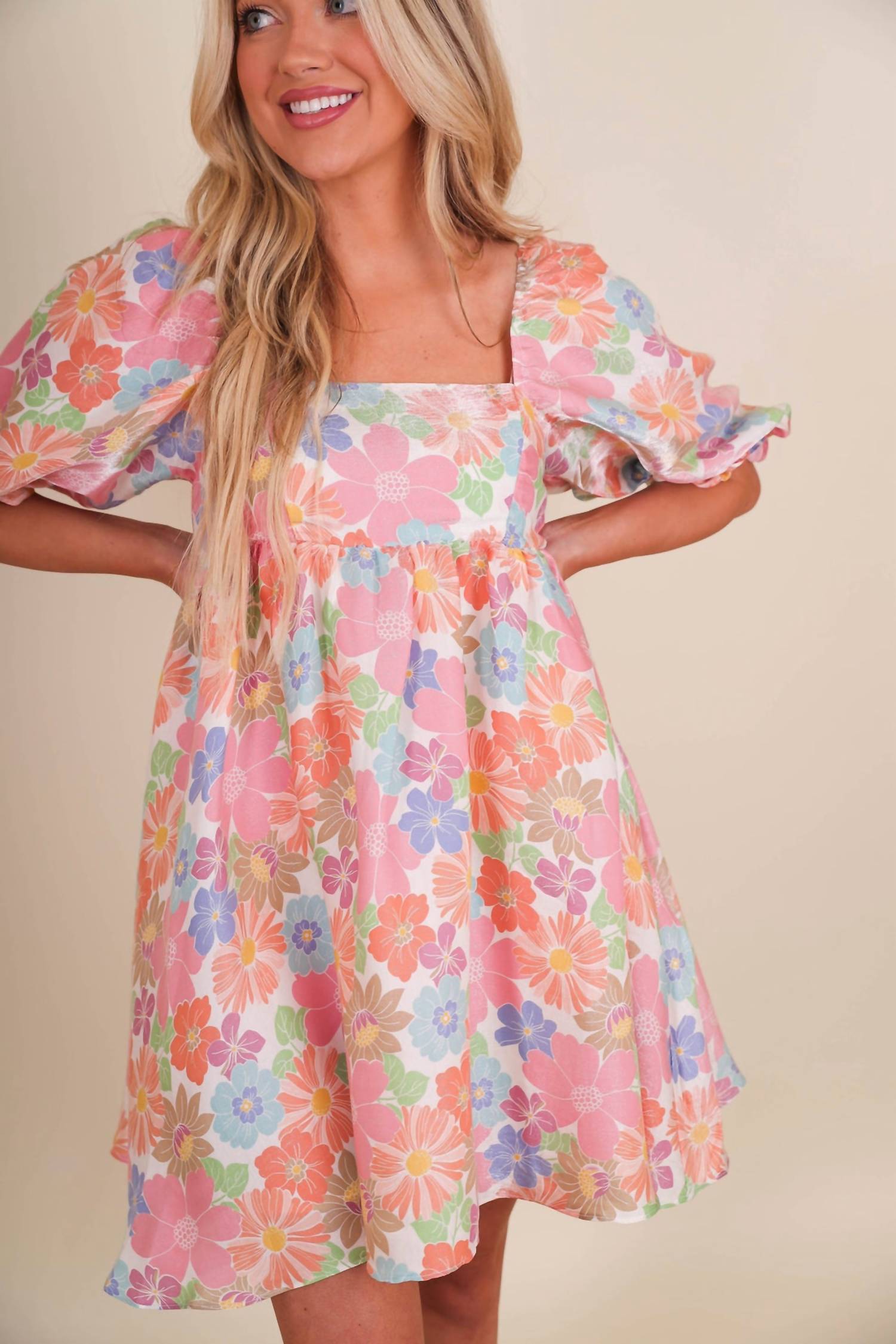 The perfect mini dress for those warmer months. Embrace a boho chic vibe with the Wildflower Fields Babydoll Mini Dress by STORIA, featuring short puff sleeves and a vibrant floral print. This shift silhouette dress boasts a charming smocked design with mini ruffle details for an effortlessly lovely look. Crafted from 100% polyester, it offers a squareneck and a convenient zip closure. Care Instructions: Dry clean for best results. Perfect for festive occasions such as a Thanksgiving holiday party.