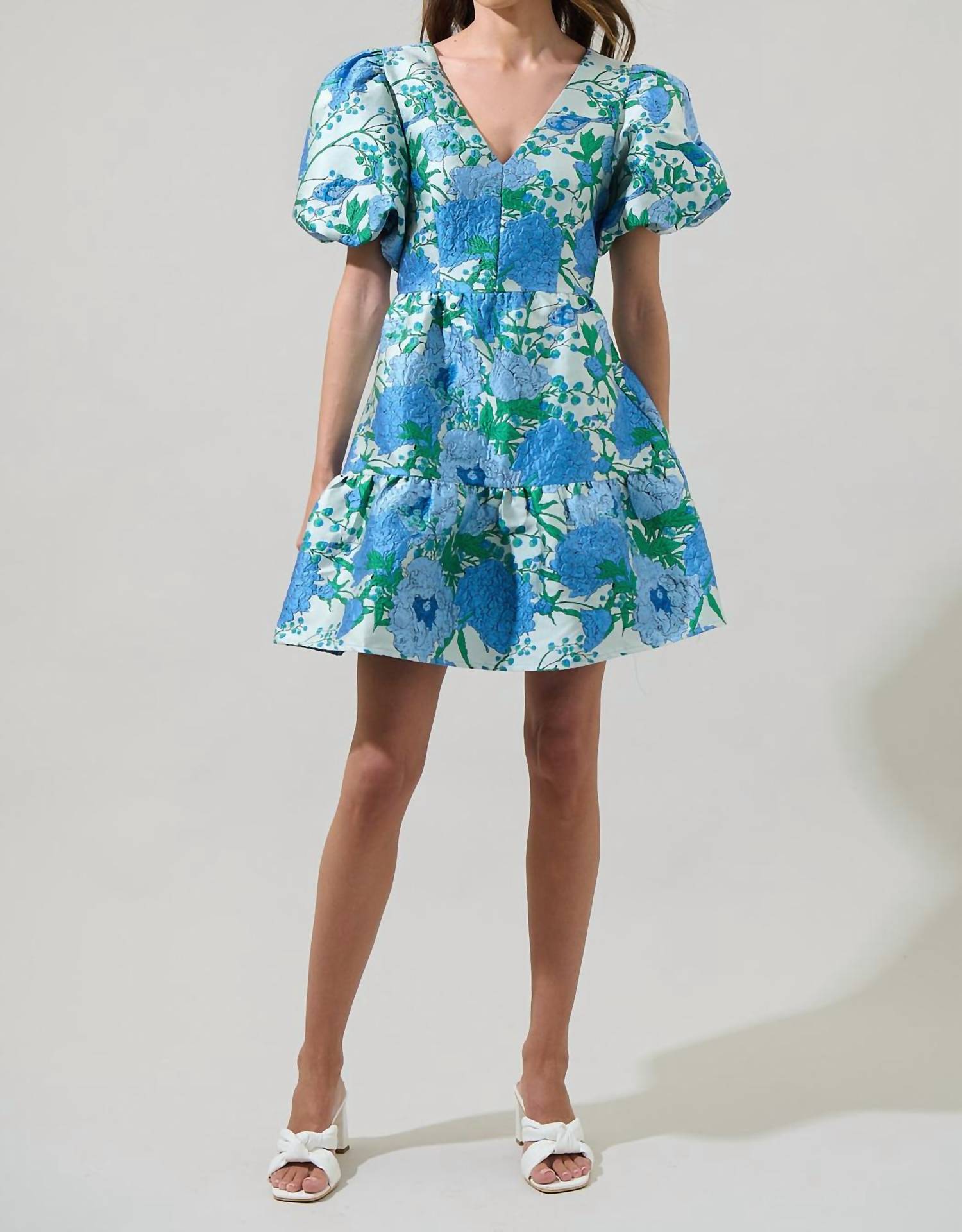 The kind of easy and flattering dress you'll be reaching for all season long. Introducing the Willa Floral May Jacquard Tiered Mini Dress by SUGARLIPS, a striking piece that elevates any wardrobe. This dress features short puffy sleeves and a v-neckline, crafted with a textured jacquard floral pattern in white and blue. Made from 100% polyester with a lining of 97% polyester and 3% spandex, it offers a flattering 34" mini length. Designed with an open back, the dress incorporates a tie string and zip closure for a chic silhouette. Models a fit of chest 16 1/2" and length 34" when measured in size S.