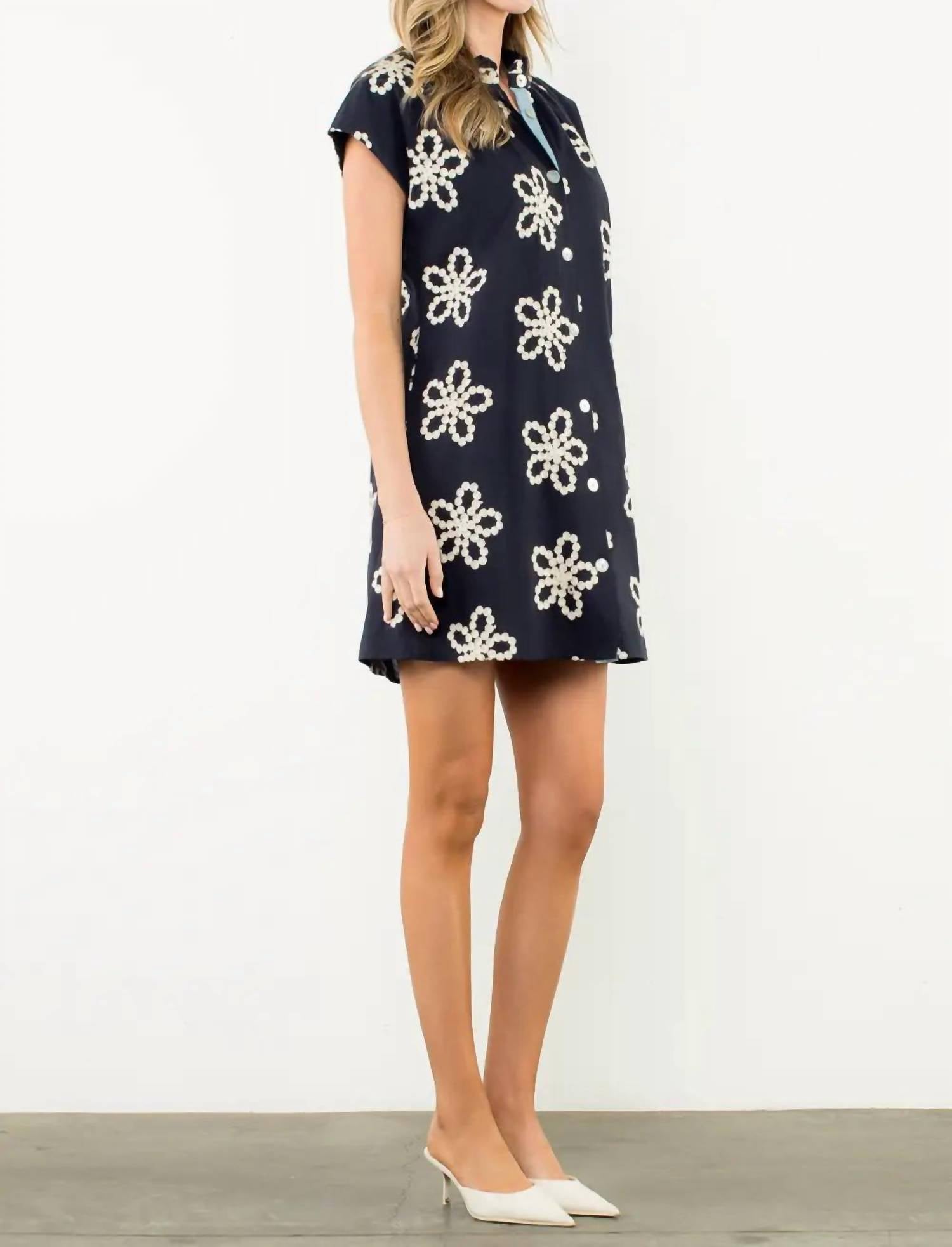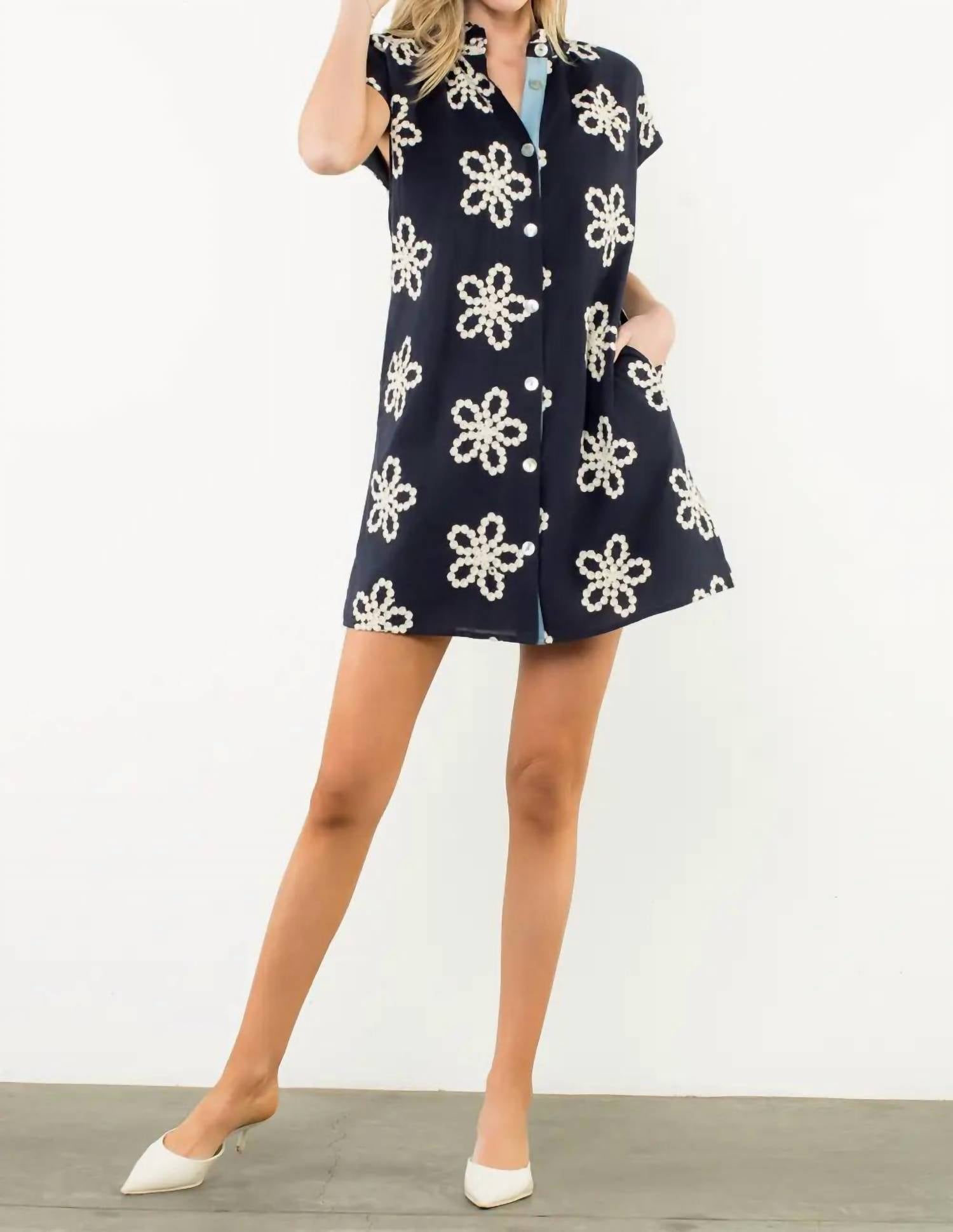 The kind of easy and flattering dress you'll be reaching for all season long. Meet the Dana Embroidered Mini Dress by THML, a boho chic piece perfect for any holiday party. This navy shift dress features intricate floral embroidery, a ruffle collar, and cap sleeves for a delightful spring look. With a practical button closure, this dress is crafted with convenience in mind, including pockets for added functionality. Care for this women's dress is effortless with machine wash and lay flat to dry instructions.