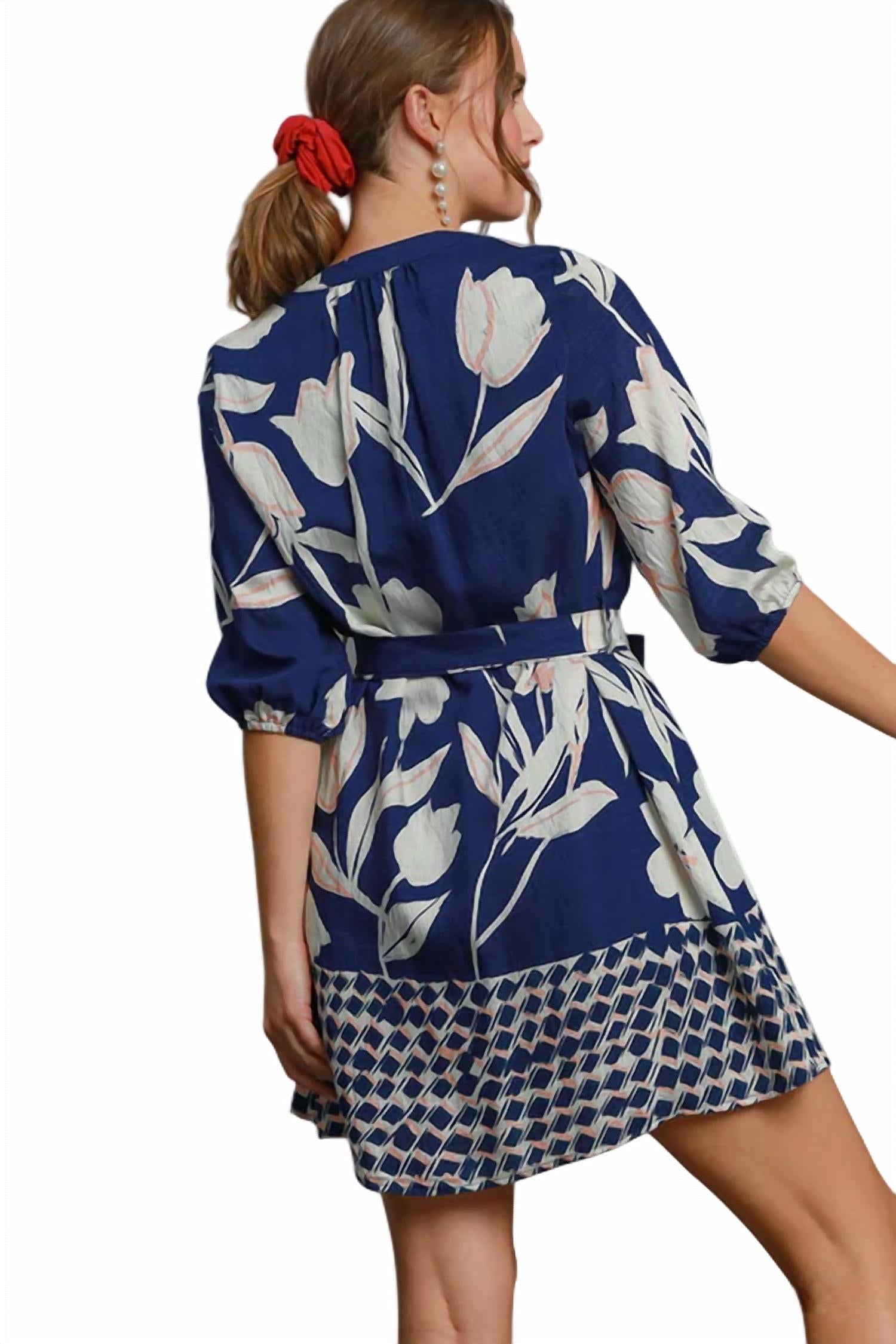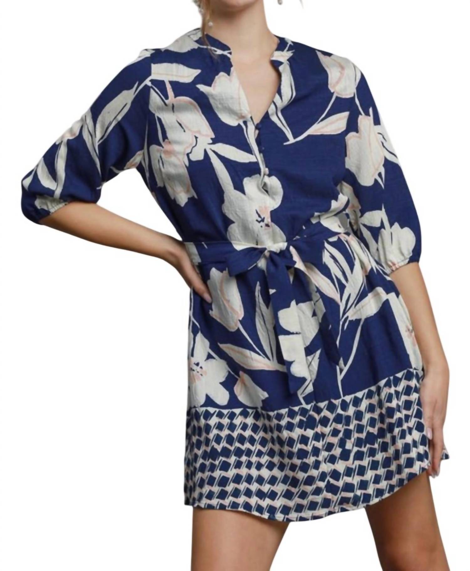 A short and breezy dress for those warmer days. Elevate your spring wardrobe with the Nicole Floral Belted Dress by Umgee, perfect for holiday parties and more. This navy mini dress features a charming floral pattern and a flattering A-line silhouette with a V-neckline and three-quarter sleeves. Crafted from a 70% rayon and 30% nylon blend, it offers comfort and style. Closure: Button closure. Ideal for boho chic enthusiasts, it's a versatile choice for various occasions.