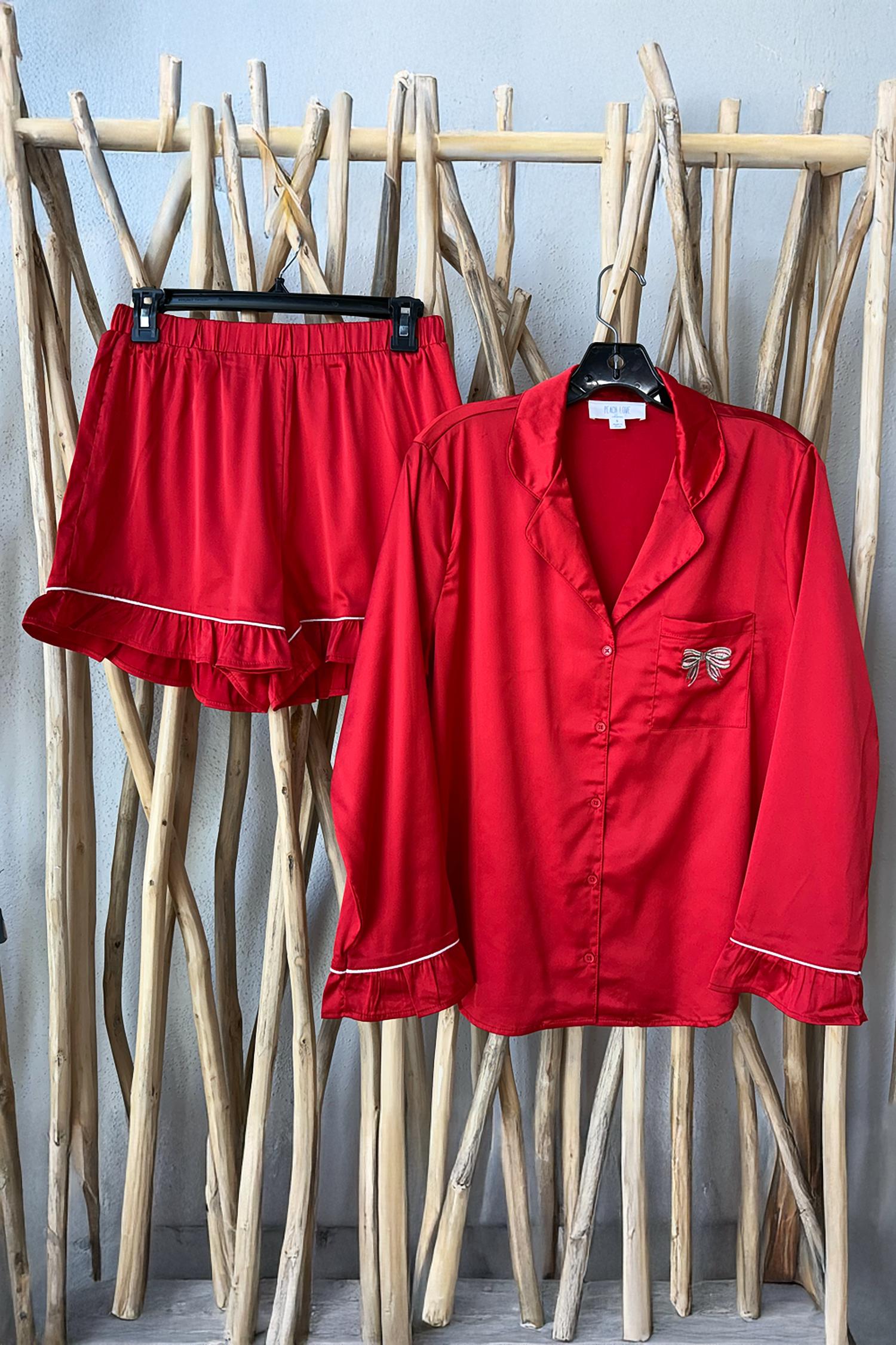 A set so cute you'll never want to take it off. Designed to look good while lounging, this little number is the perfect outfit for hanging at home in style. Experience the perfect blend of festive charm and silky comfort. These smooth satin pajamas are designed for both celebration and relaxation, featuring a soft finish that feels luxurious against the skin. With a relaxed fit ideal for lounging, gifting, or cozy nights in, this set is a seasonal essential that brings a touch of holiday spirit to your nighttime routine.