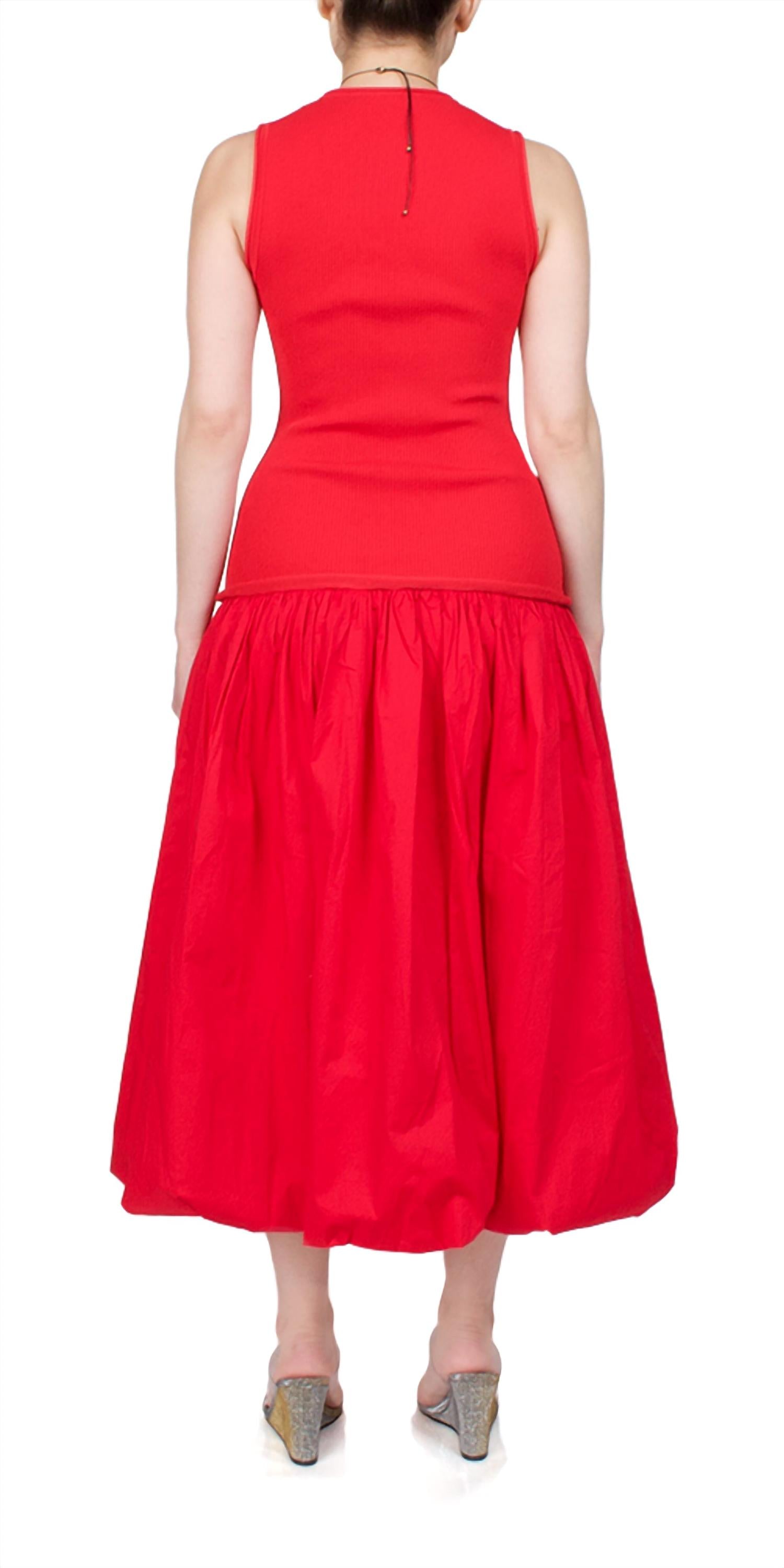 Casual, comfortable and cute! The dress that you'll be reaching for all season long. The SIMON MILLER Yanez Poplin Combo Dress is an elegant addition to any wardrobe with its sleeveless design and striking cherry red hue. This dress boasts a unique combination of a cotton poplin skirt and a smocked knit bodice, offering a flattering drop waist silhouette. Crafted from 59% viscose, 40% nylon, and 1% elastane for the bodice, and 97% cotton, 3% elastane for the skirt, it promises comfort alongside style. Closure: Pull on. It fits true to size with the model standing at 5ft 5in and wearing a size S.