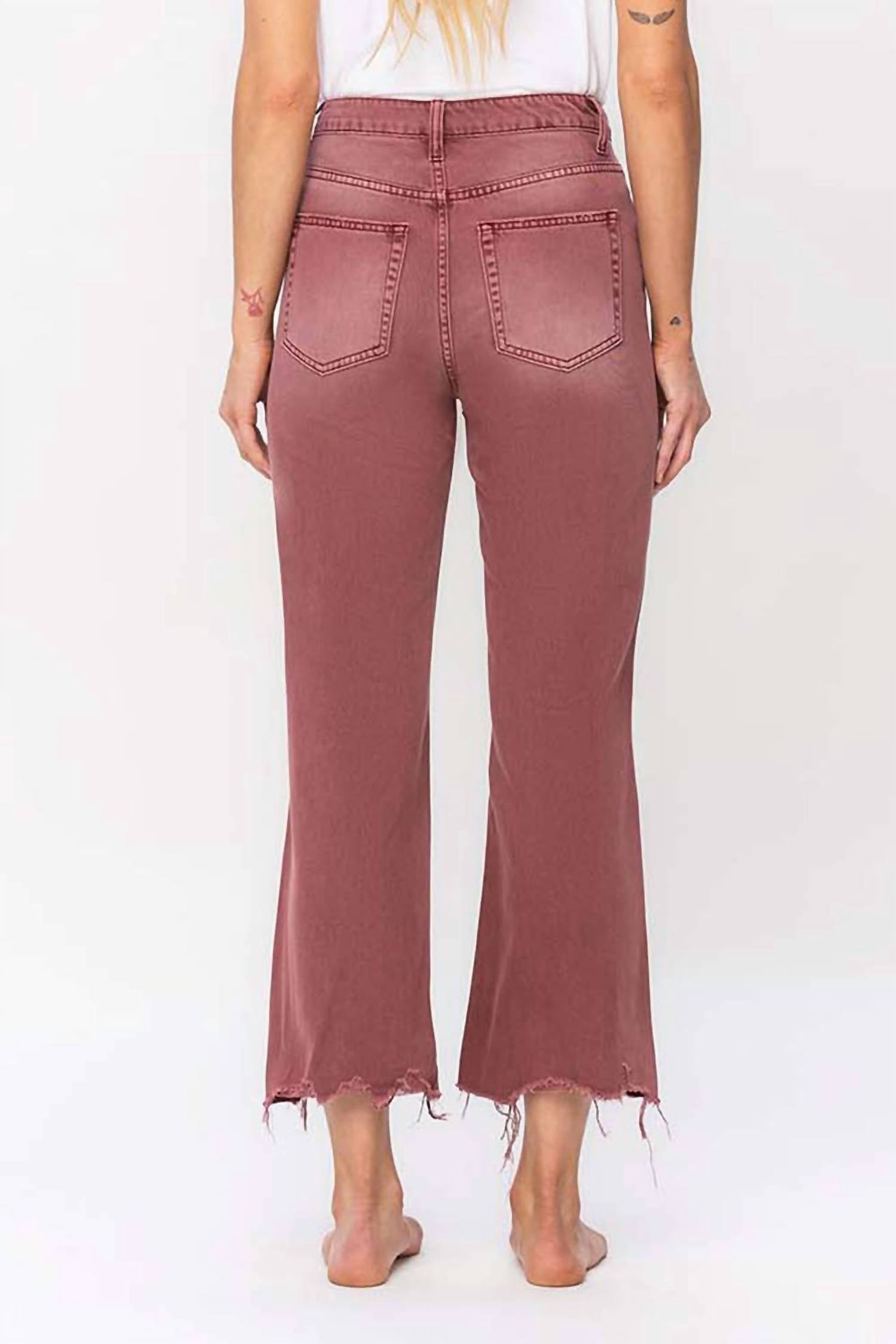 A flattering silhouette that's suprisingly versatile. Unleash your vintage spirit with the High Rise Cropped Flare Distressed Jeans by VERVET BY FLYING MONKEY. Crafted from non-stretch denim, these brown jeans boast a 90's vintage aesthetic with their high waisted, relaxed flared legs and authentic rigid jeans texture. Featuring a zip closure, pockets, and a cropped length with an inseam of 27", these jeans have a front rise of 11 1/2" and a leg opening of 20". Perfect for fall travel, care for these streetwear staples with a simple machine wash and tumble dry routine.