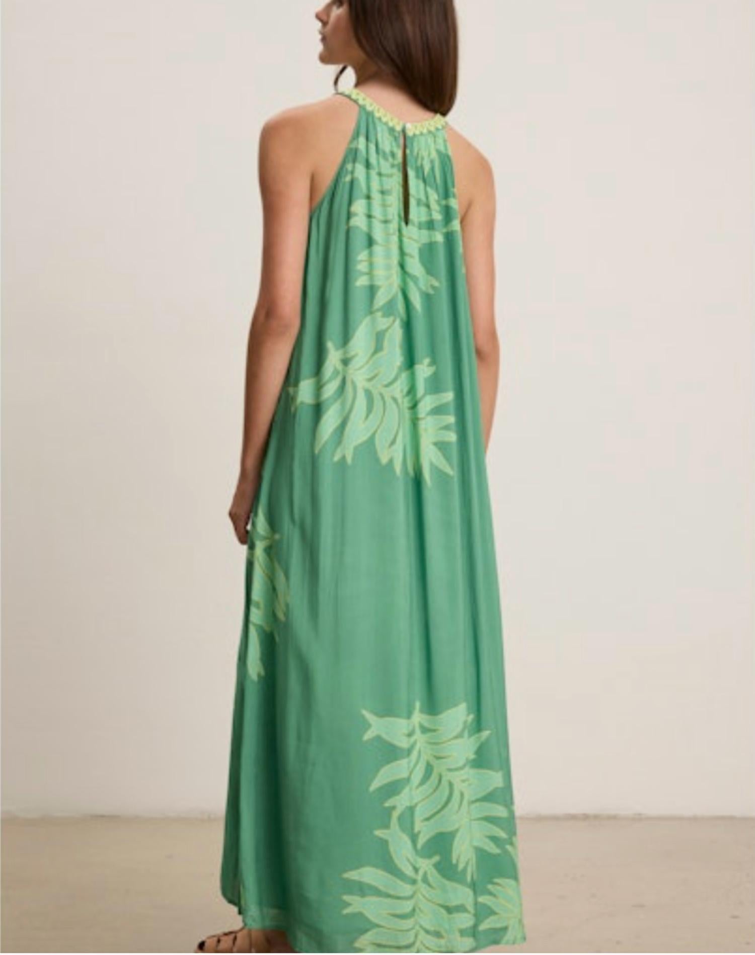 A maxi dress that is just as cute as it is comfortable. Introducing the Odessa Halter Maxi Dress by Velvet by Graham & Spencer, a stunning green piece perfect for your spring wardrobe. This sleeveless maxi dress is crafted from 100% cotton, made in India, and features a halter neckline with exquisite embroidery detailing. It includes a detachable belt to define the waist and allows ease of movement with pleat detailing in its fully lined design. The dress is finished with a keyhole pull-on closure and requires hand washing and line drying.